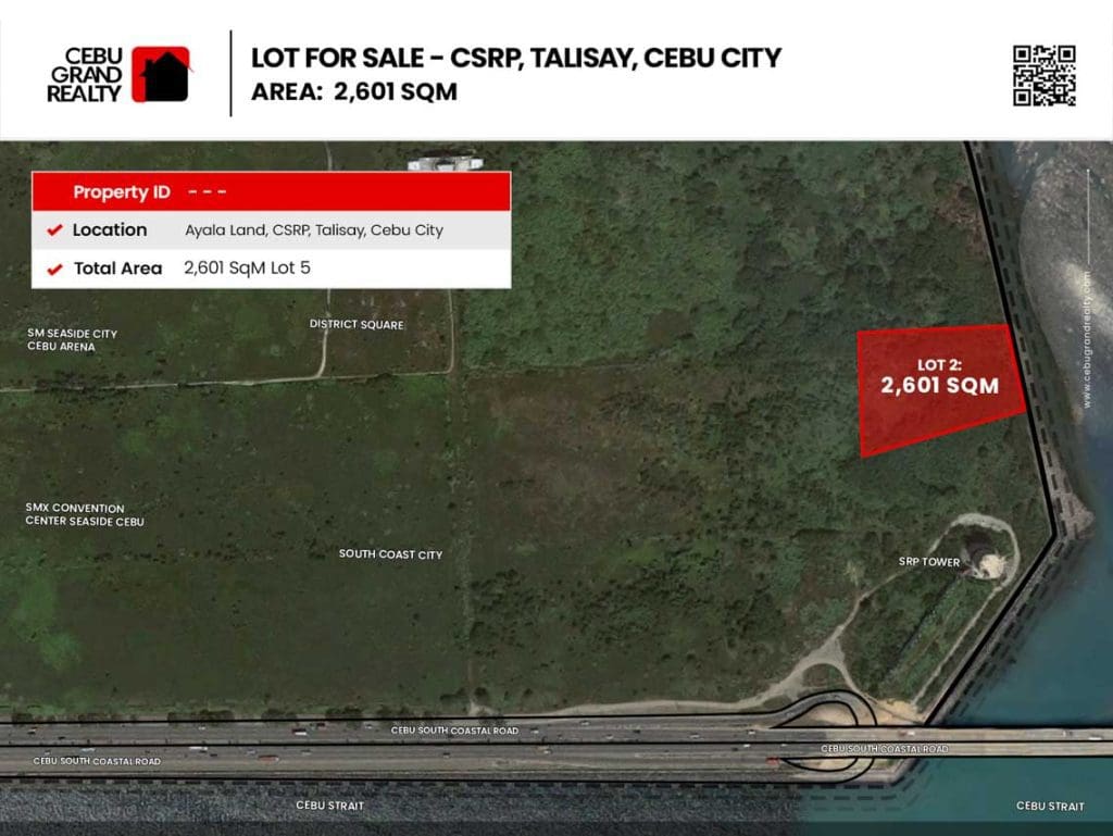 South Coast City fronts the Cebu Strait and is situated at the main entrance of South Road Properties (SRP). It is accessible via the Cebu South Coastal Road and nearby Cebu Cordova Link Expressway (CCLEX) bridge.