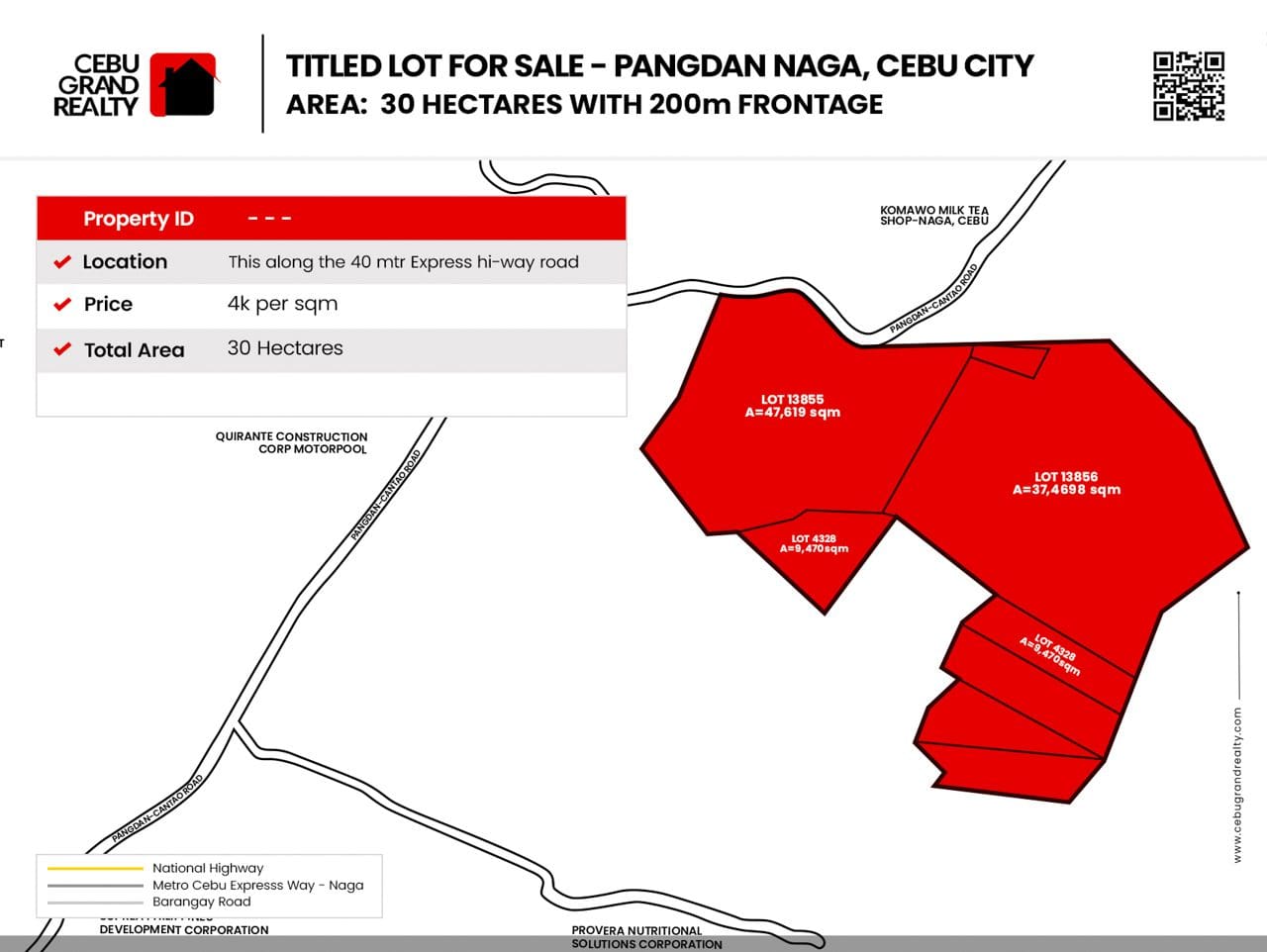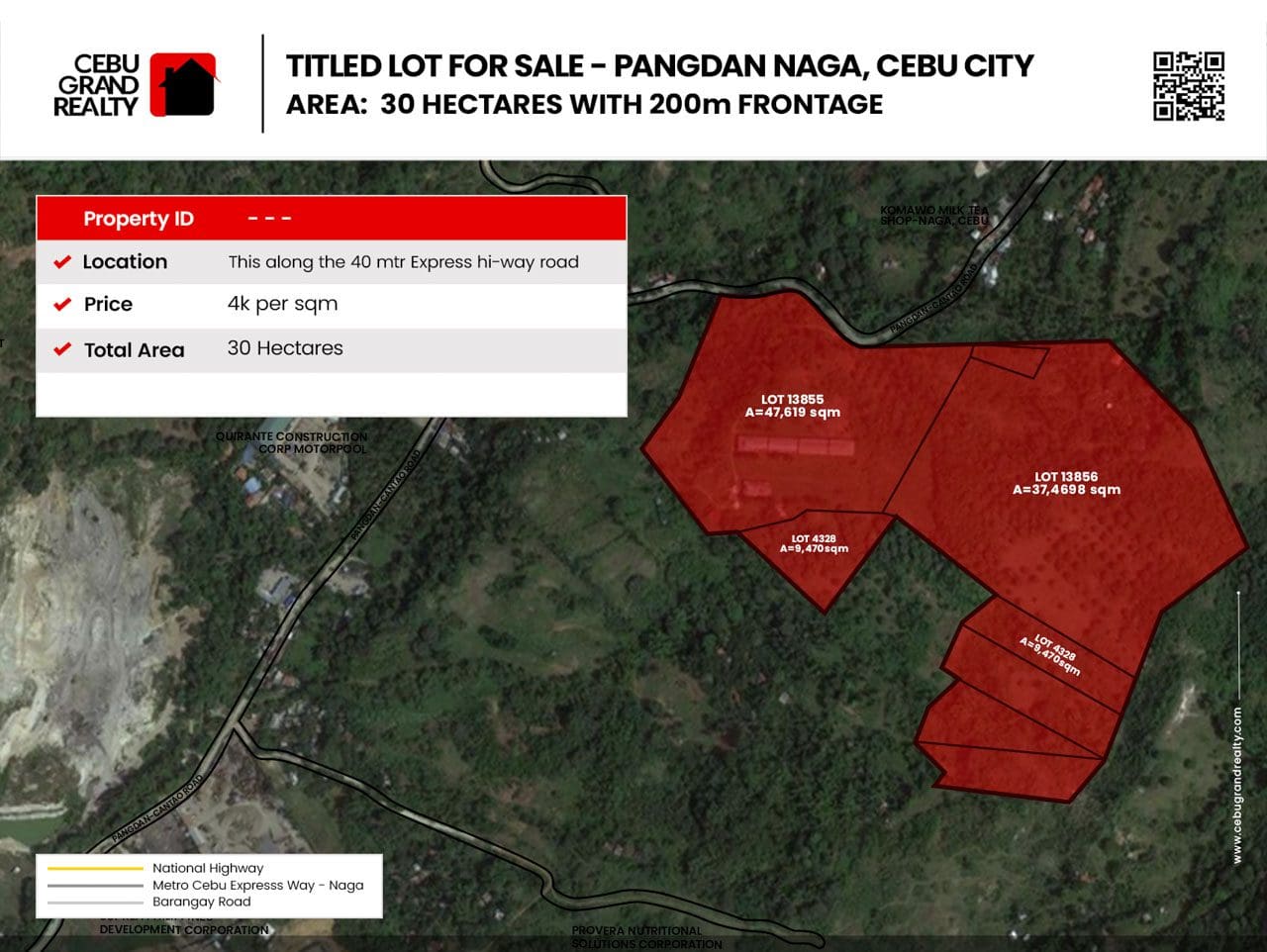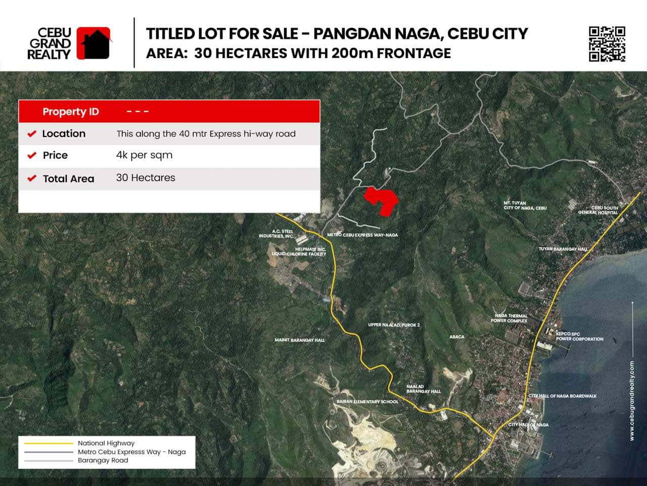 This property, spanning 30 hectares and located in Naga, Cebu, is now available for purchase. It boasts a prime location as it is directly connected to the new 40-meter-wide express highway, with an impressive frontage of nearly 200 meters. The property's industrial zoning classification makes it an ideal investment for those seeking to establish a manufacturing, warehousing, or other industrial operations. However, it is important to ensure compliance with local regulations and obtain necessary permits prior to initiating any industrial activities on the property. Don't miss out on the opportunity to acquire this valuable asset in a highly sought-after location.