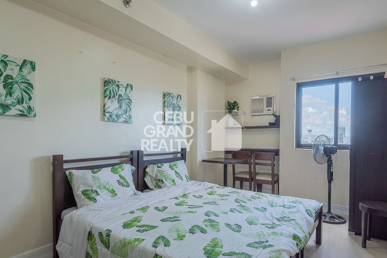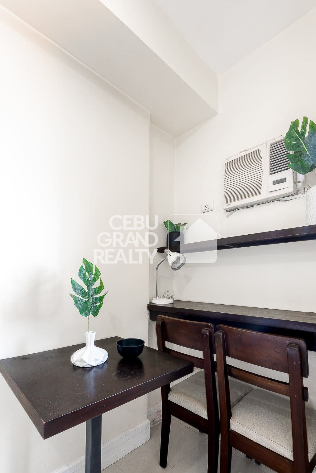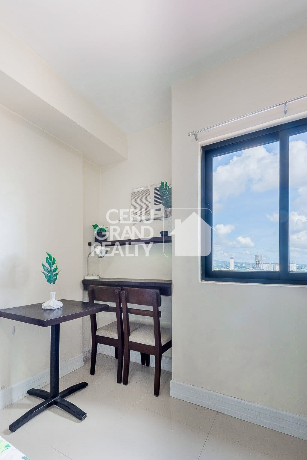 Still searching for an Affordable Studio for Rent in Grand Residences? Look no further! This fully furnished unit also boasts a functional workspace with a table and chairs positioned beside a large window, providing natural light and stunning city views. The bathroom is equipped with modern fixtures, including a pedestal sink, toilet, and tiled shower area, all designed with clean, neutral tones. With a wall-mounted TV, air-conditioning unit, and wardrobe for storage, this property truly offers the best in studio living near Cebu IT Park.