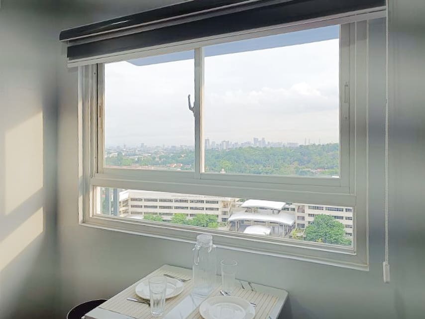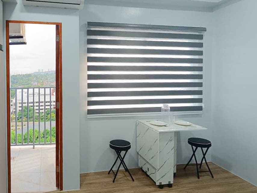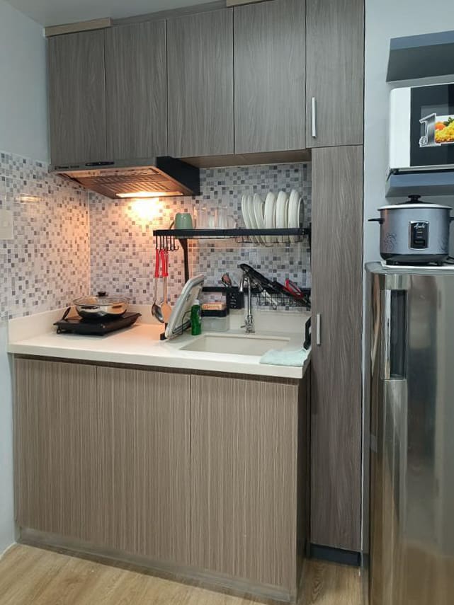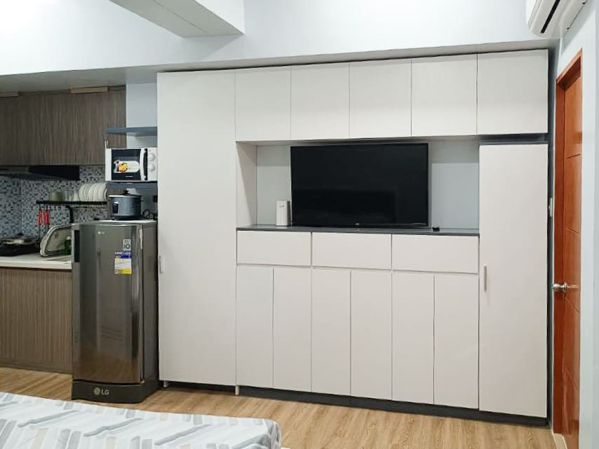 The studio is fully furnished and move-in ready, featuring a comfortable bed, a smart foldable dining table with chairs, built-in cabinetry for ample storage, and a sleek entertainment unit with a flat-screen TV. The kitchenette comes with all the essentials including a refrigerator, microwave, induction cooker, dish rack, and upper and lower cabinets. Whether you're a student, a working professional, or someone looking for a peaceful retreat, this unit has everything you need.