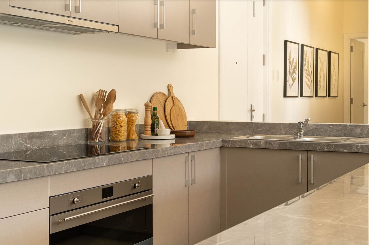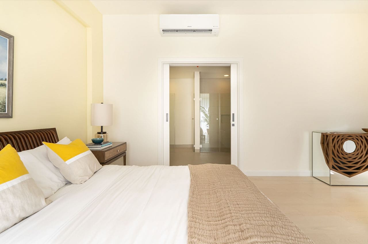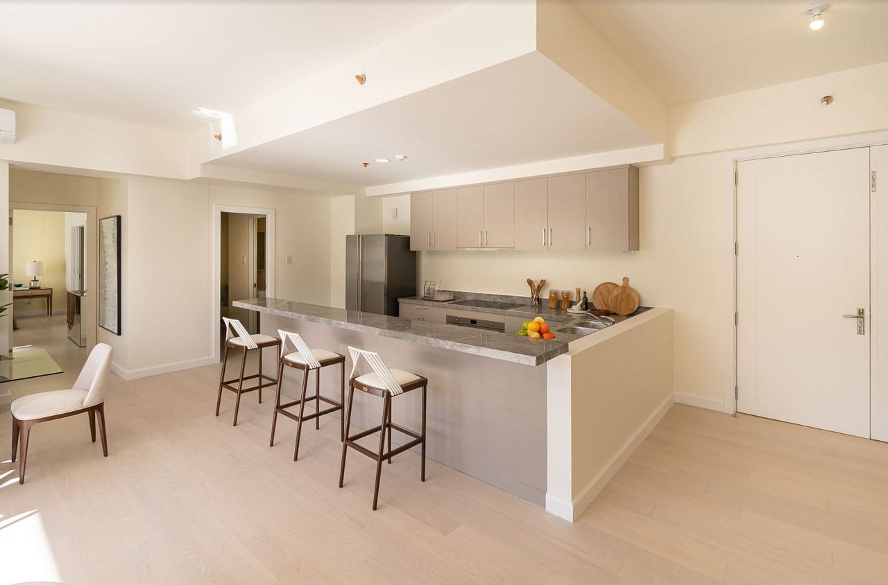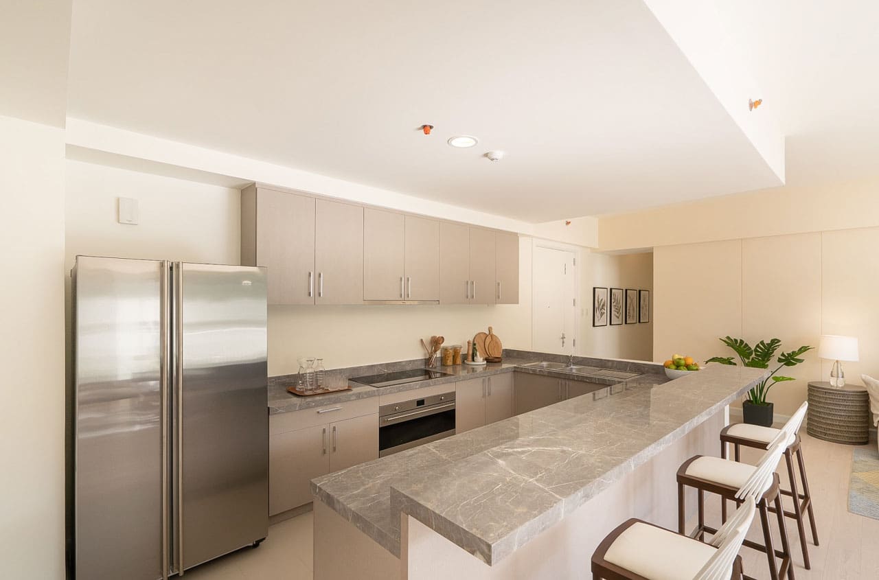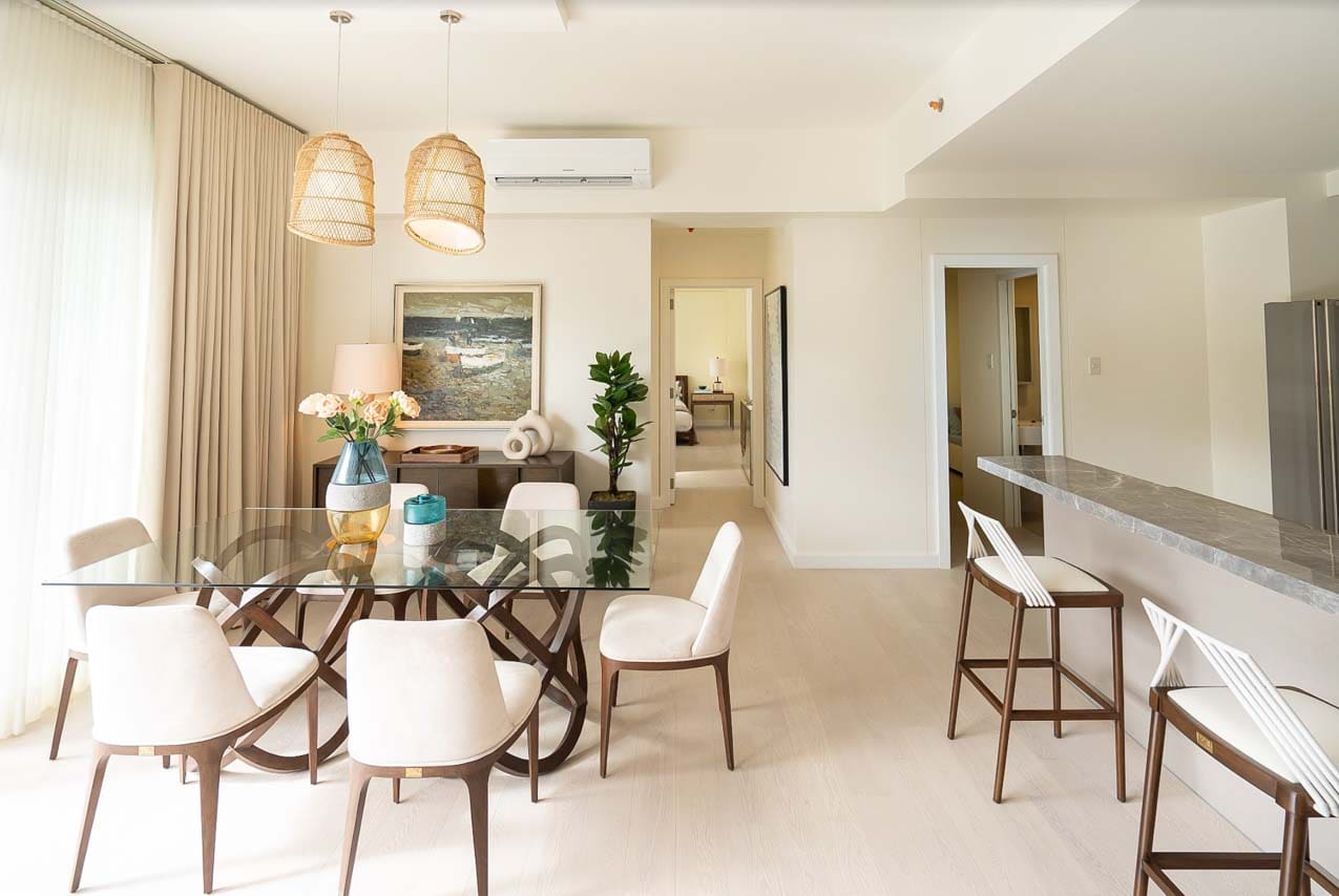 The interior design features a tasteful neutral palette, clean lines, and handpicked furnishings that elevate the minimalist aesthetic. The kitchen is a chef’s dream, complete with sleek marble countertops, built-in modern appliances, and a cozy breakfast bar perfect for casual dining. Adjacent to the kitchen is a bright and airy dining space under woven pendant lights, adding a warm, tropical touch.
