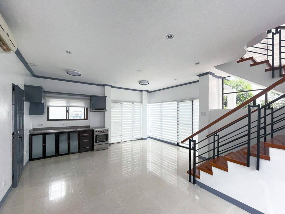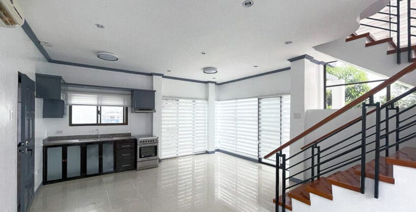 This home features an open-concept layout on the ground floor that flows seamlessly from the living area to the dining and kitchen spaces. The wide windows invite natural light in, making the interiors feel bright, airy, and welcoming. The kitchen is equipped with built-in cabinets, a range hood, and a freestanding stove—ideal for both everyday cooking and entertaining.