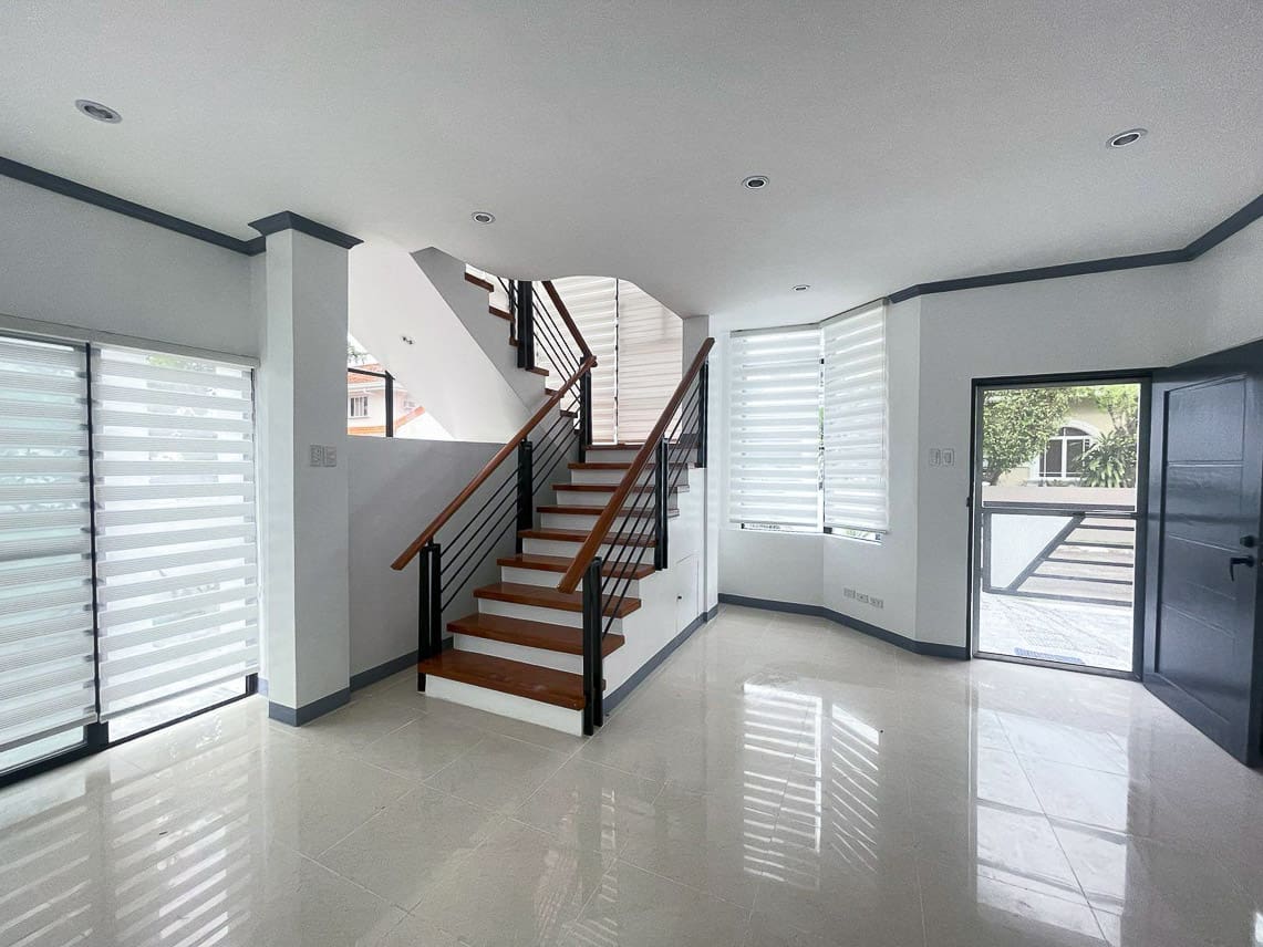 Upstairs, you’ll find four spacious bedrooms with large windows and sleek blinds, offering privacy while maintaining a light-filled ambiance. The polished white floors, dark trim accents, and minimalist lighting fixtures create a cohesive look throughout the home. The stairway, adorned with warm wooden steps and a matte black railing, adds a striking architectural feature.