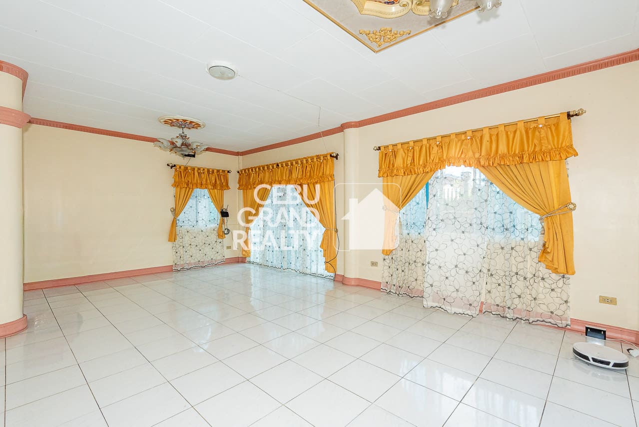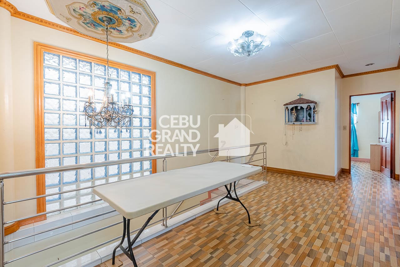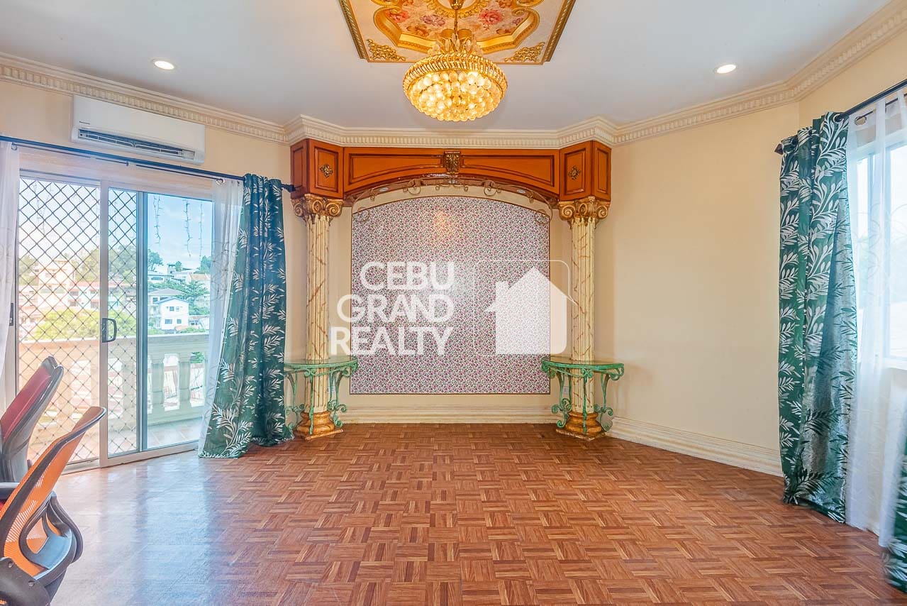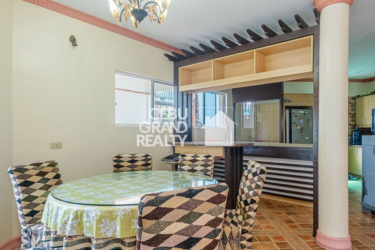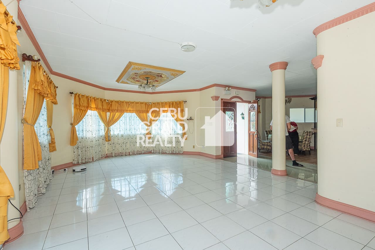 The interior design pays homage to timeless aesthetics and substantial construction. Upon entry, the expansive living area immediately impresses with its intricate tray ceilings, elegant chandeliers, and large bay windows that flood the space with natural light. The layout flows seamlessly into a dedicated dining area, highlighted by a unique breakfast bar with a wooden overhead pergola, creating a warm and inviting atmosphere for daily meals. With a massive floor area of approximately 428 square meters, every corner of this Classic and Spacious Home with Terrace for Sale in Mandaue Cebu feels breathable and unconfined.