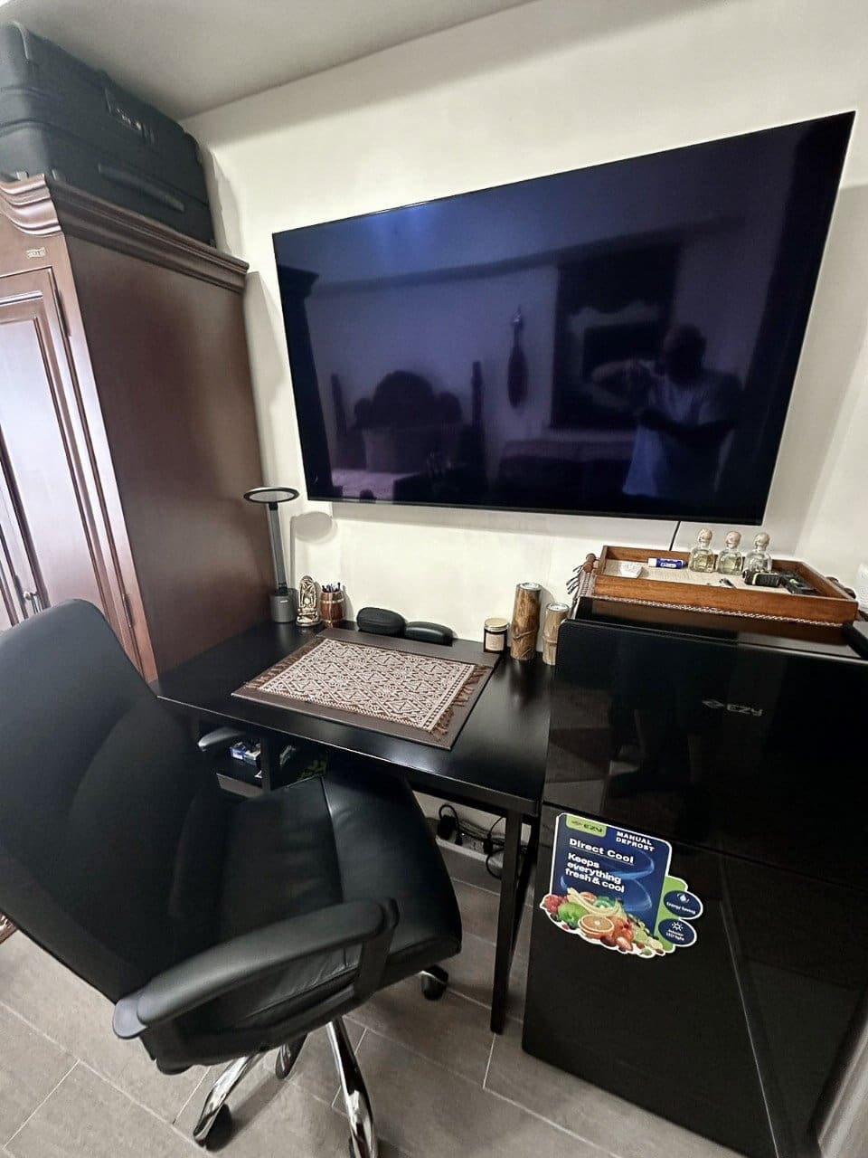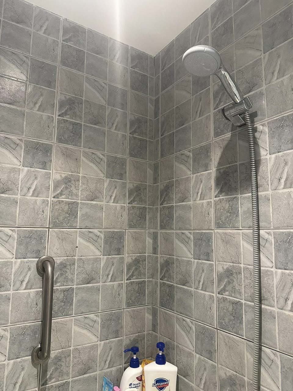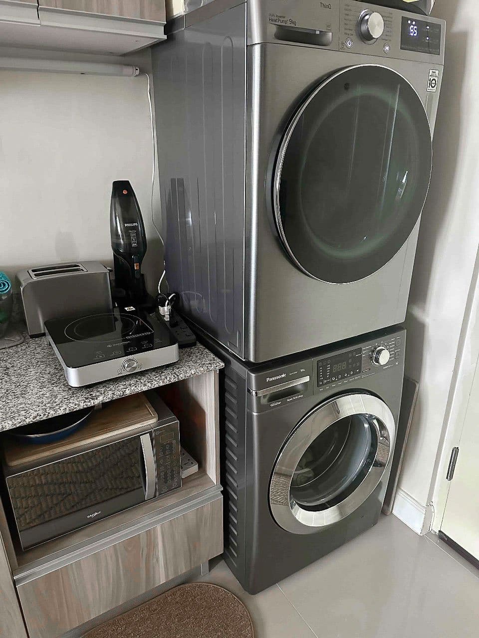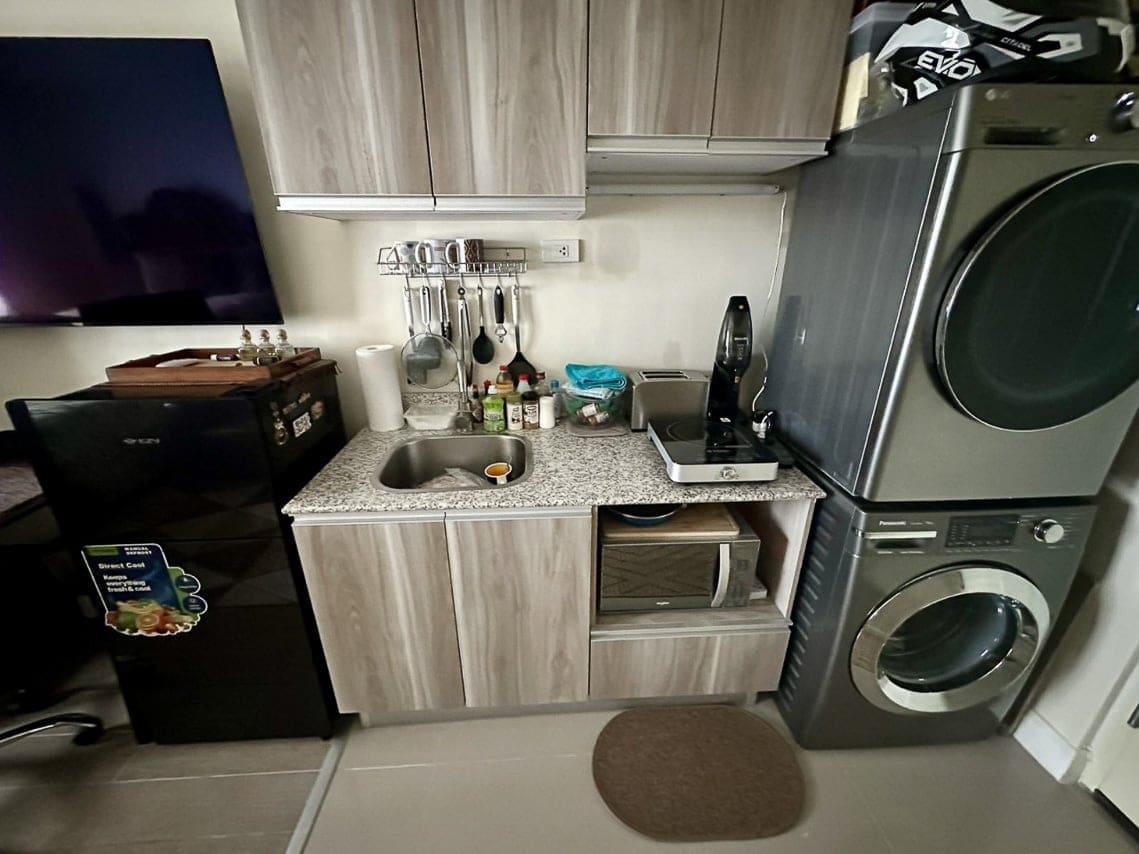 The property includes a well-equipped kitchenette with light wood cabinetry, granite countertops, and essential appliances such as a refrigerator, induction stove, and microwave. A modern washer and dryer add extra convenience, while the bathroom is fitted with stylish stone-patterned tiles, a handheld showerhead, and a safety grab bar. The unit is secured with a Yale digital lock for your peace of mind.