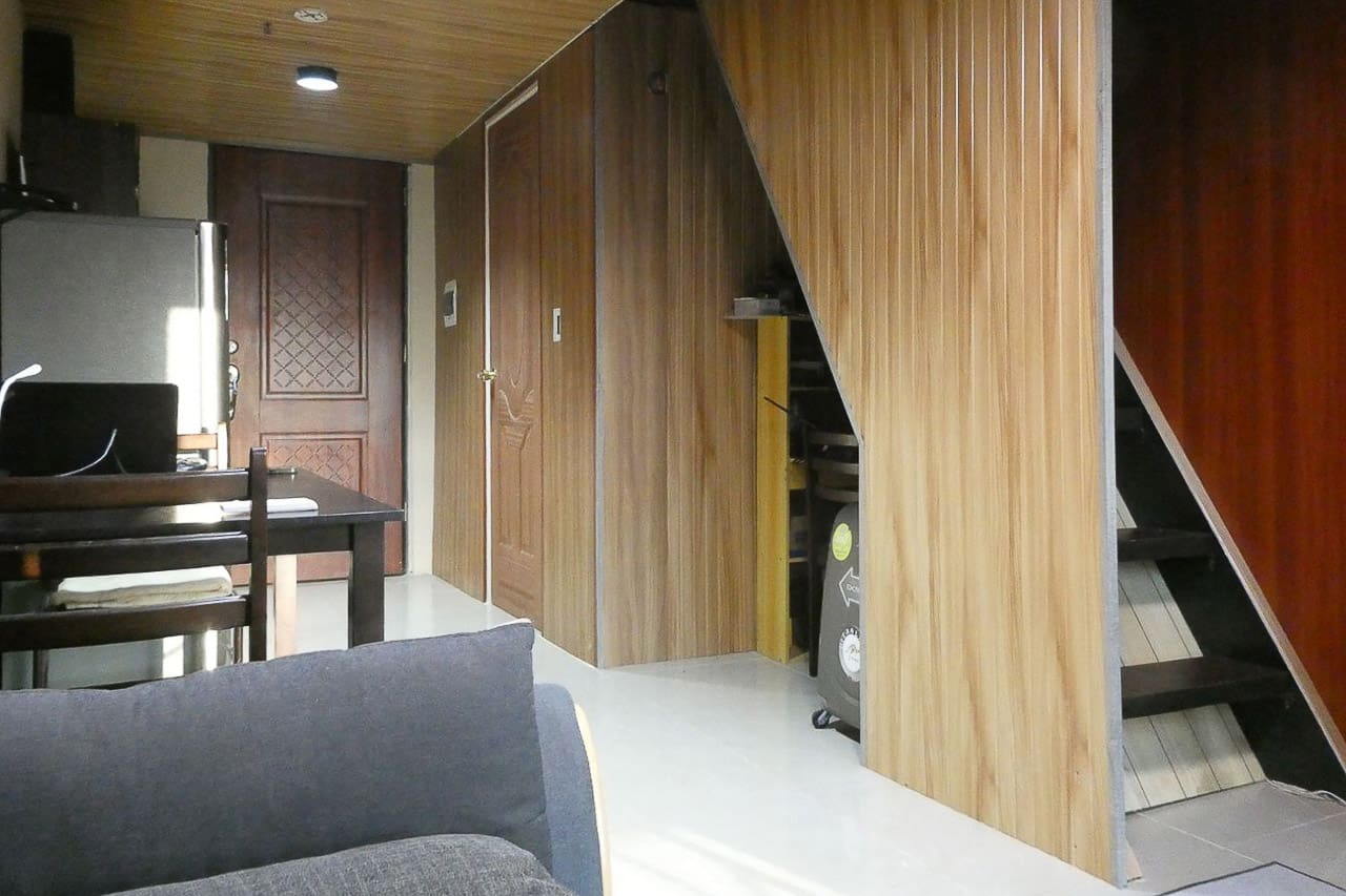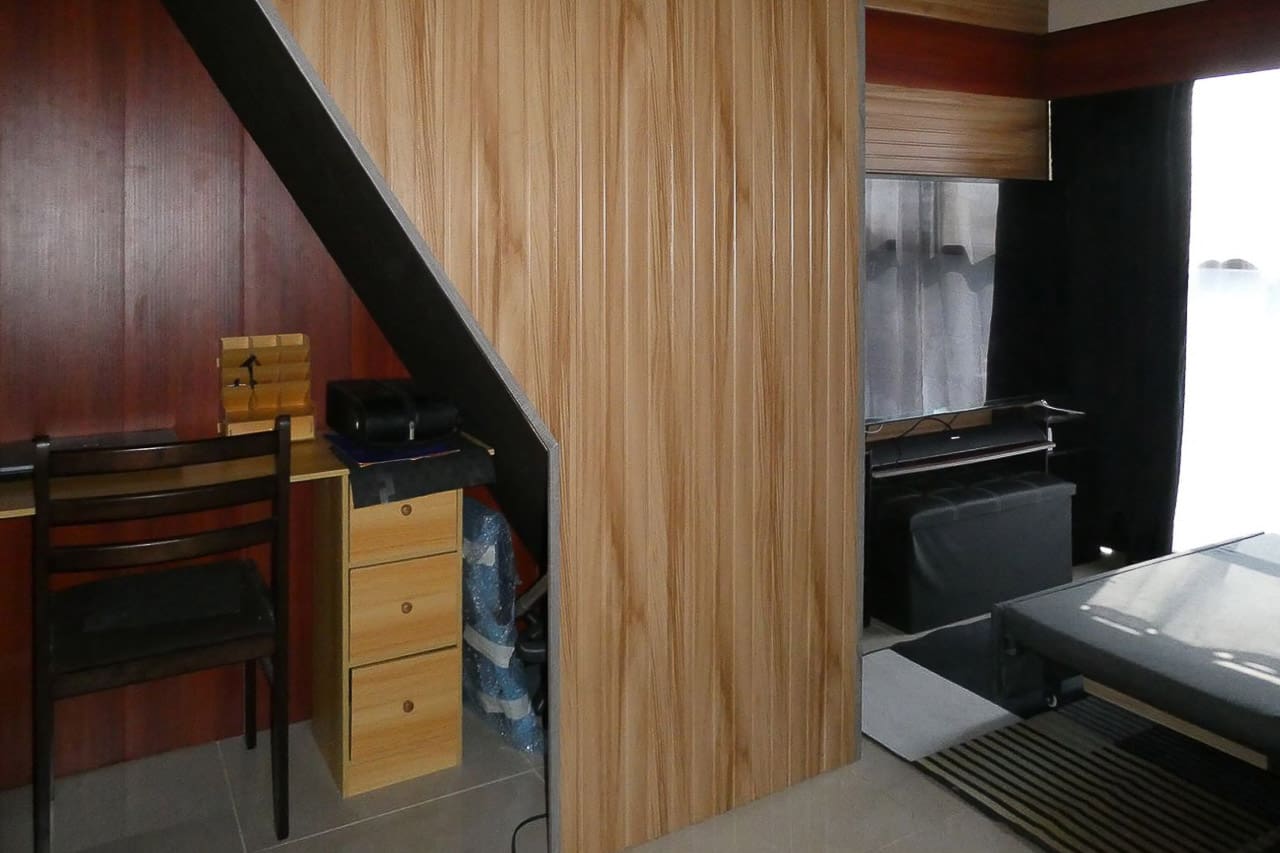 The lower level welcomes you with a furnished living and dining area, a fully equipped kitchenette with an inverter refrigerator, induction stove, range hood, utensils, and storage. The cozy loft houses the sleeping area with a queen bed, wardrobe, and computer desks, while the home remains naturally lit through tinted windows with carpets and curtains. The fully tiled bathroom includes a modern water heater. Enjoy complete connectivity with a PLDT outlet, modem, and landline phone set already installed.