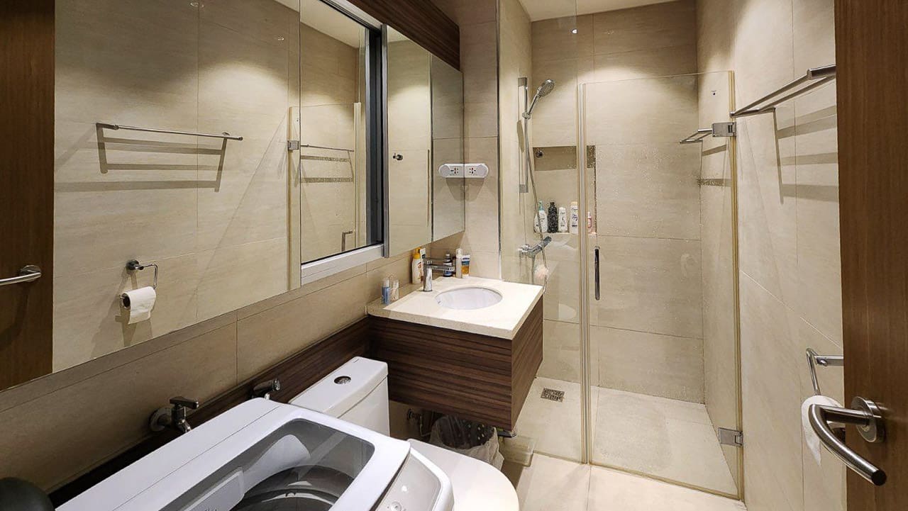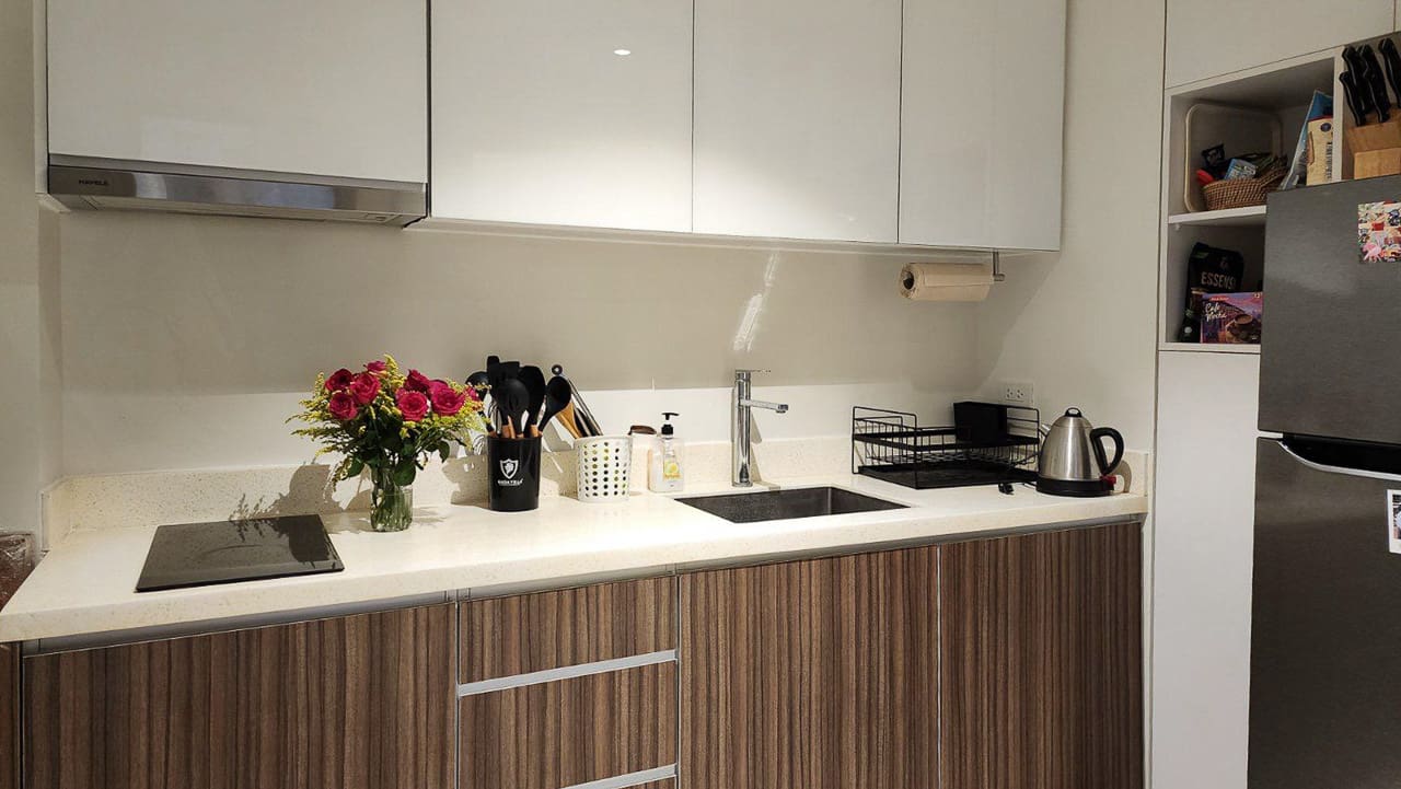 The kitchen is equipped with streamlined cabinetry, induction cooktop, and essential appliances — perfect for light cooking or entertaining. The bedroom offers a restful escape, enhanced by ambient lighting, wall-to-wall closets, and a dedicated vanity-workspace area. The bathroom is clean and modern, featuring a glass-enclosed shower and built-in washer.