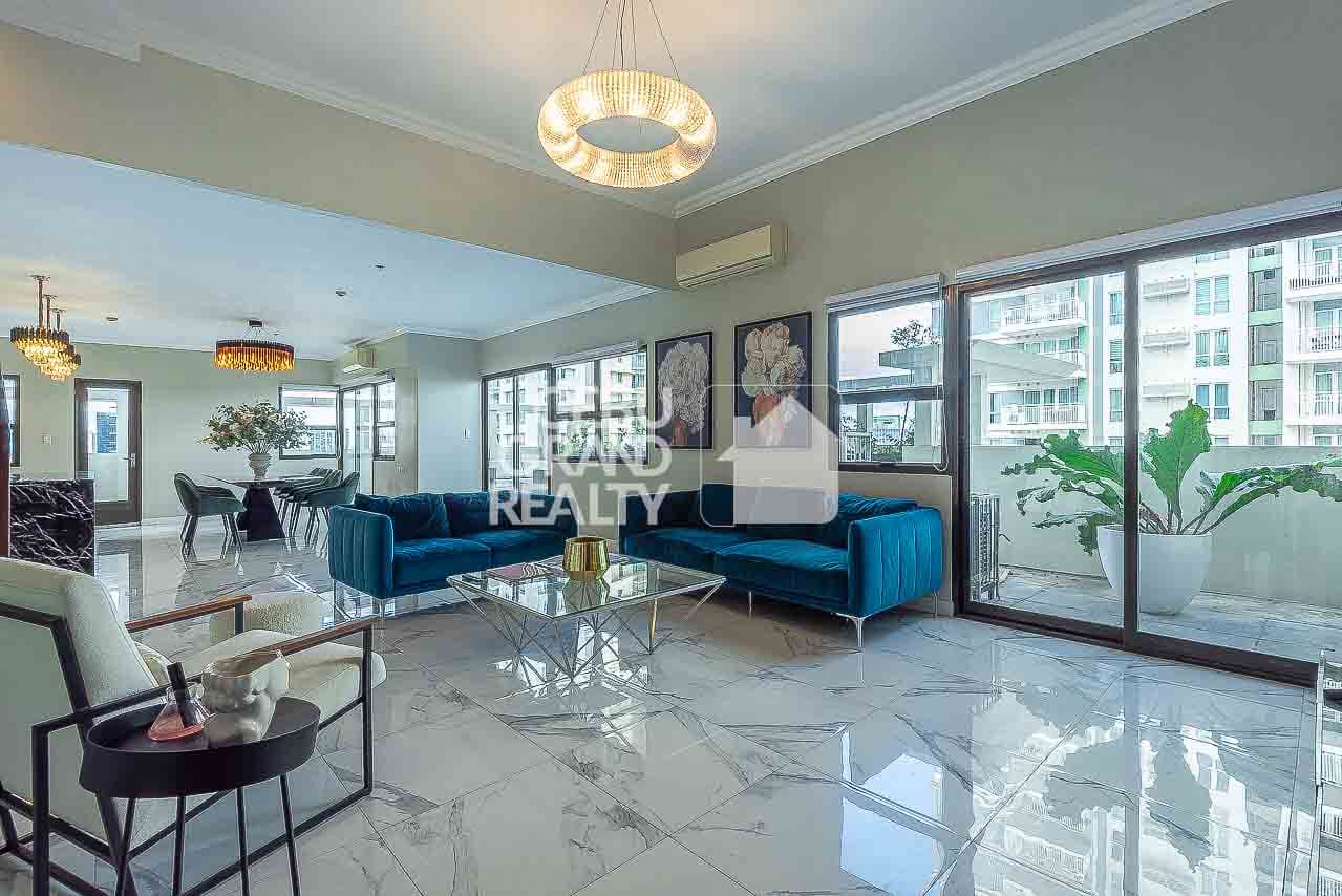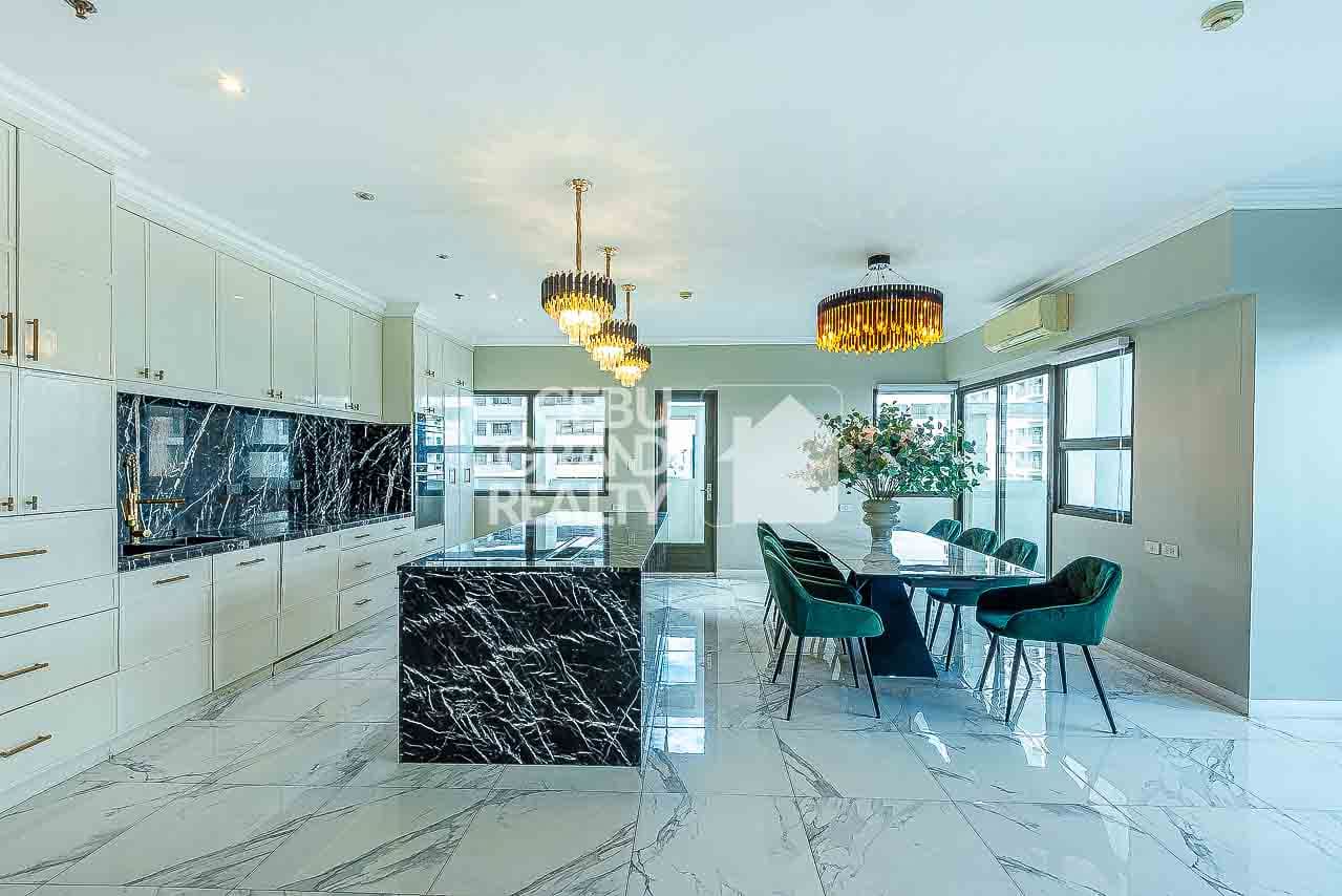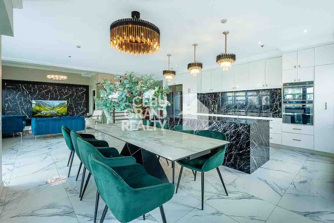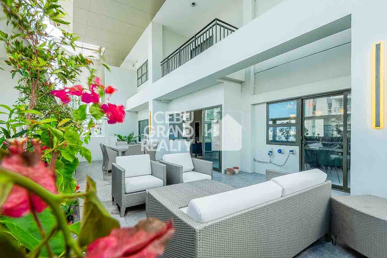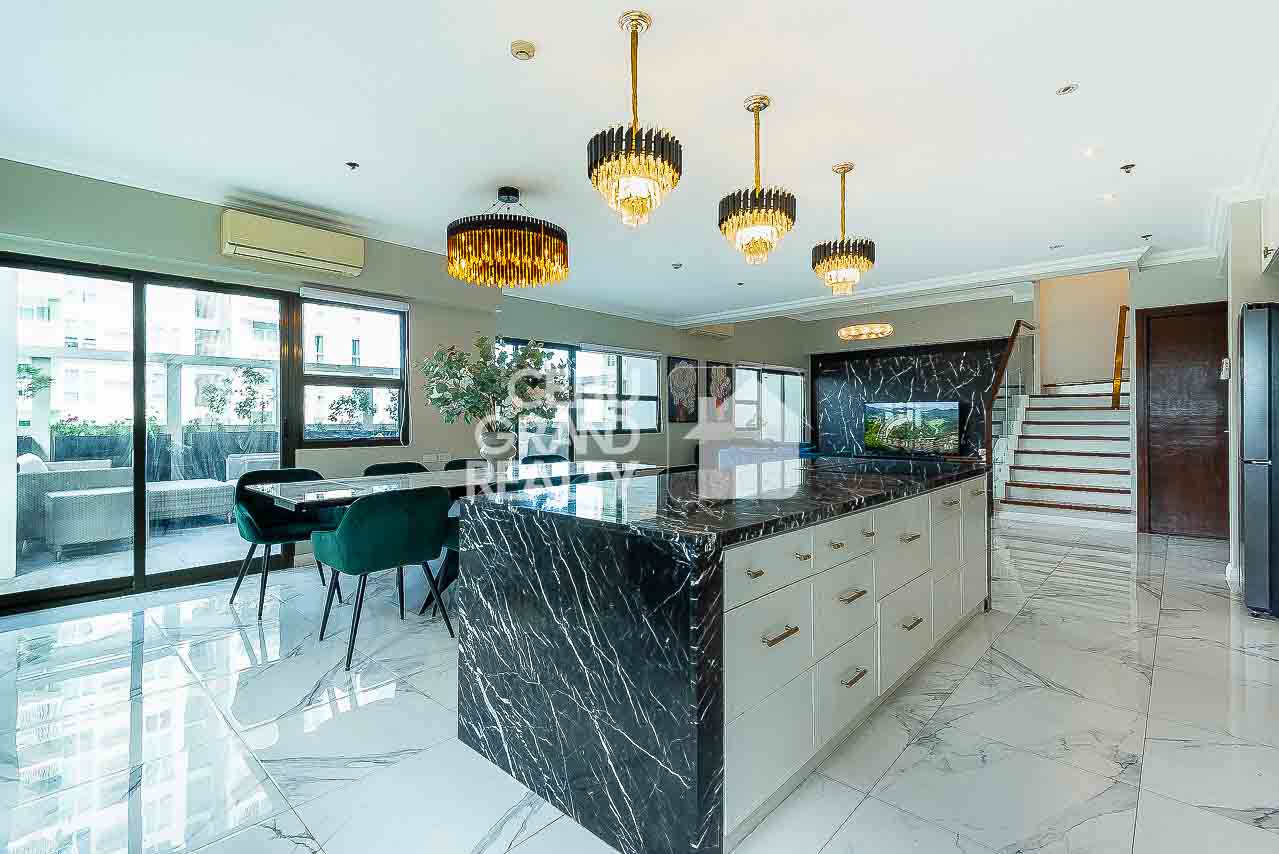Welcome to your dream home in Cebu City! This luxurious penthouse features a spacious open-plan kitchen and dining area, complete with black marble countertops, elegant chandeliers, and high-end stainless steel appliances. The adjacent living area, highlighted by a gray sectional sofa and large windows, is flooded with natural light. Step outside to the inviting outdoor seating area with wicker furniture, perfect for relaxation and entertaining. The elegant bedroom with a tufted headboard and wooden flooring offers a cozy retreat, while the simple yet functional beige bathroom adds to the condo's modern appeal.