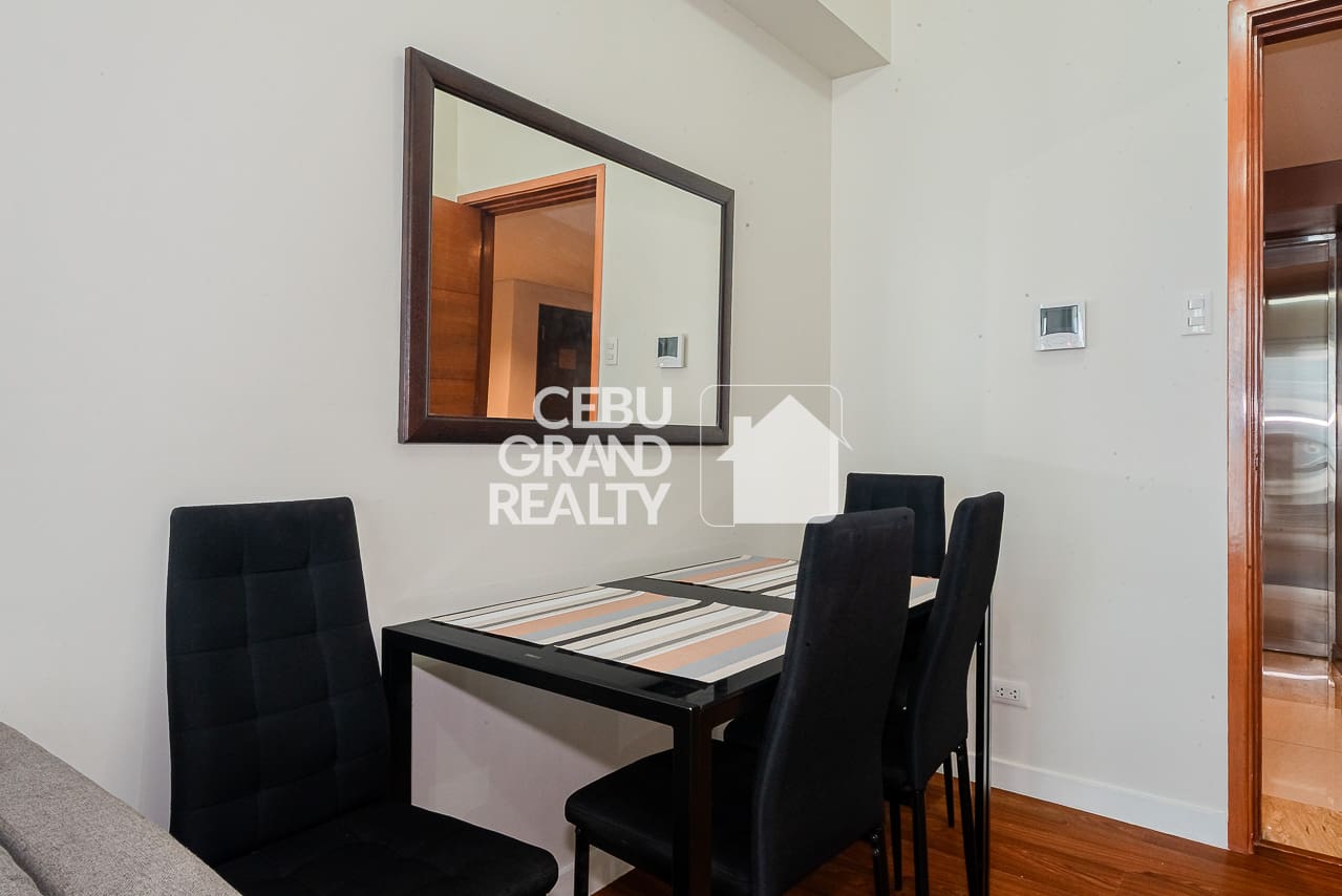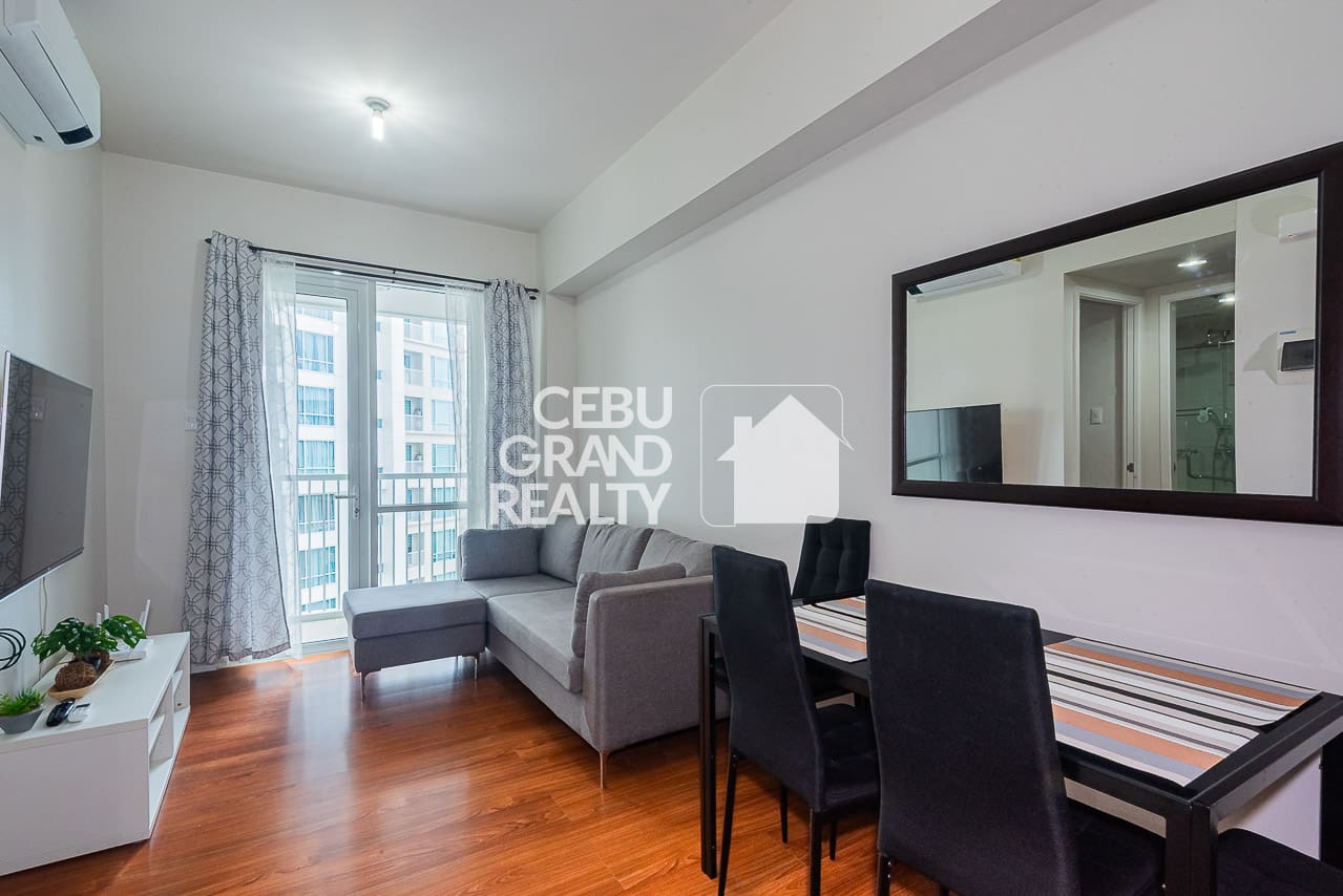 The living and dining area is thoughtfully designed for comfort and functionality. This Exclusive 1 Bedroom Condo for Rent in Marco Polo Residences comes with an L-shaped sofa, a wall-mounted flat-screen TV, and a dining table for four. Neutral tones, clean lines, and a split-type air-conditioning unit create a warm and inviting space suitable for professionals or long-term tenants seeking a quiet yet accessible home in Cebu City.