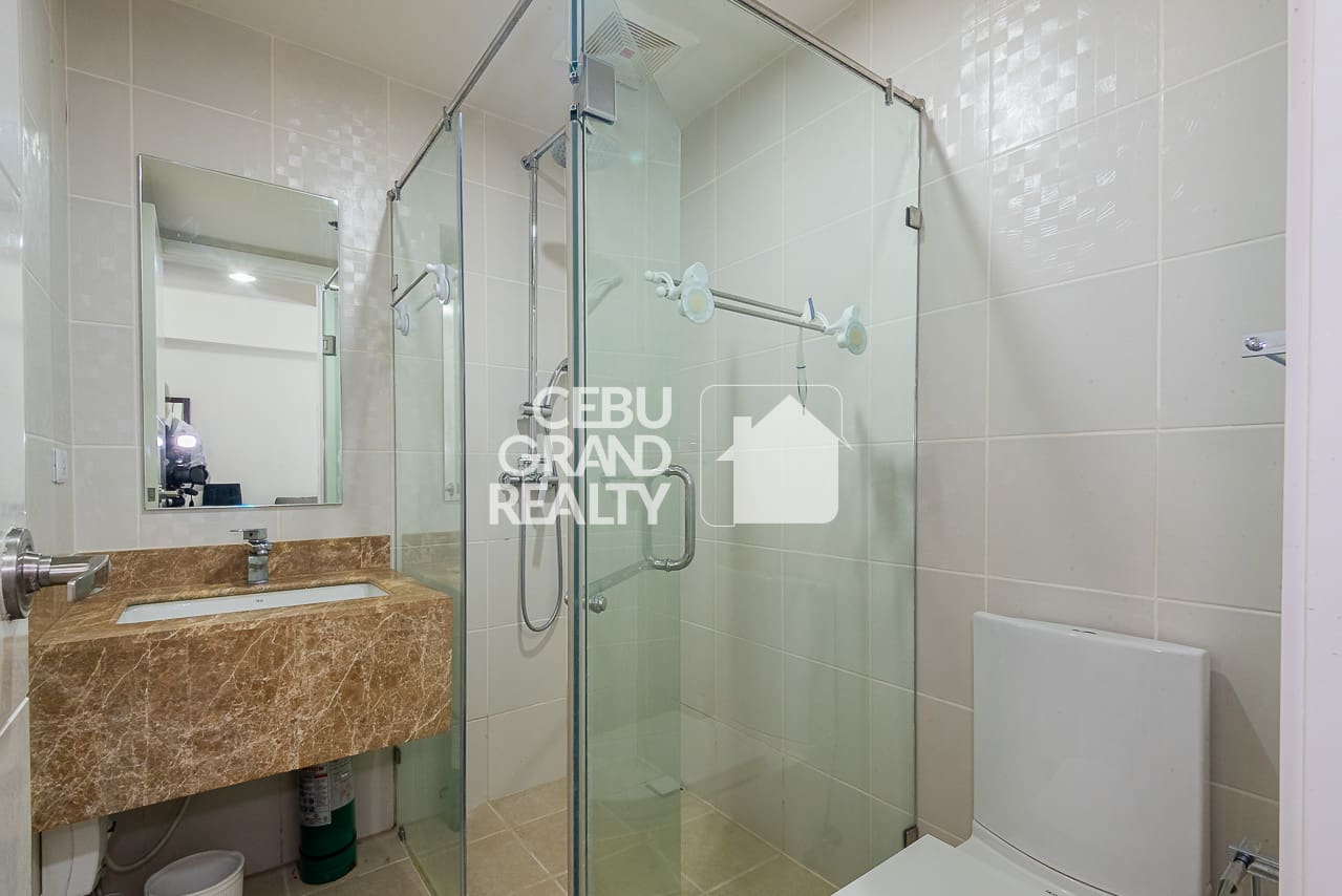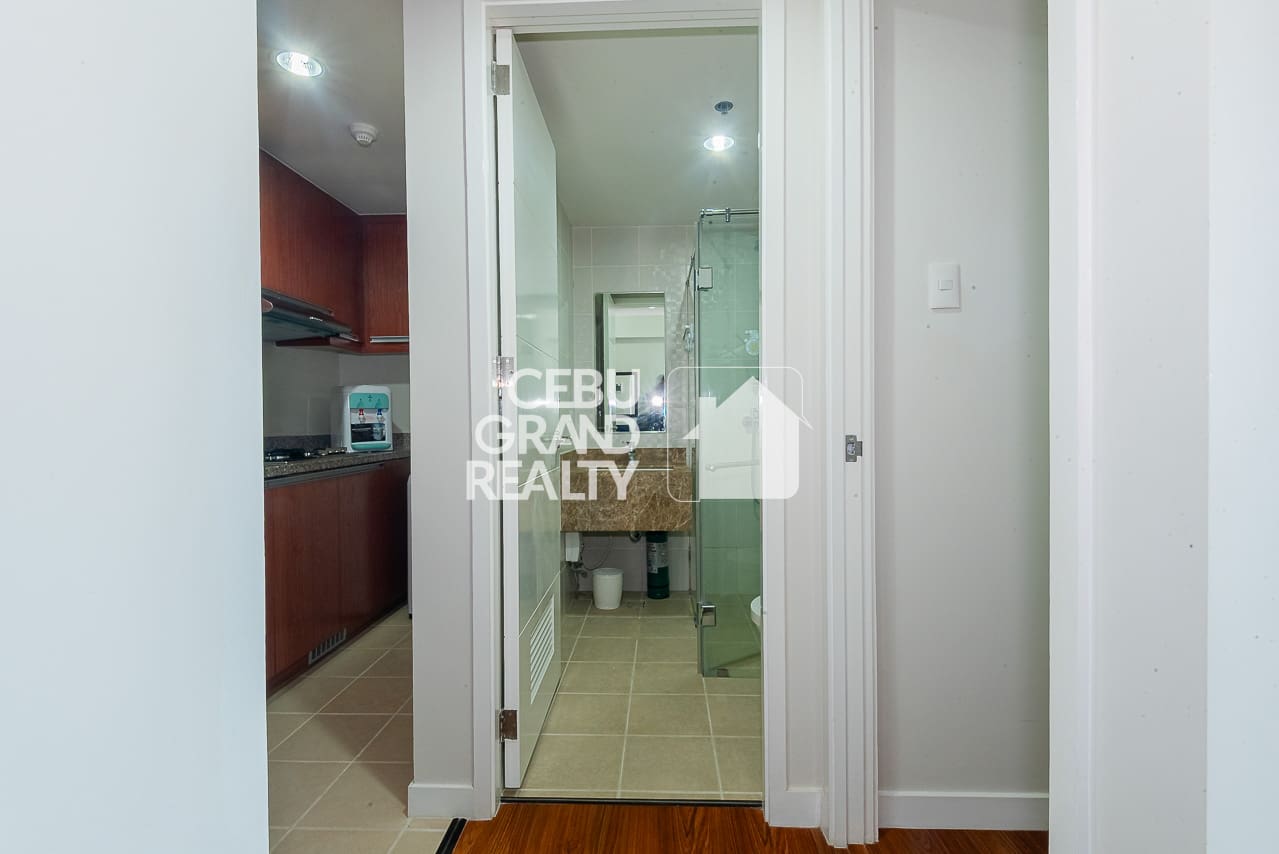 The enclosed kitchen is compact and efficient, fitted with wooden cabinets, granite countertops, a built-in cooktop with range hood, refrigerator, microwave, and washing machine. The bedroom offers a relaxing retreat with a padded bed, built-in wardrobe, and large window with curtains for natural light and privacy. A modern bathroom with a glass-enclosed shower and marble vanity completes this Exclusive 1 Bedroom Condo for Rent in Marco Polo Residences, making it a move-in-ready residence in Lahug.
