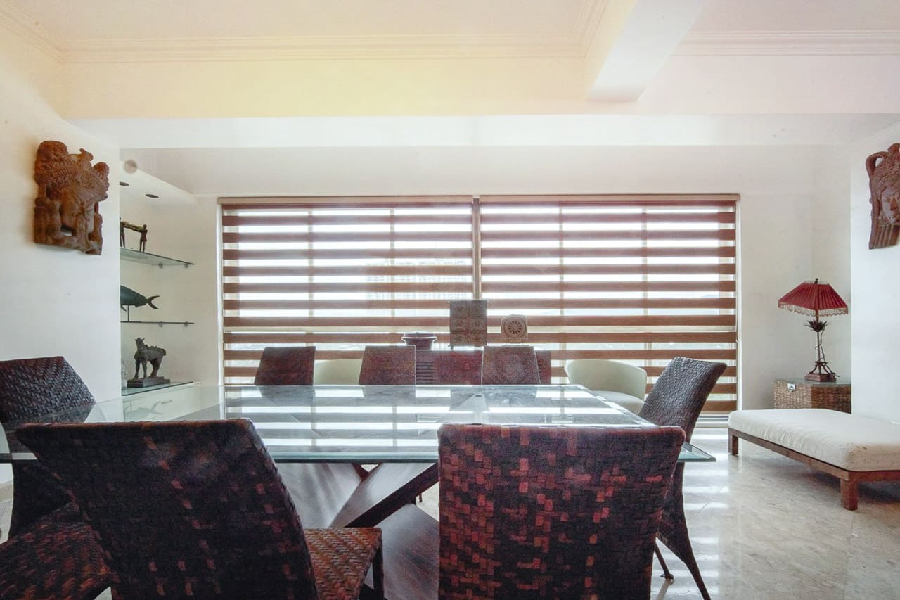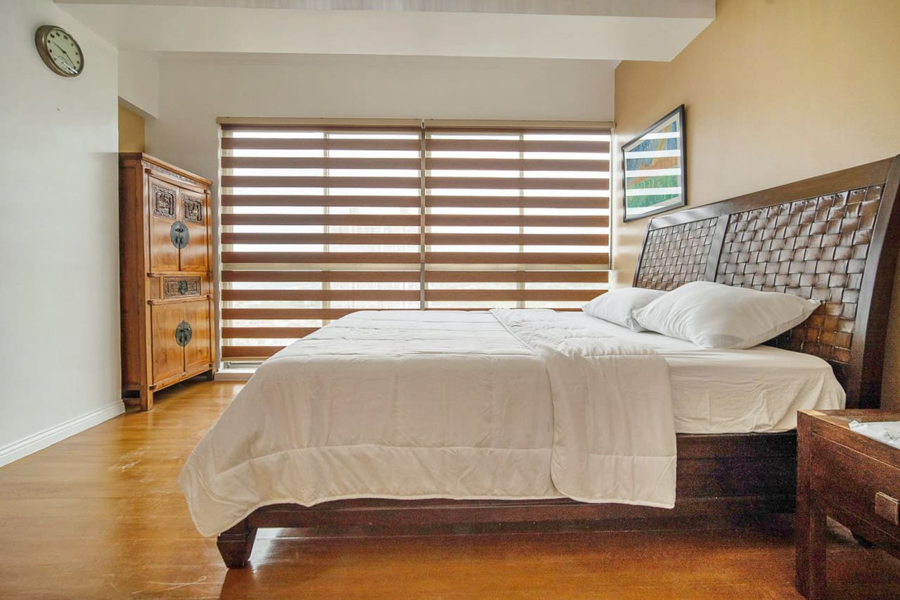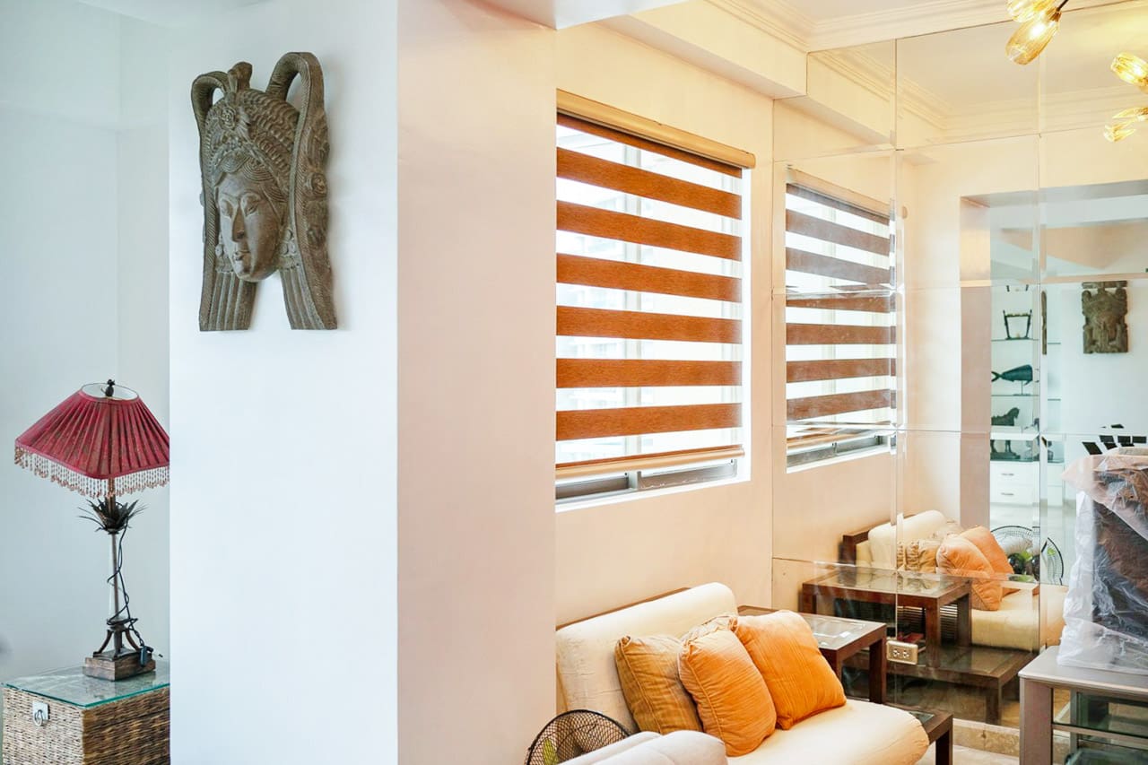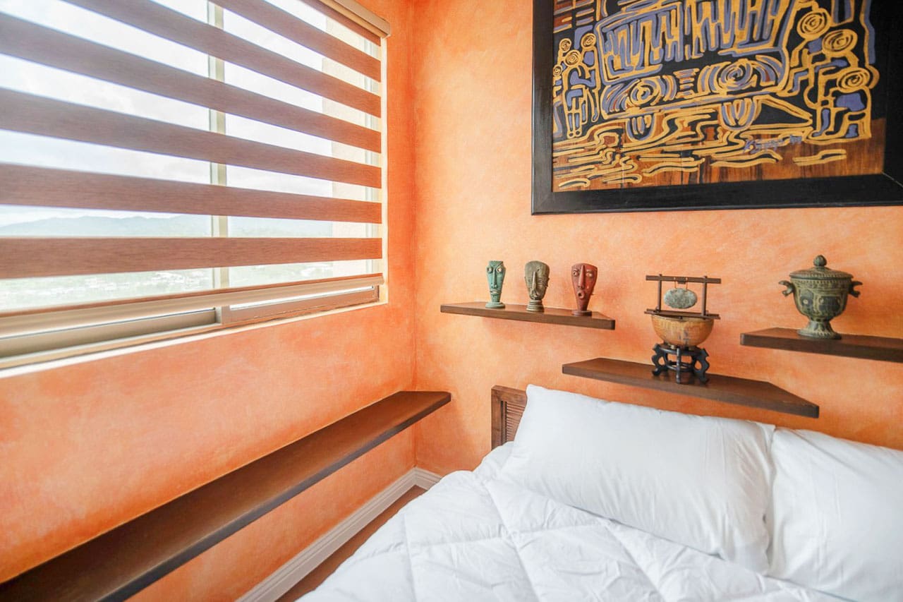 The bedrooms are designed for tranquility, featuring warm earth tones, full-length windows with zebra blinds, and striking decor pieces like tribal sculptures and curated pottery. One of the highlights of this penthouse is the carefully selected artistic accents that adorn the walls and shelves—bringing character and personality to each corner.