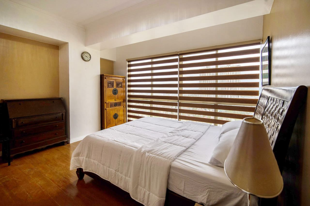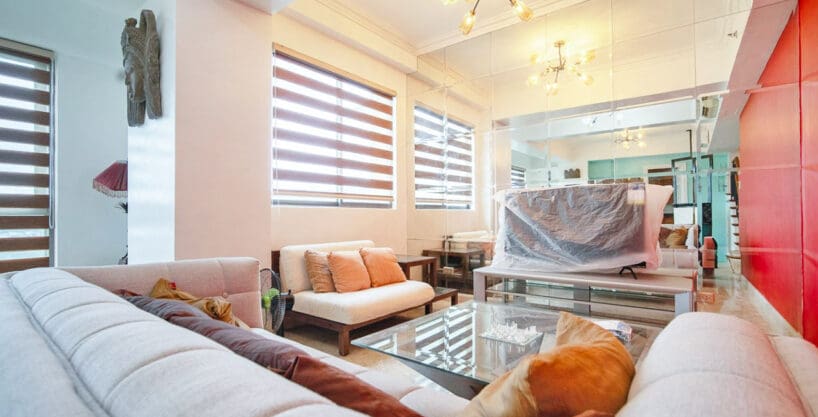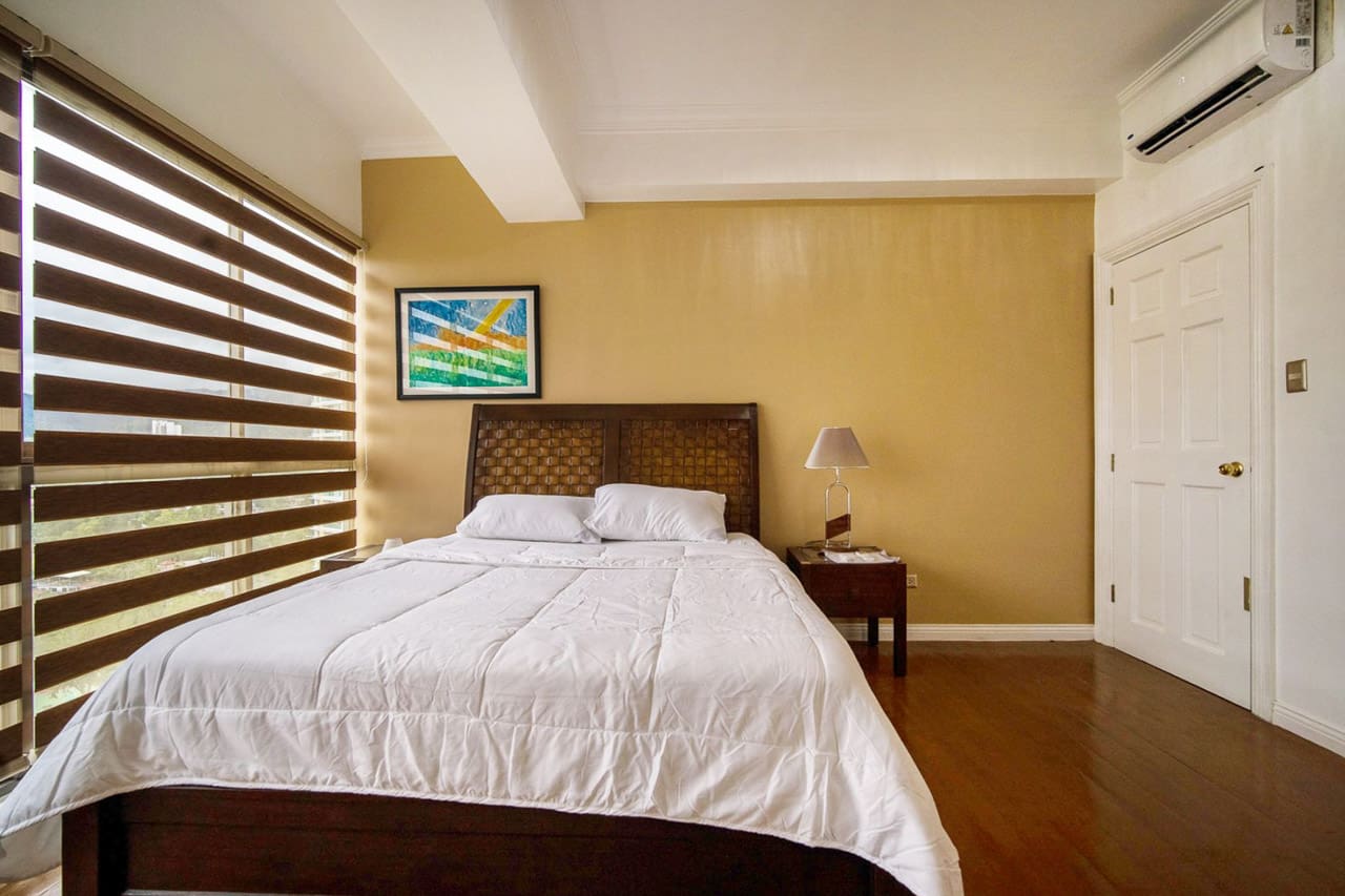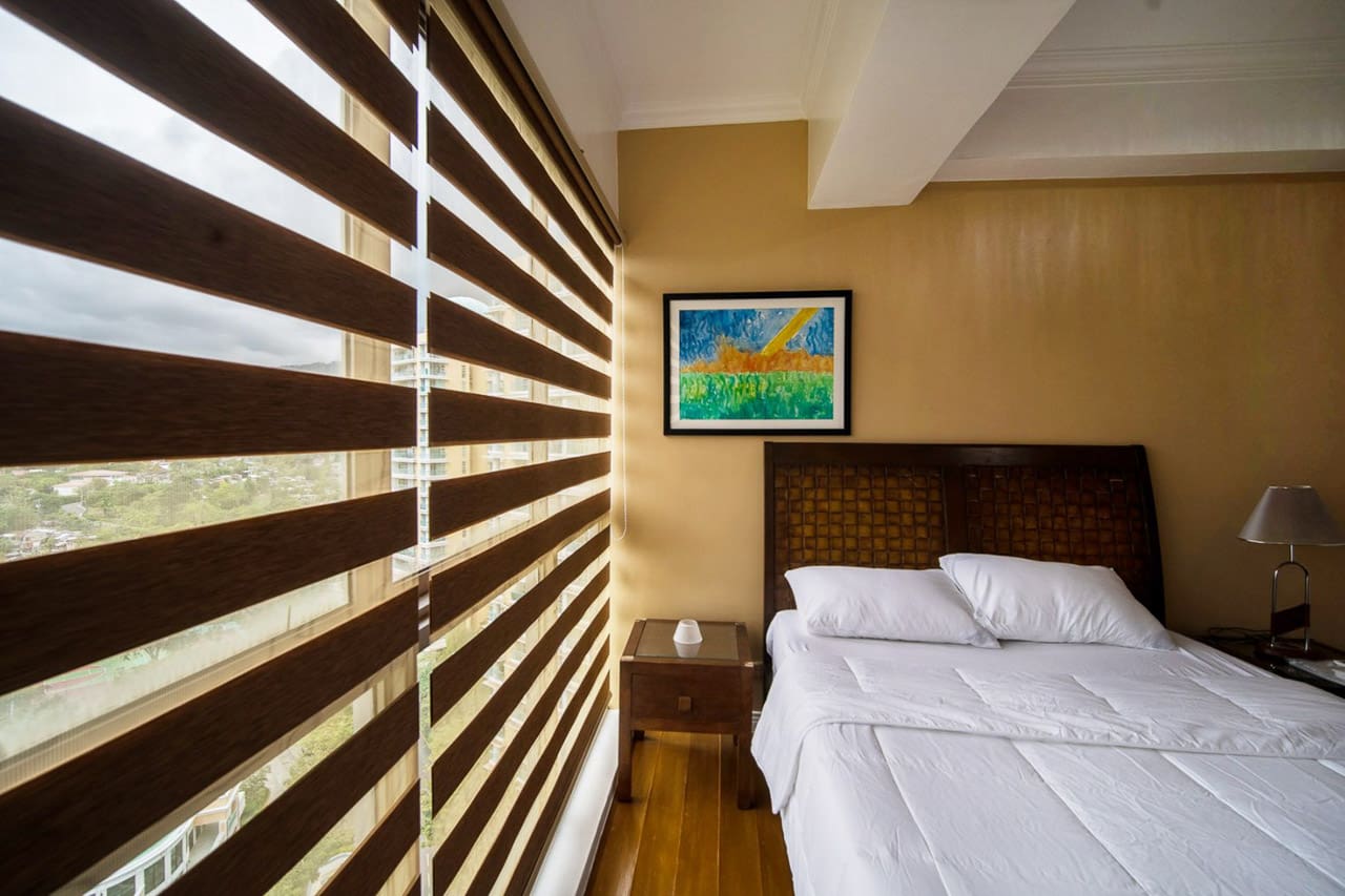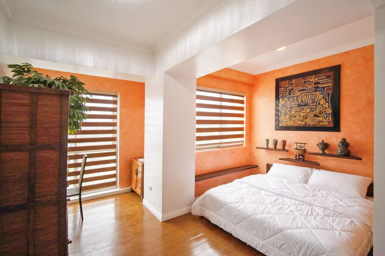 The bedrooms are designed for tranquility, featuring warm earth tones, full-length windows with zebra blinds, and striking decor pieces like tribal sculptures and curated pottery. One of the highlights of this penthouse is the carefully selected artistic accents that adorn the walls and shelves—bringing character and personality to each corner.