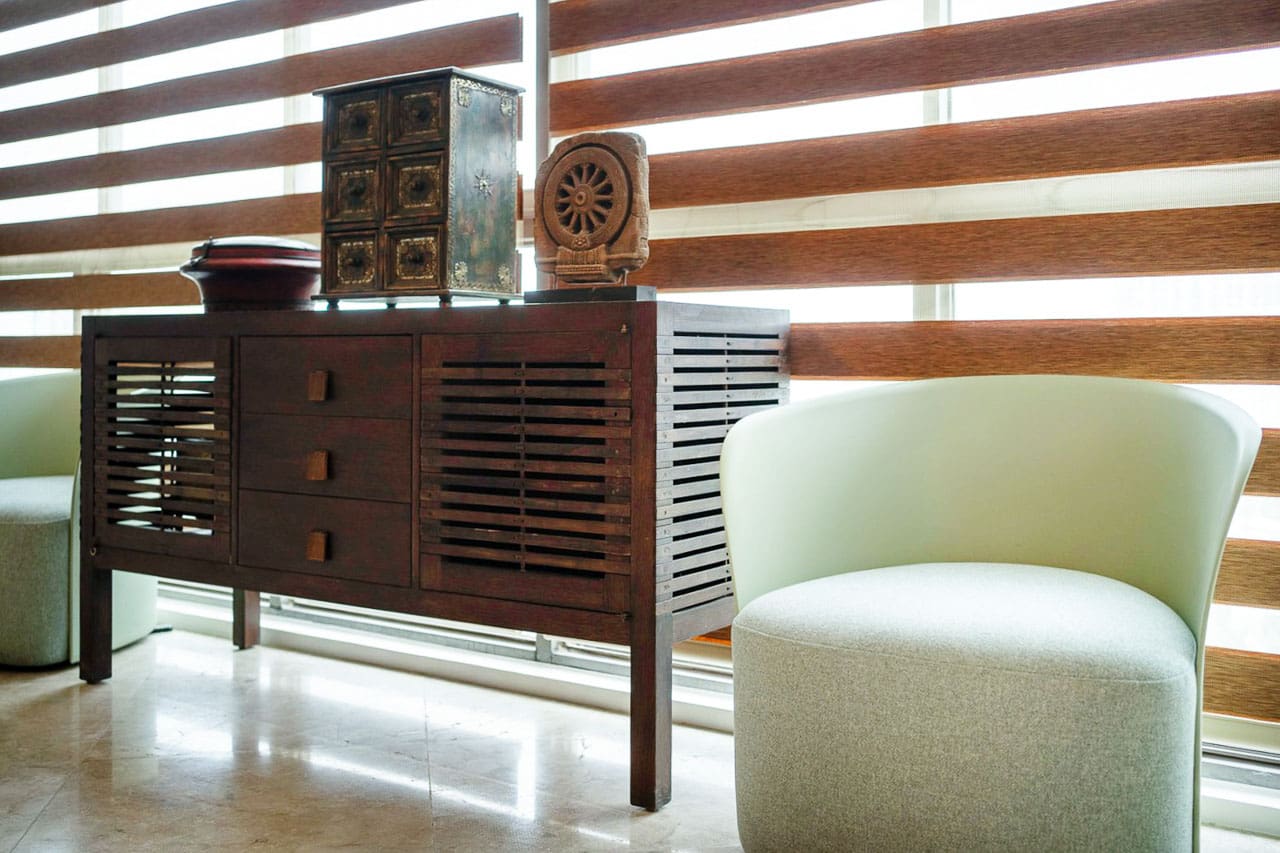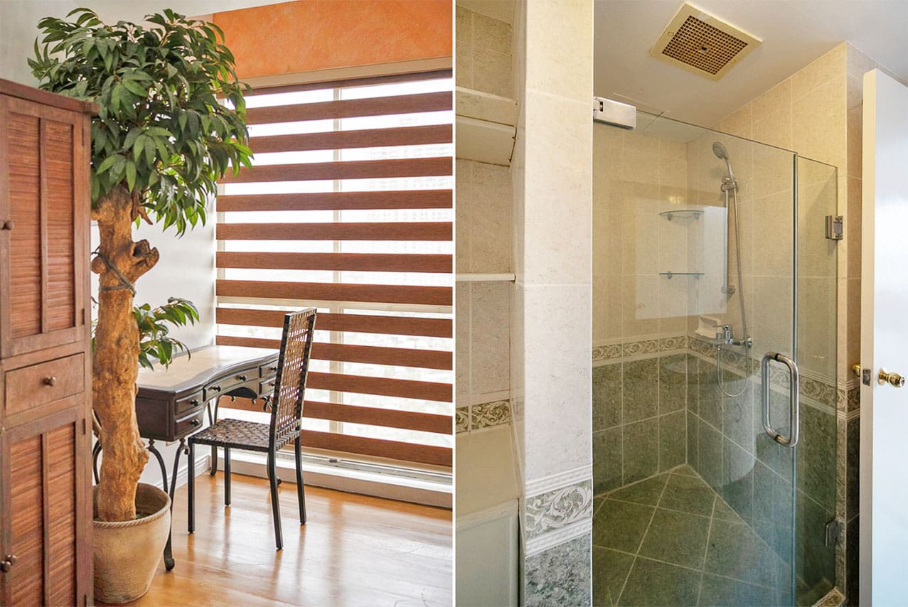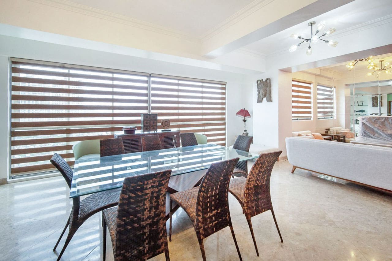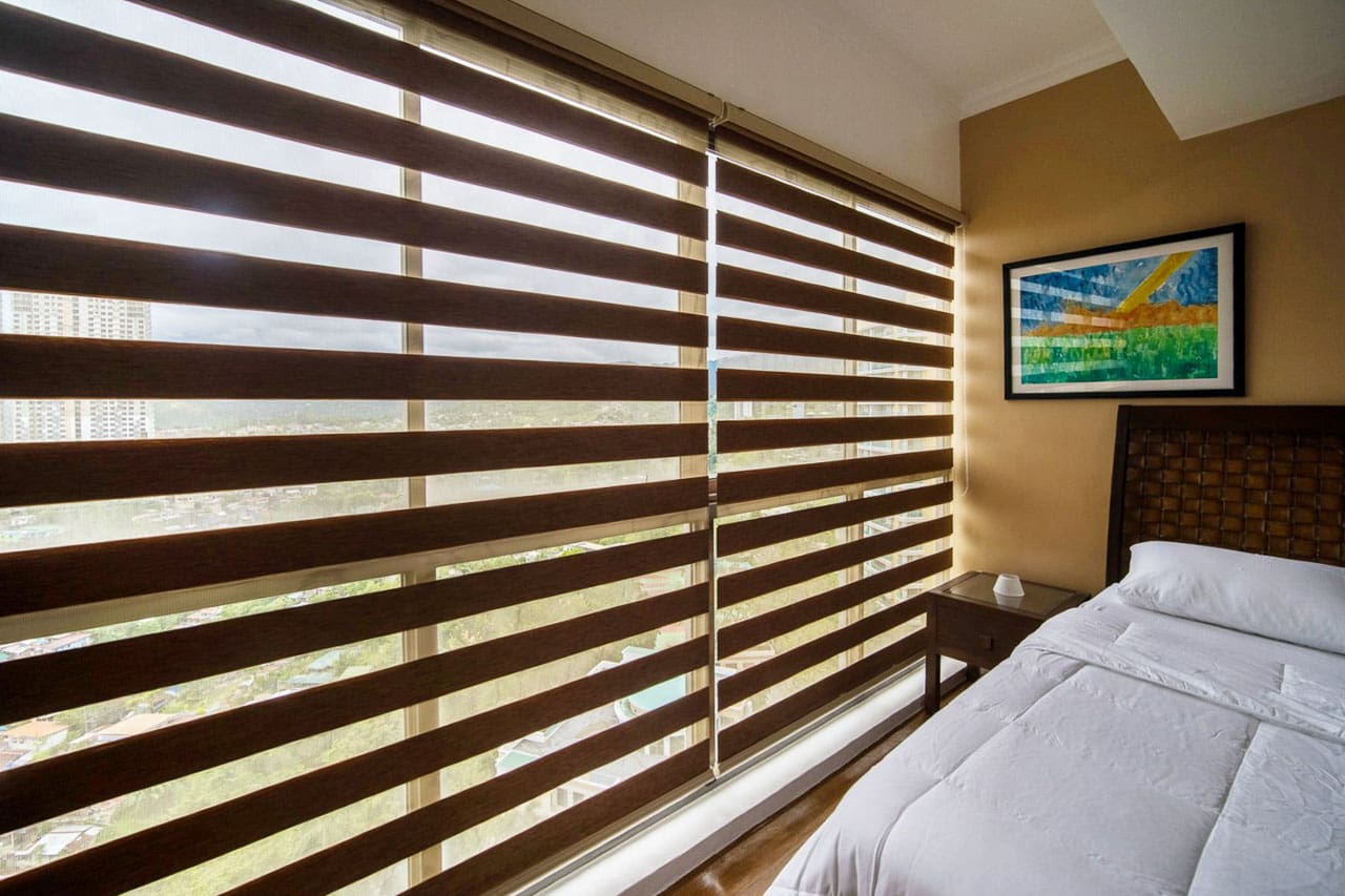 The bedrooms are designed for tranquility, featuring warm earth tones, full-length windows with zebra blinds, and striking decor pieces like tribal sculptures and curated pottery. One of the highlights of this penthouse is the carefully selected artistic accents that adorn the walls and shelves—bringing character and personality to each corner.