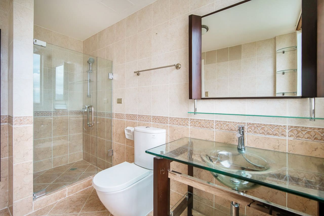 A glass-enclosed shower and modern glass sink vanity complete the well-appointed bathroom, while the large windows offer panoramic views of the city and mountains, letting in an abundance of natural light.