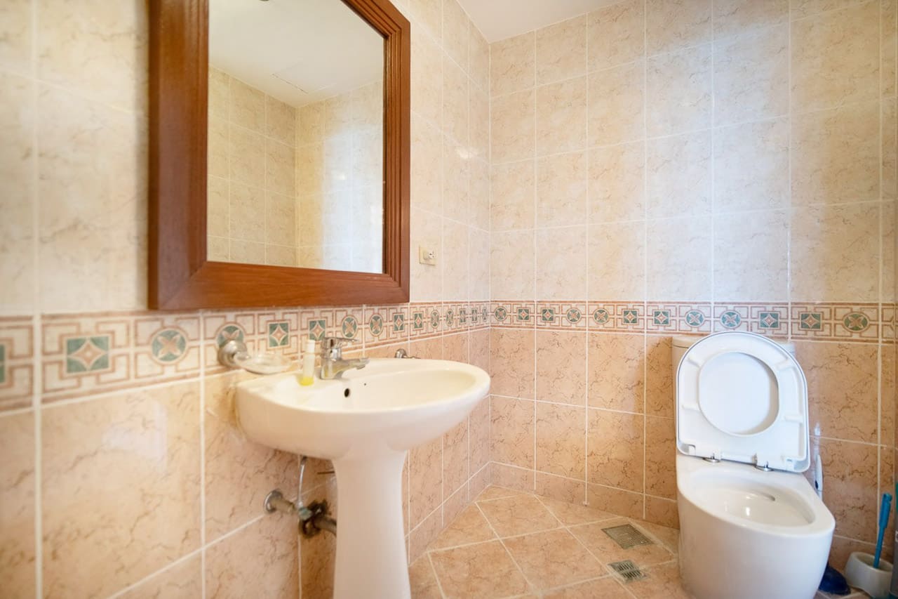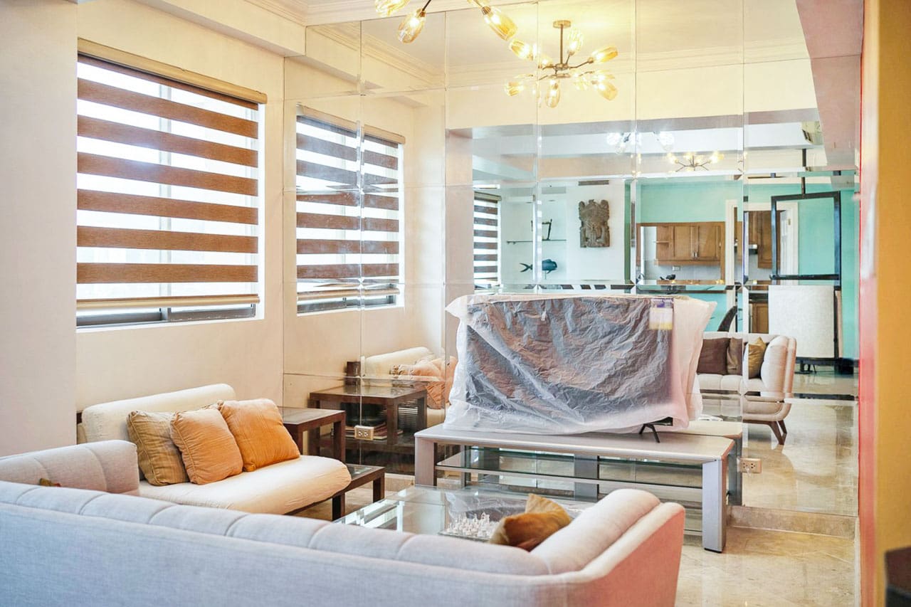 Step inside and be welcomed by a generously sized living room with plush seating, accent lighting, and mirrored wall panels that amplify the space and natural light. The open-concept layout flows into a dining area with a glass-top table and rattan-style chairs, ideal for intimate dinners or entertaining guests. The unit’s marble flooring throughout enhances its elegant appeal.