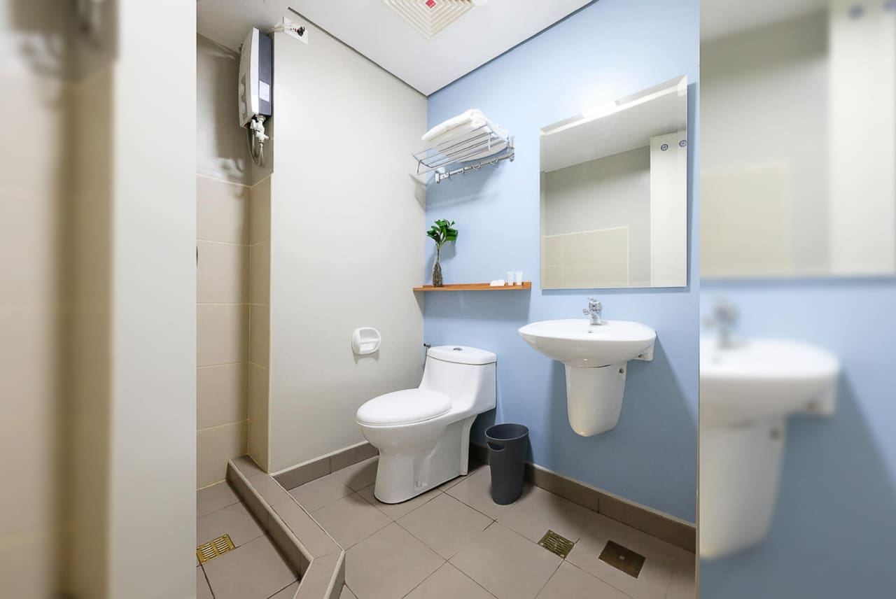 The bathroom is clean and functional, complete with a water heater, mirror, open shelving, and modern fixtures. The sleeping area features a comfortable bed with side tables and ambient lighting—an ideal setup for restful nights.