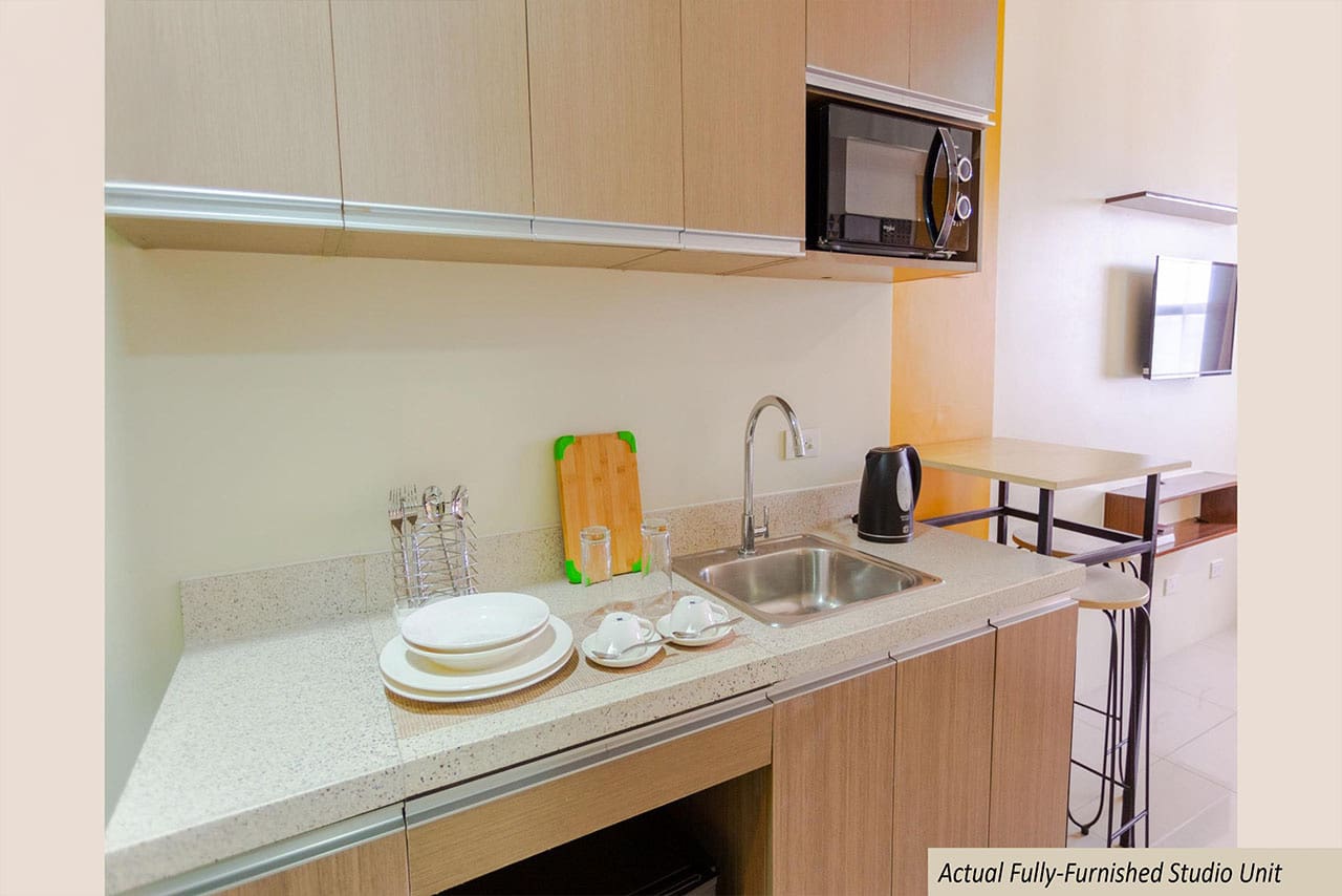 • Modern kitchenette with microwave, kettle, and dish rack