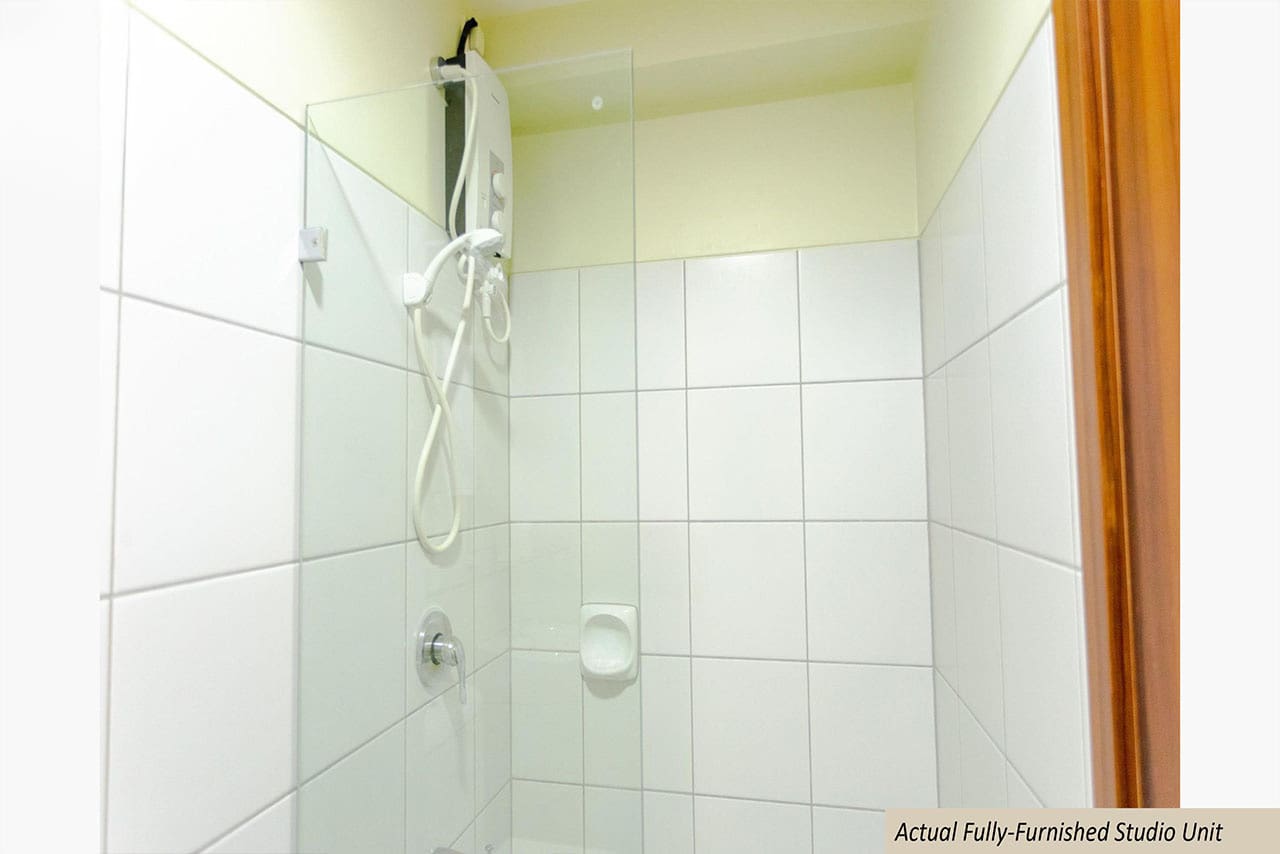 This Minimalist Studio with Cozy Vibes and Natural Light is fully furnished with a padded daybed, work desk, and a flat-screen TV. The functional layout includes a modern kitchenette complete with upper and lower cabinets, a stainless-steel sink, microwave, kettle, utensils, and plates—everything you need to enjoy independent living in style. The clean, tiled bathroom features a hot and cold shower, sleek sink, and toilet with bidet spray.