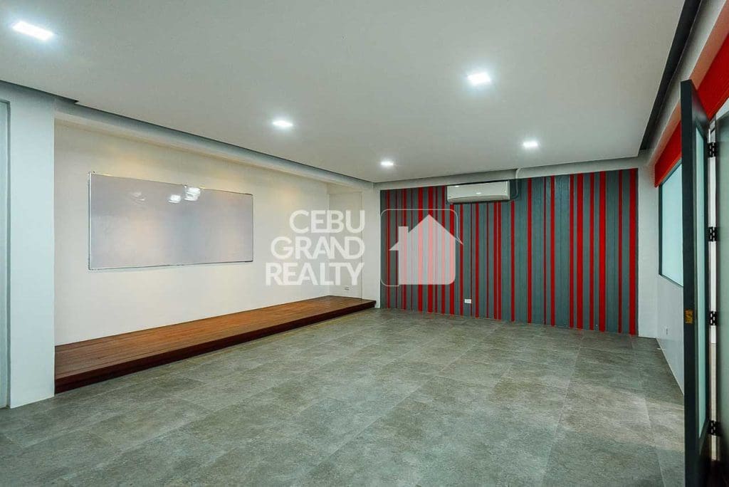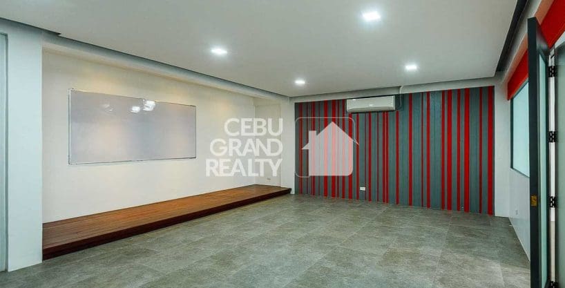 Discover a modern office space designed to inspire creativity and productivity, featuring artificial grass walls, spacious minimalist rooms with gray tiled flooring, and glass doors and partitions. This vibrant meeting room, with red and gray striped wallpaper and built-in shelving, offers ample storage and functionality. Enjoy the comfort of an air-conditioned office with recessed lighting and a large whiteboard for presentations. The unique design elements, including a rustic wooden bench and a functional wooden platform for presentations, blend contemporary and natural aesthetics. Schedule a viewing today and elevate your business in this stylish and versatile office space.