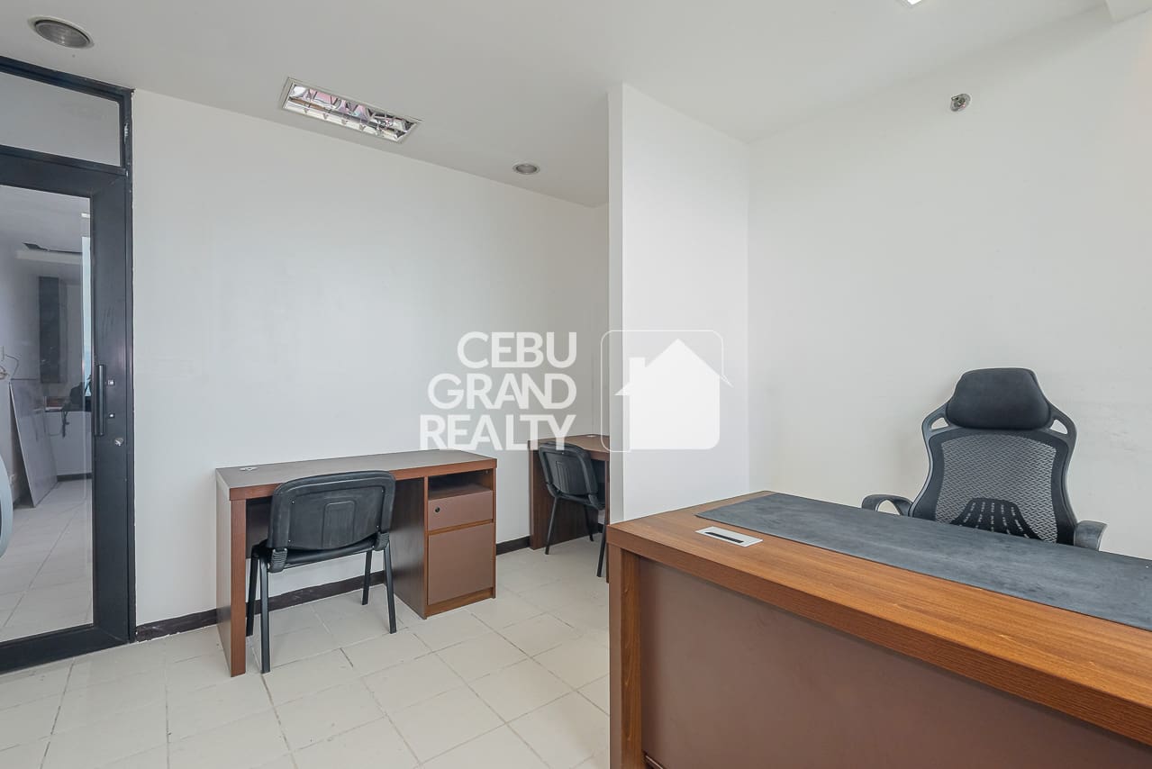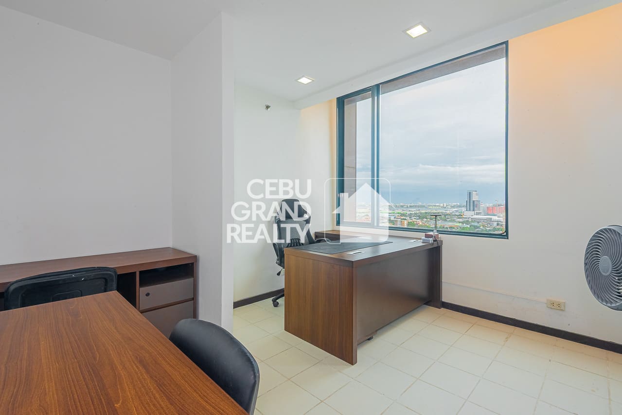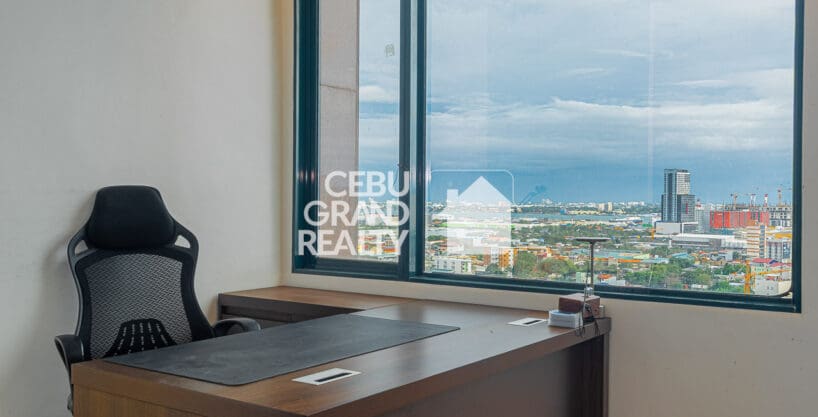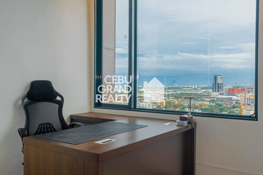 The unit features a bright, airy layout characterized by large picture windows that frame a stunning panoramic view of the Cebu cityscape and the sea. Specifically, inside the suite, you will find a well-appointed executive area with a large corner desk and ergonomic seating. In addition, this space is complemented by a separate workstation zone for support staff. Likewise, the unit boasts durable tiled flooring alongside clean white walls and sleek black-framed glass partitions.