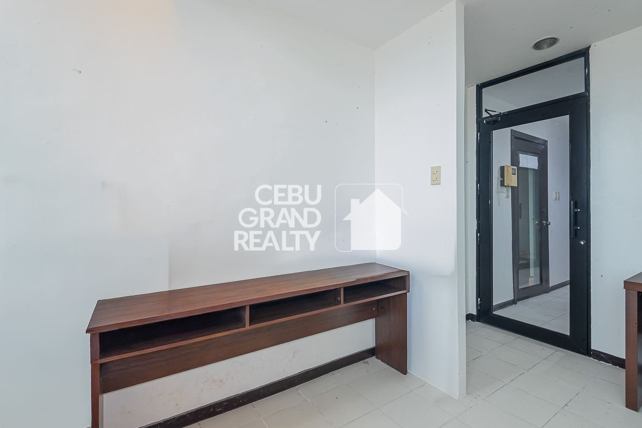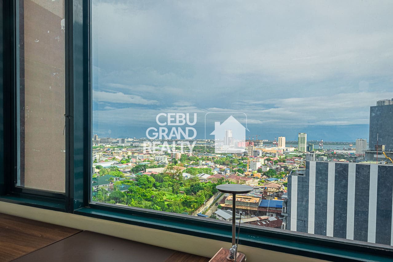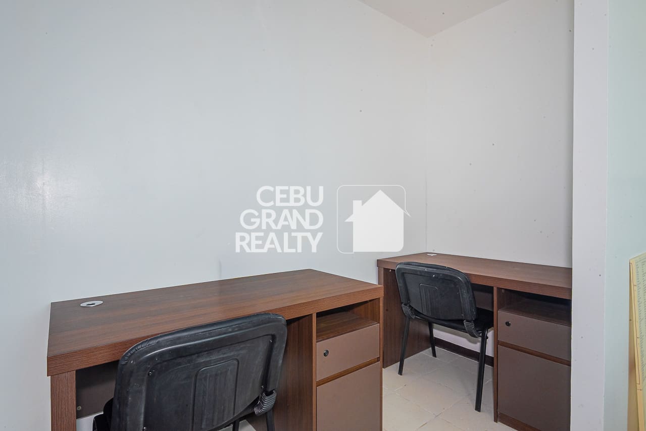 The unit features a bright, airy layout characterized by large picture windows that frame a stunning panoramic view of the Cebu cityscape and the sea. Specifically, inside the suite, you will find a well-appointed executive area with a large corner desk and ergonomic seating. In addition, this space is complemented by a separate workstation zone for support staff. Likewise, the unit boasts durable tiled flooring alongside clean white walls and sleek black-framed glass partitions.