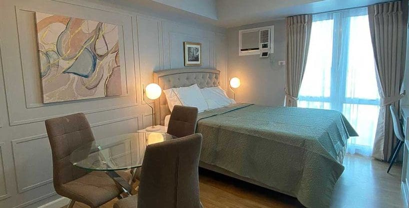 Discover modern living in this Modern Studio Apartment for Rent in Solinea, located at the heart of Cebu Business Park. This fully furnished studio boasts a stylish and comfortable sleeping area with an upholstered bed, alongside an open dining space featuring a glass table and cushioned chairs. The compact kitchen is designed for convenience, equipped with sleek white cabinetry, a stainless steel refrigerator, microwave, and built-in cooktop – perfect for preparing light meals at home. Soft neutral tones and sophisticated lighting create a bright, welcoming ambiance, enhanced by large windows with tasteful curtains.