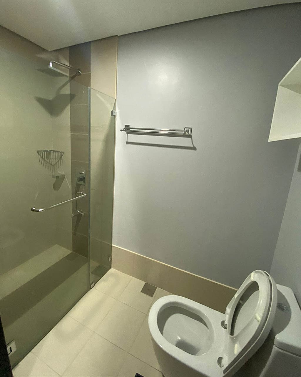 The bathroom completes the unit’s modern appeal, featuring a glass-enclosed shower, wall-mounted toilet, and minimalist fixtures. This Modern Studio Apartment for Rent in Solinea is perfect for professionals or couples, offering a harmonious blend of style and functionality in one of Cebu’s most desirable locations.