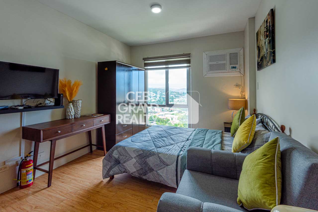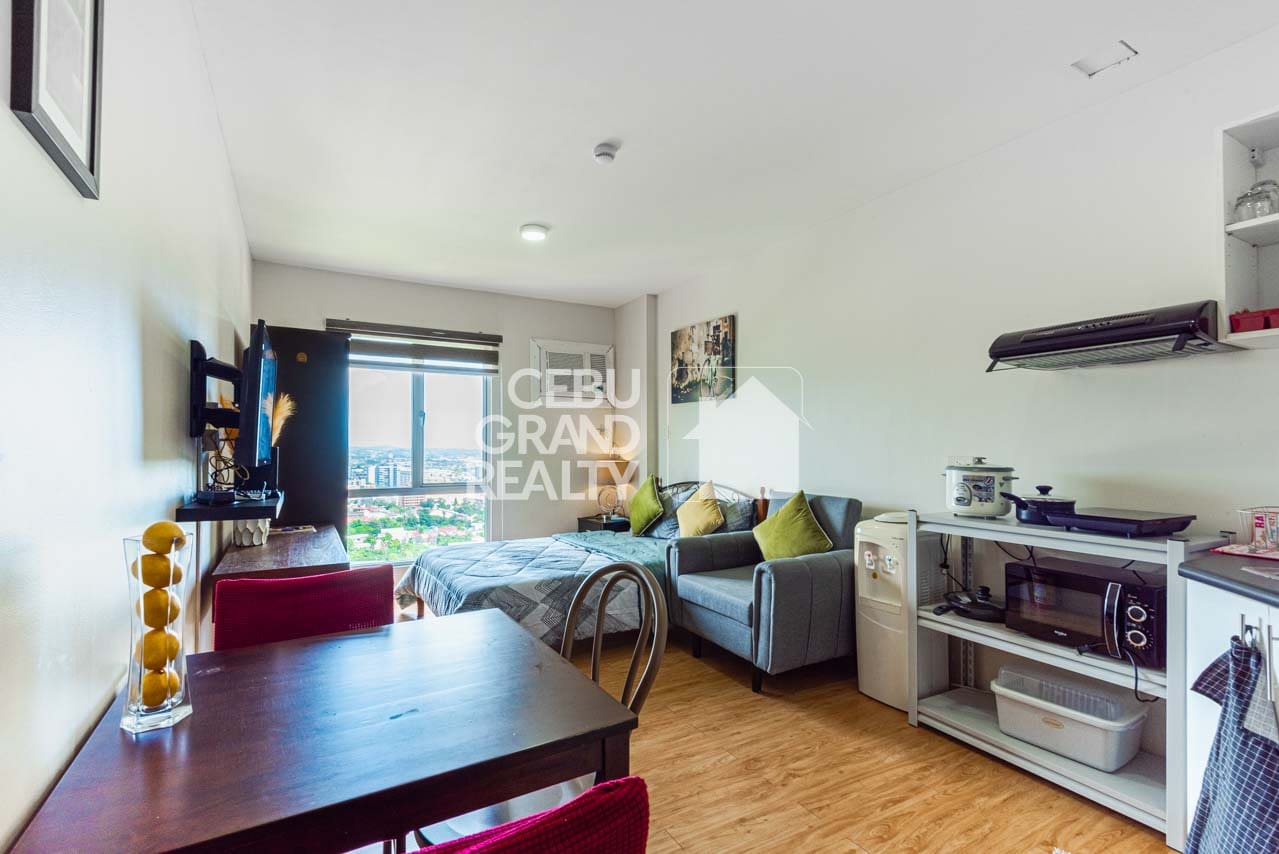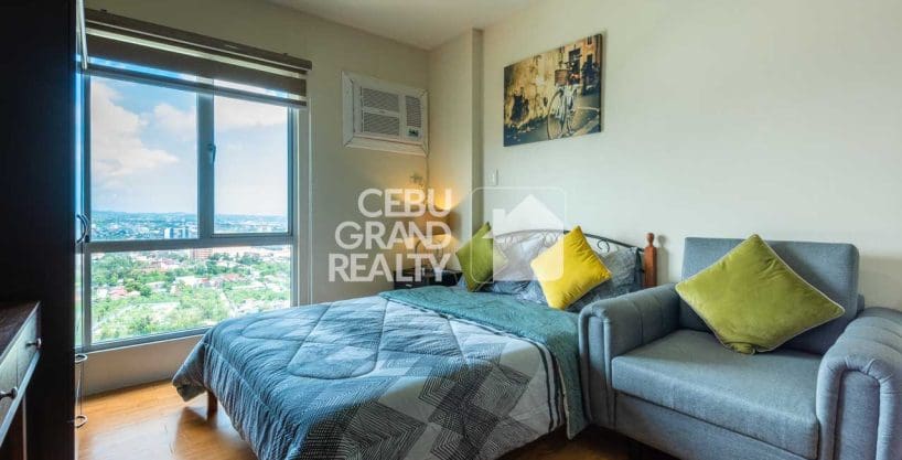 Welcome to this affordable studio apartment in Cebu City, where modern living meets convenience. This fully furnished, cozy studio offers a panoramic city view, flooding the space with natural light through a large window. The stylish living area, featuring a gray sofa and wall-mounted TV, seamlessly integrates with a well-equipped kitchenette, complete with essential appliances and ample storage. The comfortable bedroom area, adorned with elegant green and yellow accents, includes a wall-mounted air conditioning unit to ensure year-round comfort.