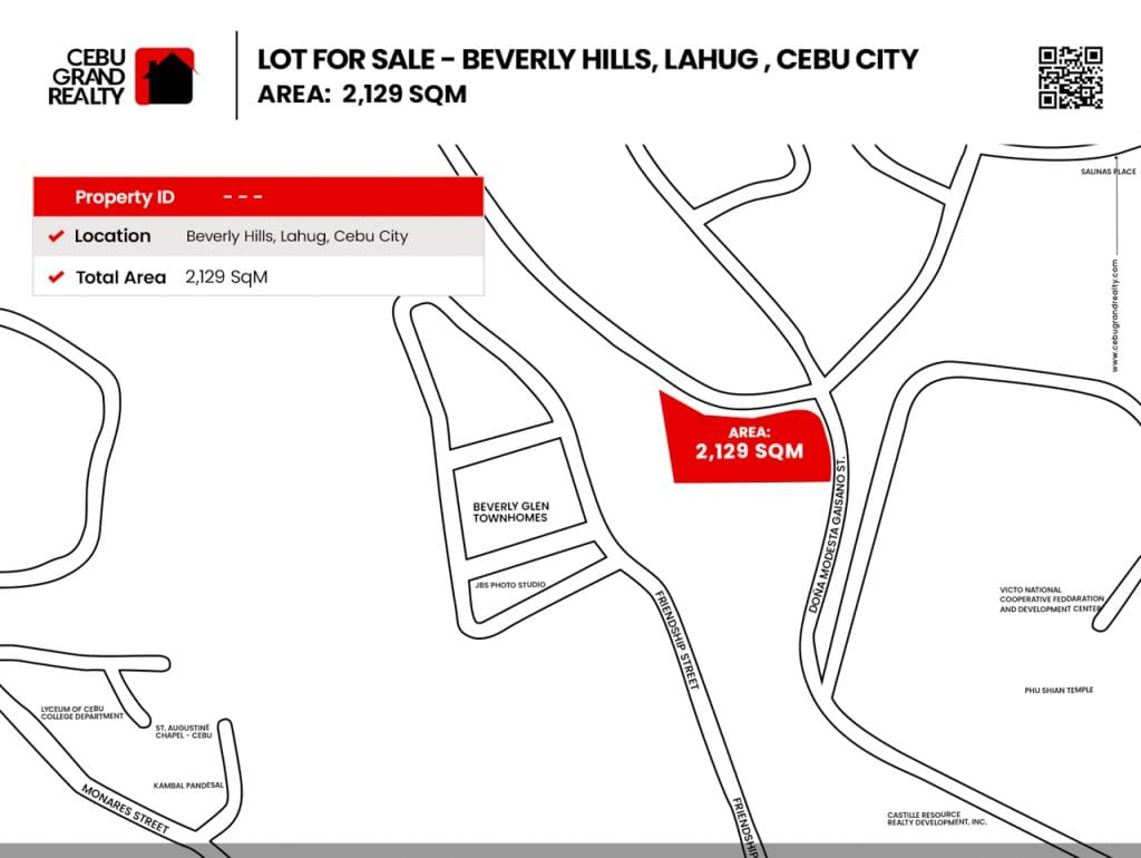 Build your dream castle or multi family homes on a large corner lot inside the original exclusive community of Beverly Hills Cebu. Or keep this overlooking (w/ partial city view) regularly shaped prime property as an investment &/or hedge against inflation. Seize the opportunity to own a prime real estate lot in Cebu, perfect for development and investment.