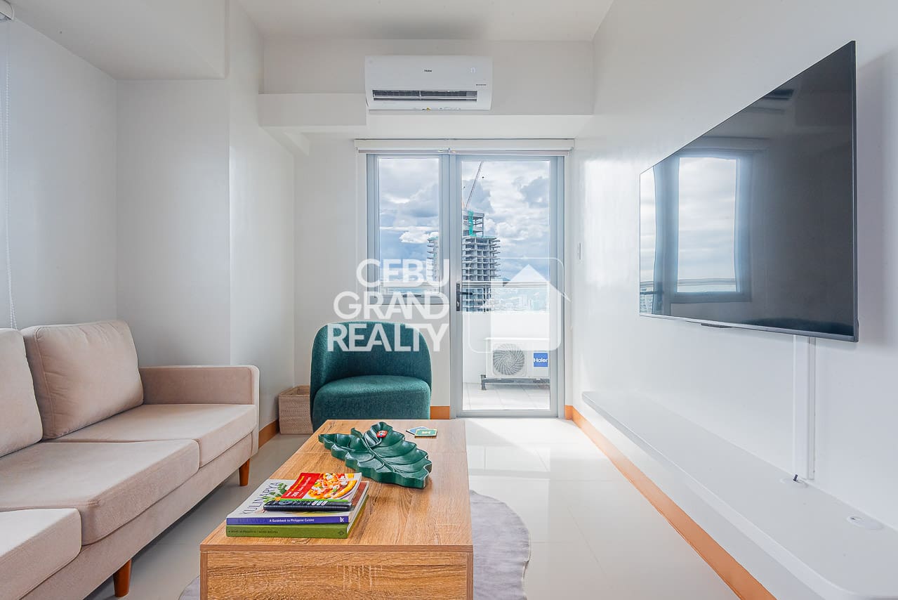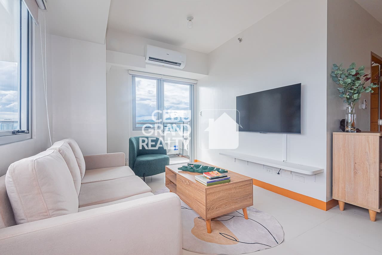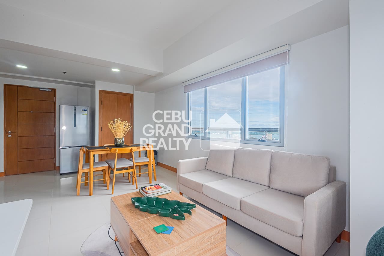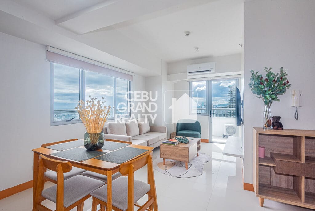 First, a standout feature of this high-floor unit is the glass sliding door. It opens up to a private balcony. Consequently, you can enjoy your morning coffee there. You will love gazing at the skyline and the calm sea. In addition, you have a clear view of the architectural CCLEX bridge. Inside, the design mirrors this tranquility. It features a plush beige sofa and a green accent chair. Furthermore, warm wooden textures cover the dining and living areas. Thus, every corner of this Scenic and Cozy Condo with Stunning Views in Mabolo ensures relaxation.