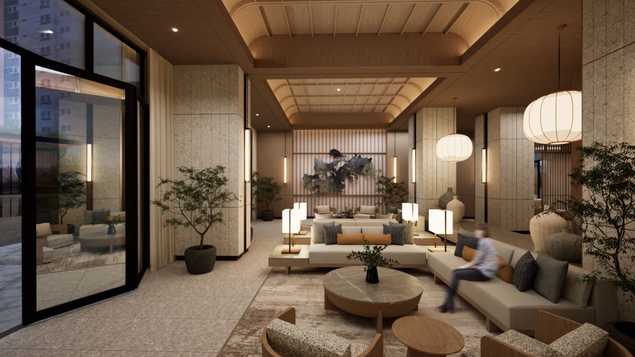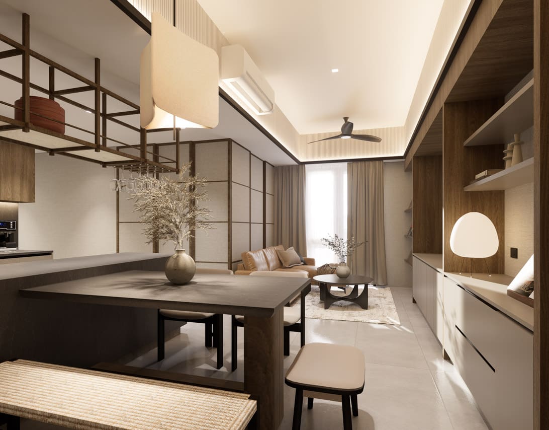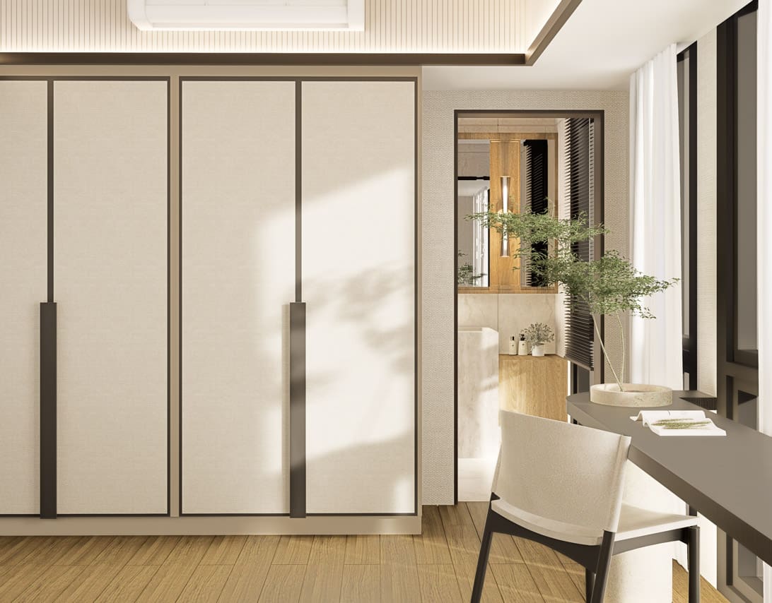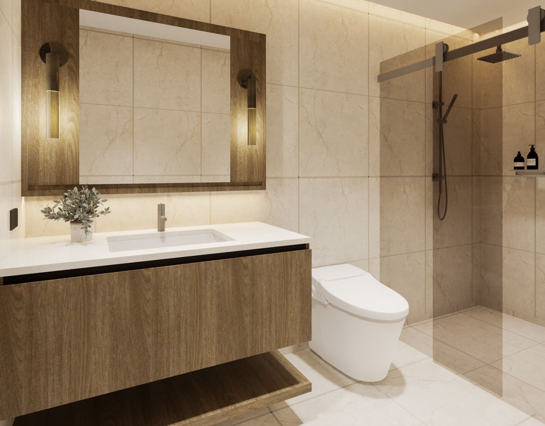 The expansive open concept living area is a masterclass in Japandi design, where form and function coexist in perfect harmony. Entertain guests or unwind in the chic living space, complete with a custom-built media wall and plush furnishings that invite relaxation. The adjoining gourmet kitchen is a chef’s dream, featuring sleek, dark stone countertops, state-of-the-art integrated appliances, and ample handleless cabinetry. Its centerpiece, a functional island that doubles as a stylish dining table, creates a natural hub for morning coffee or intimate dinners. Transitioning to private quarters, each bedroom serves as a personal retreat. Warm wood flooring, generous built-in storage, and large windows create a restful ambiance. The bathrooms echo a spa-like feel, with elegant floor-to-ceiling tiles, modern floating vanities, and luxurious walk-in rain showers, ensuring every day begins and ends in absolute comfort.