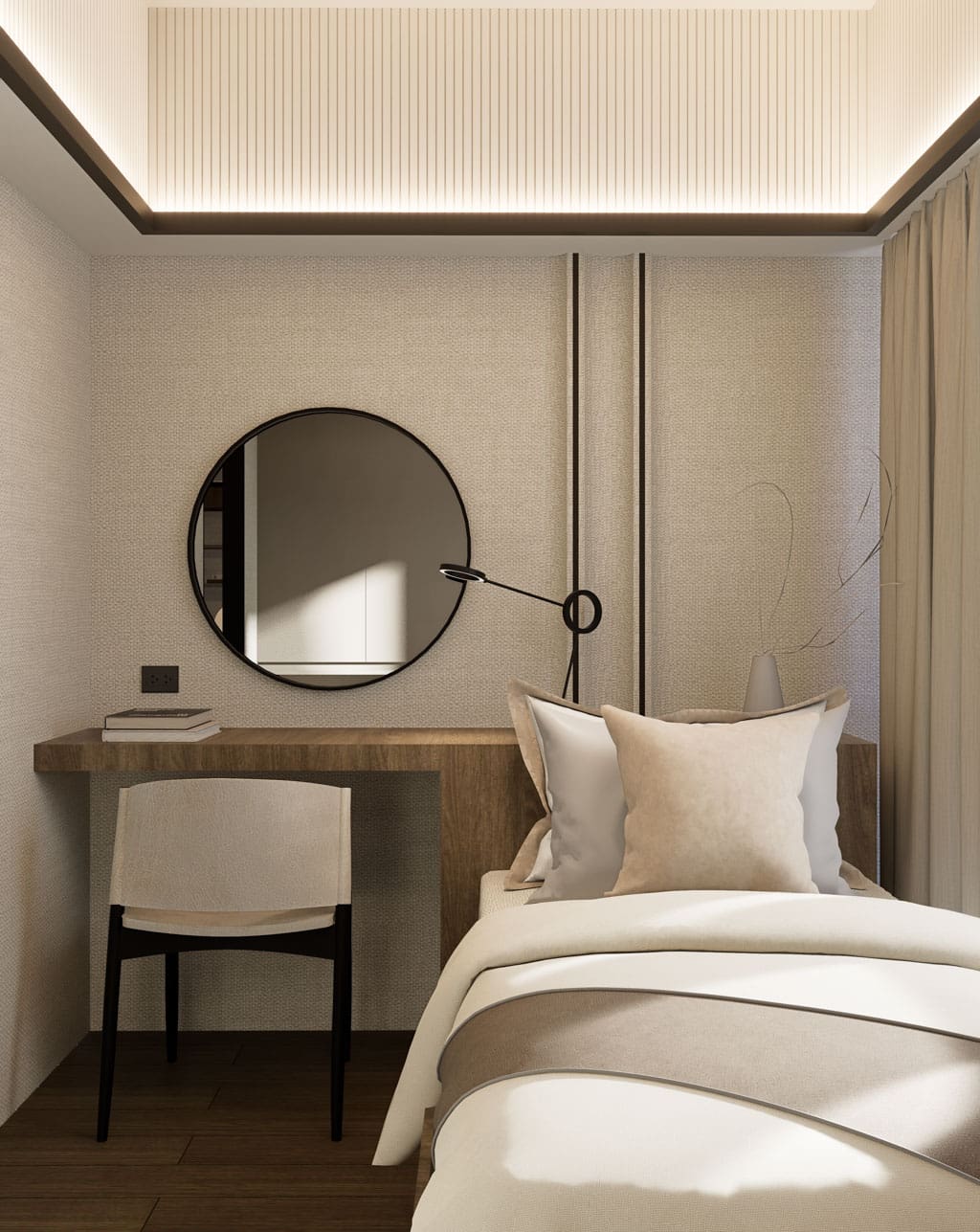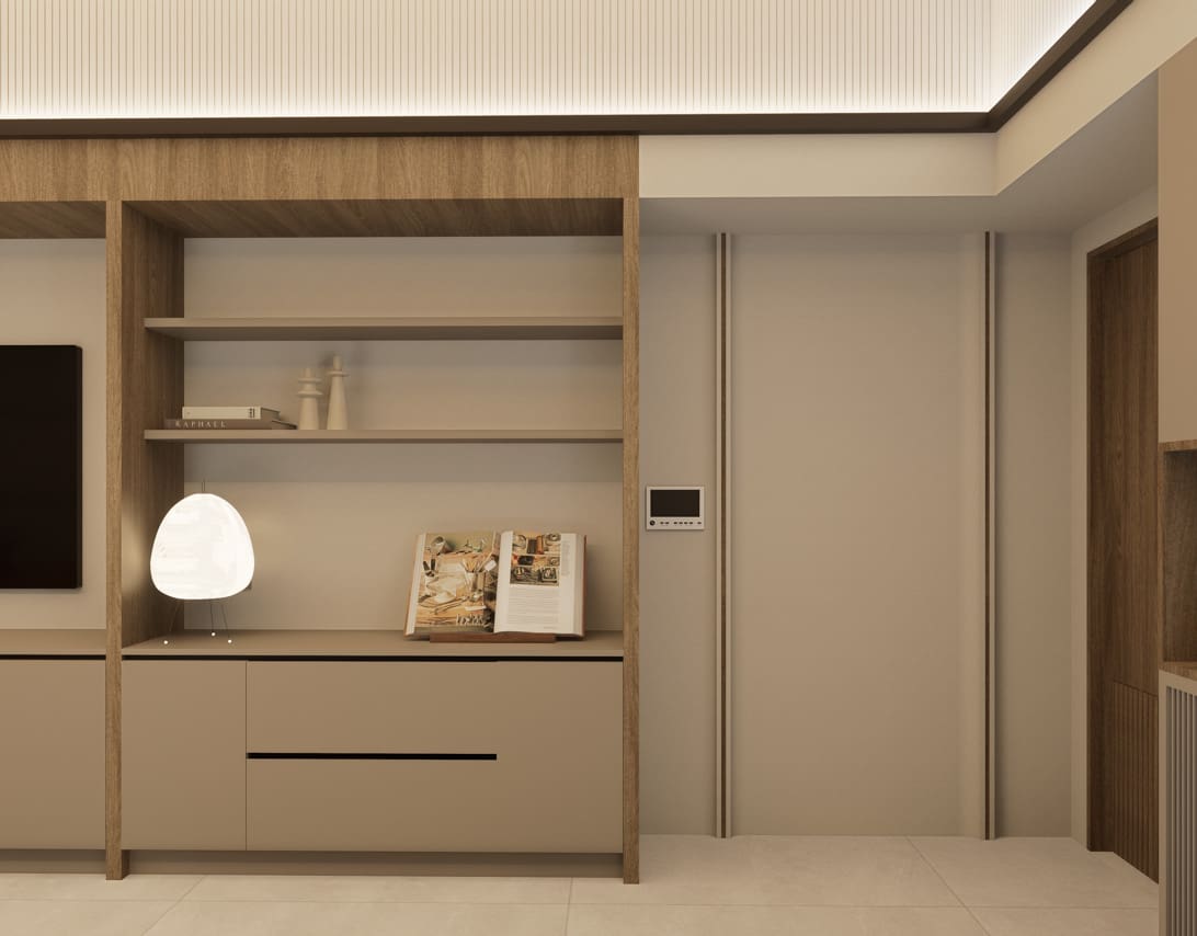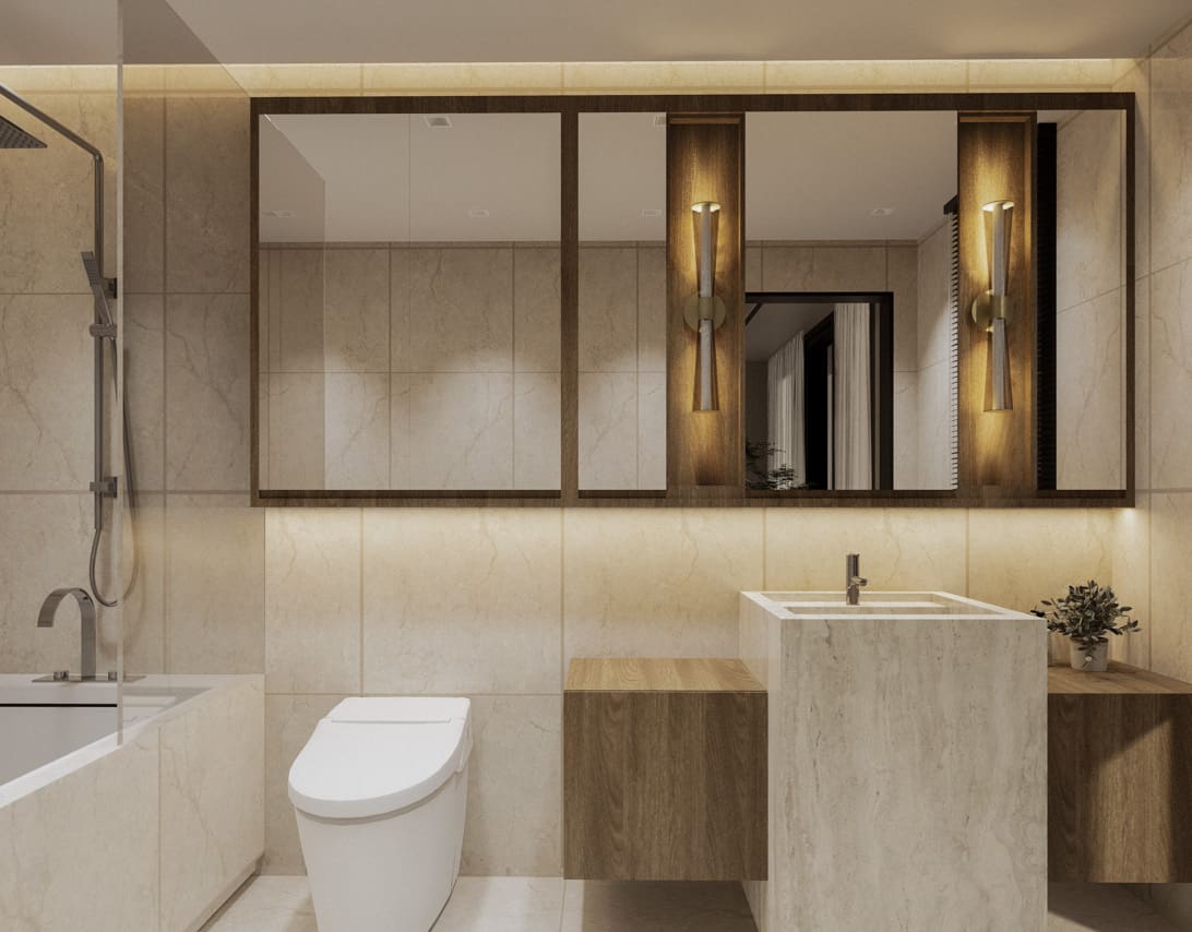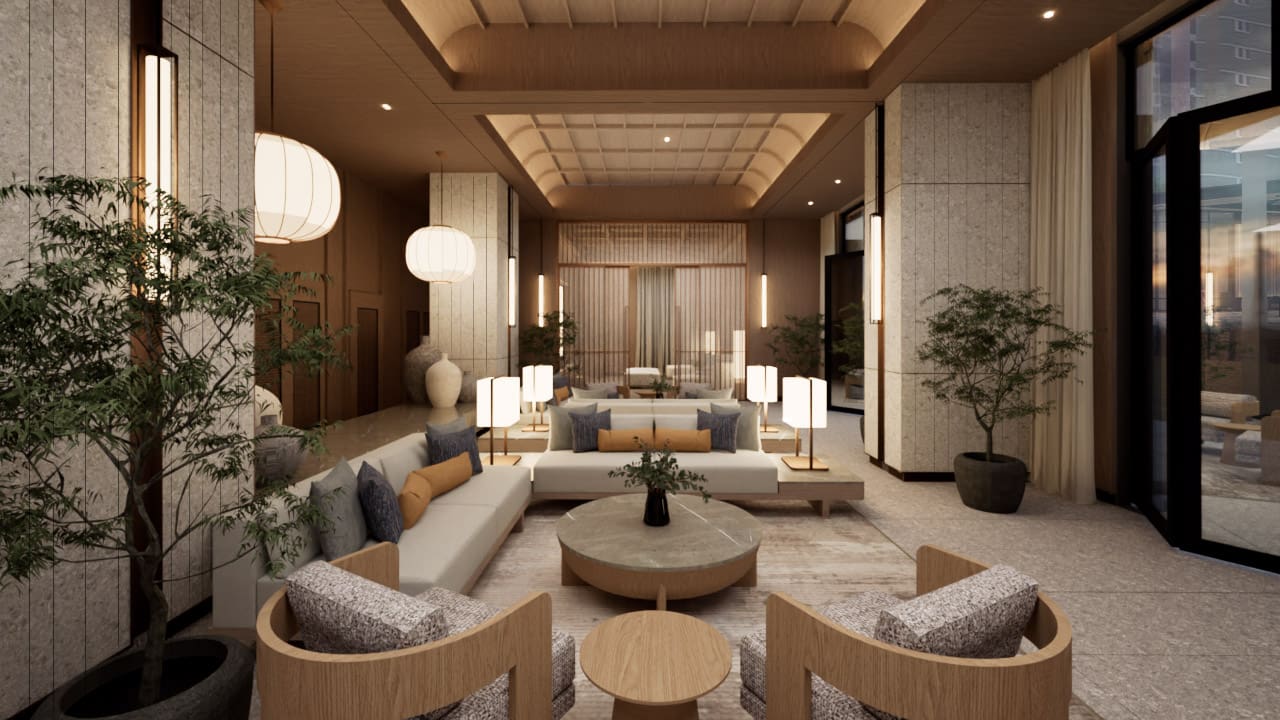 The expansive open concept living area is a masterclass in Japandi design, where form and function coexist in perfect harmony. Entertain guests or unwind in the chic living space, complete with a custom-built media wall and plush furnishings that invite relaxation. The adjoining gourmet kitchen is a chef’s dream, featuring sleek, dark stone countertops, state-of-the-art integrated appliances, and ample handleless cabinetry. Its centerpiece, a functional island that doubles as a stylish dining table, creates a natural hub for morning coffee or intimate dinners. Transitioning to private quarters, each bedroom serves as a personal retreat. Warm wood flooring, generous built-in storage, and large windows create a restful ambiance. The bathrooms echo a spa-like feel, with elegant floor-to-ceiling tiles, modern floating vanities, and luxurious walk-in rain showers, ensuring every day begins and ends in absolute comfort.