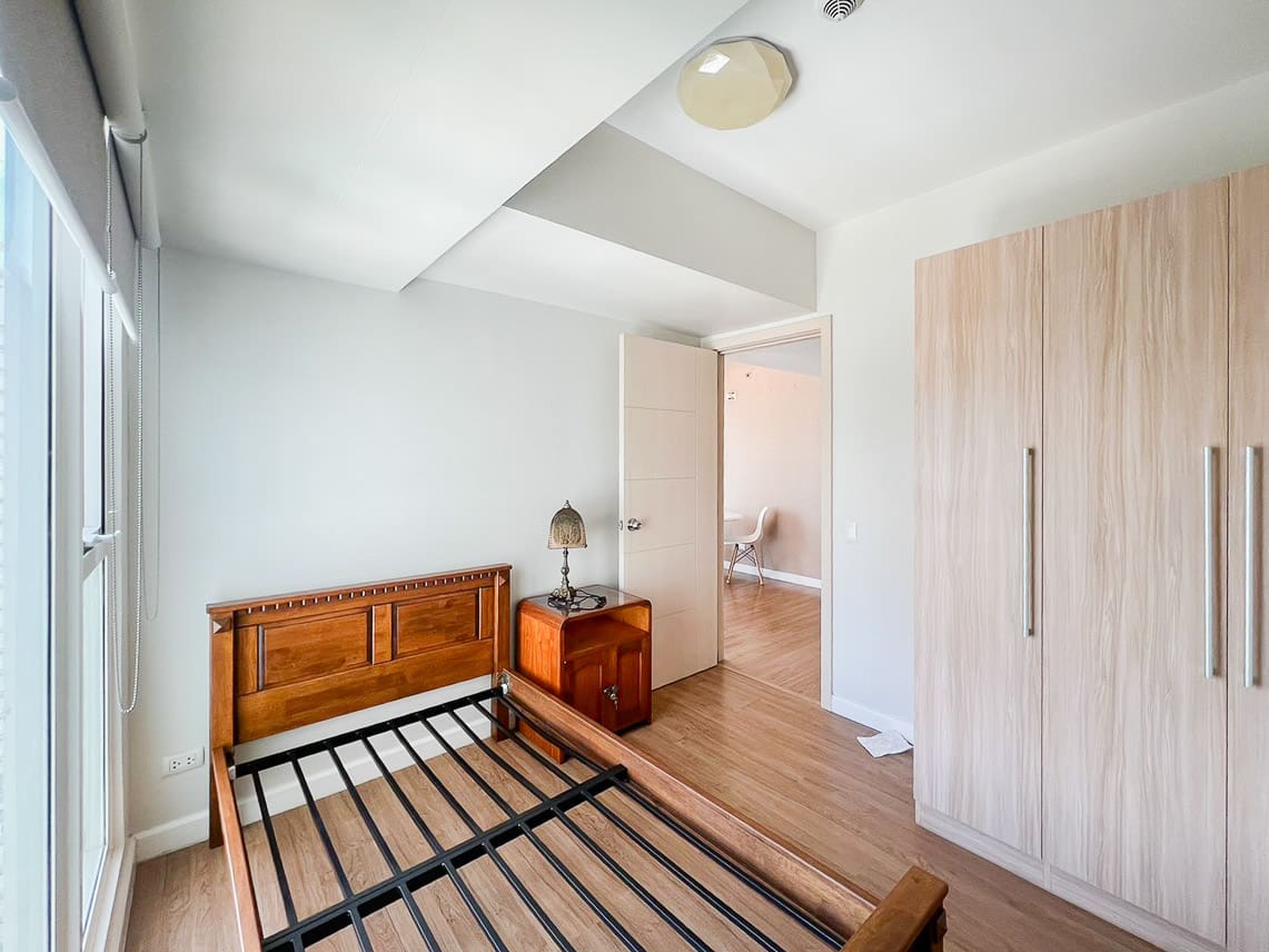 The spacious bedroom continues the theme of tasteful design, with a classic wooden bed frame, matching nightstands, and large windows that brighten the room. The clean and modern bathroom is fitted with a bidet, enclosed glass shower, and quality fixtures.