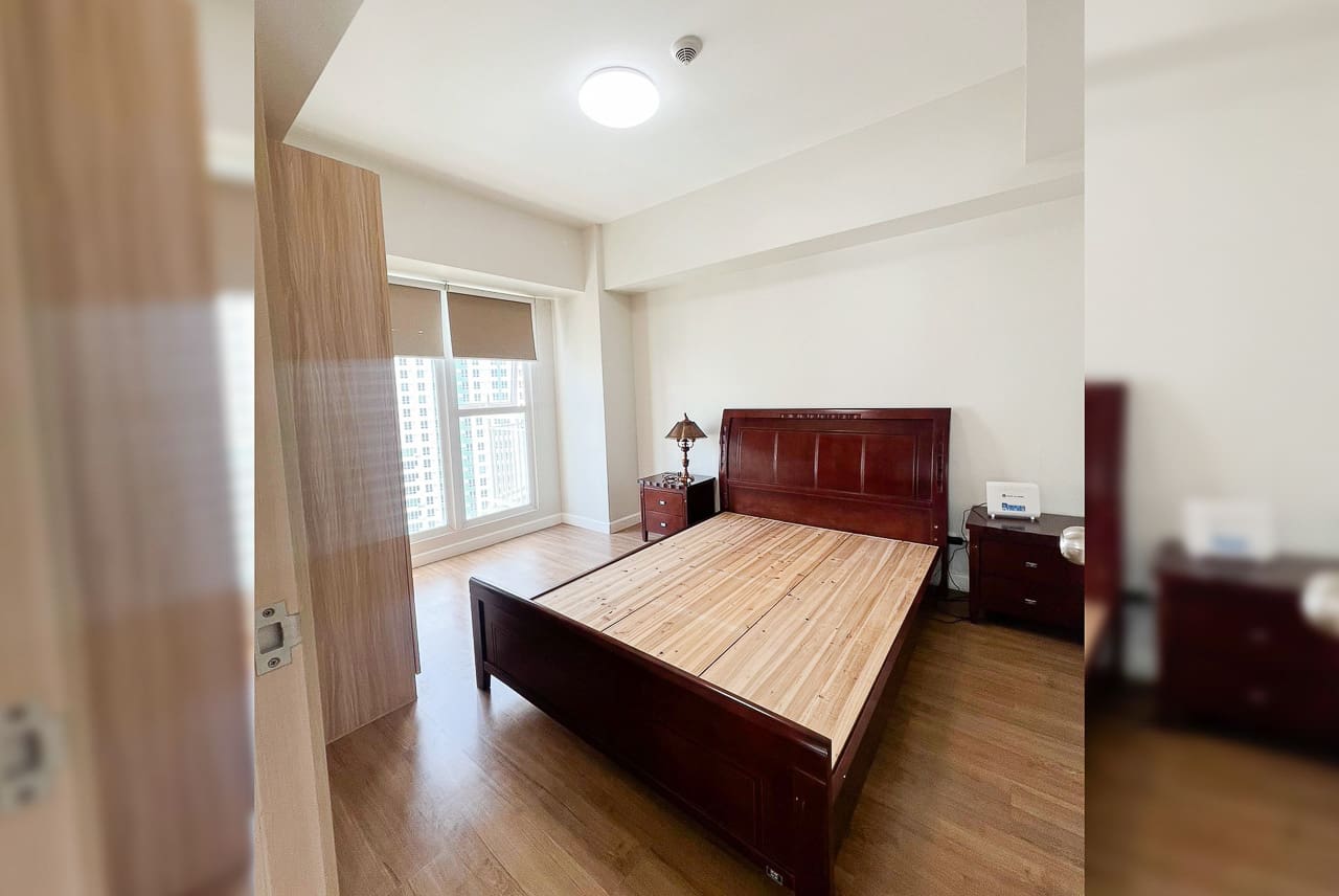 • Spacious bedroom with wooden bed frame and nightstands