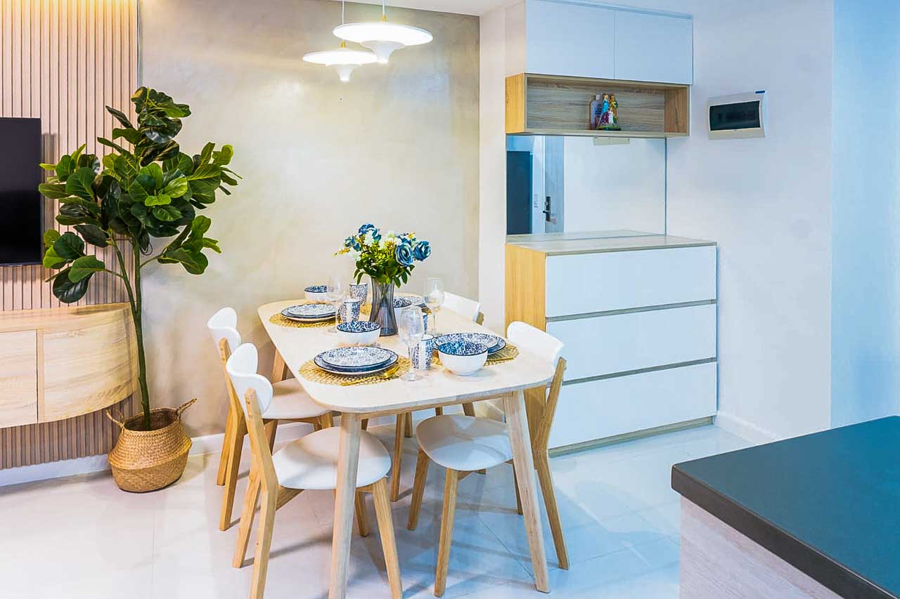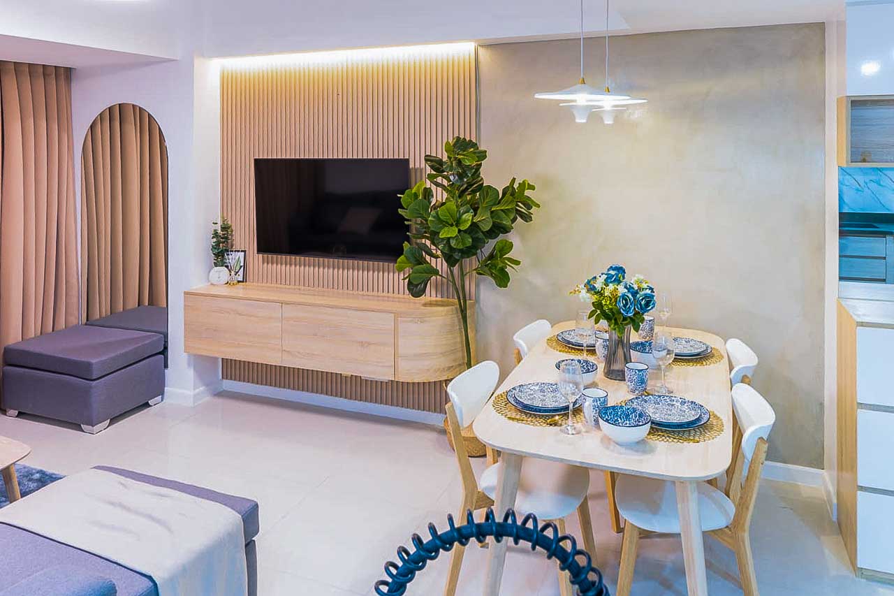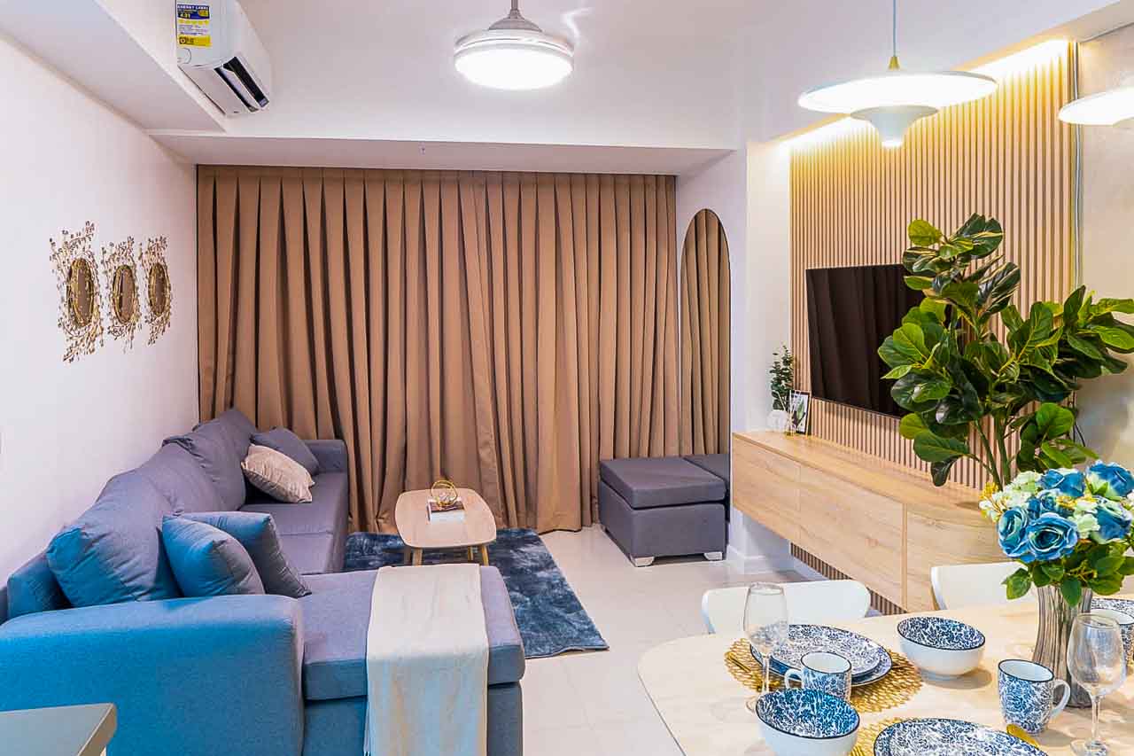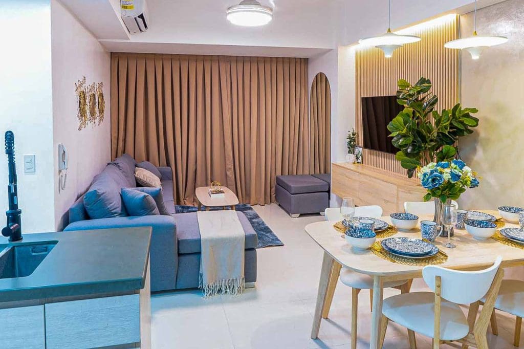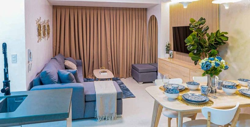 Welcome to your dream Condo in Mandani Bay! This luxury apartment combines elegance and functionality, featuring a modern kitchen with light wood cabinets, stainless steel appliances, and a sophisticated marble backsplash. The cozy living room with a blue sectional sofa and beige curtains seamlessly flows into the elegant dining area set with blue and white dinnerware, perfect for entertaining guests. Relax in the serene bedroom with beige curtains, blue accents, and built-in storage, providing ample space and natural light. The stylish bathroom boasts marble-tiled walls, dark gray countertops, and wooden shelves, adding a warm touch to this luxurious space.