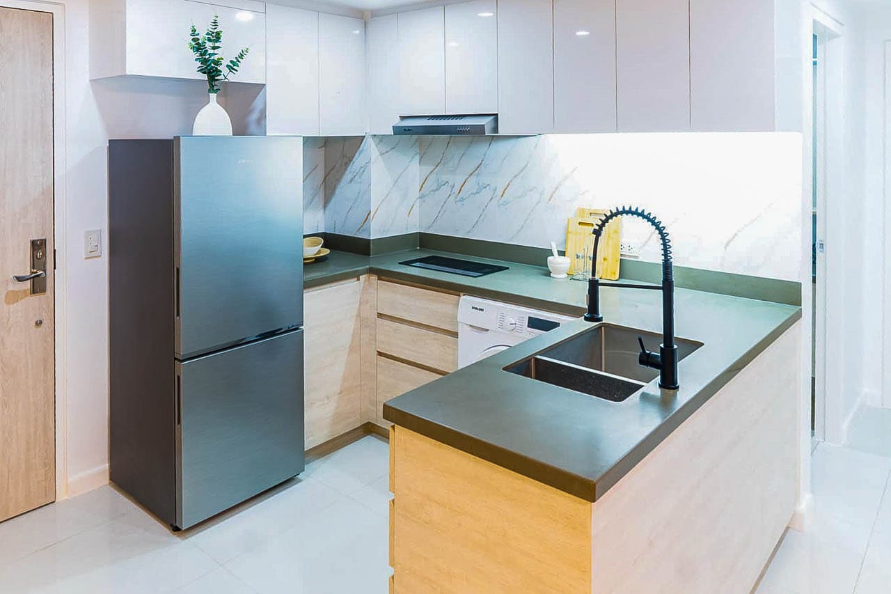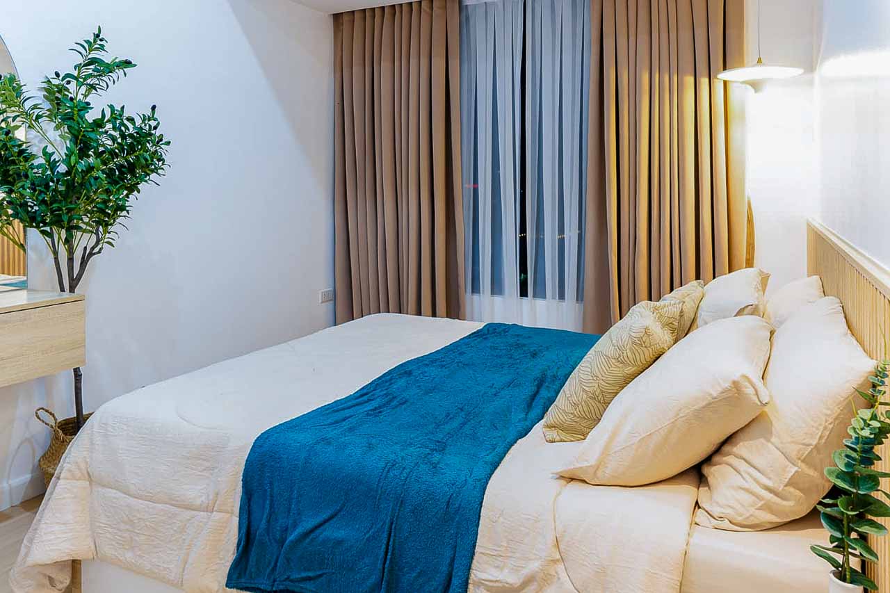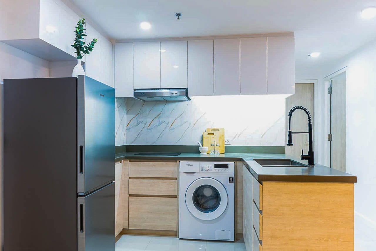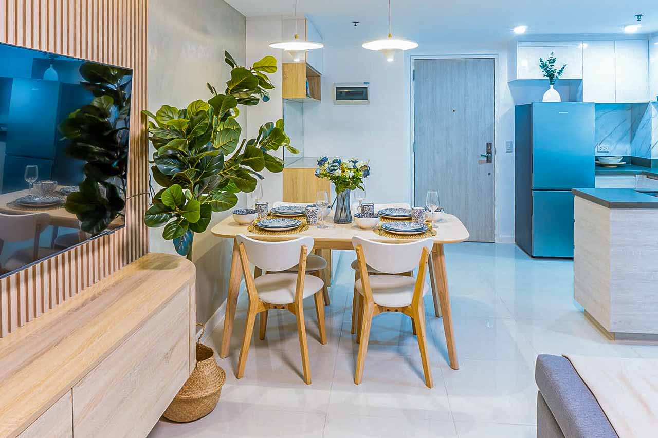 Welcome to your dream Condo in Mandani Bay! This luxury apartment combines elegance and functionality, featuring a modern kitchen with light wood cabinets, stainless steel appliances, and a sophisticated marble backsplash. The cozy living room with a blue sectional sofa and beige curtains seamlessly flows into the elegant dining area set with blue and white dinnerware, perfect for entertaining guests. Relax in the serene bedroom with beige curtains, blue accents, and built-in storage, providing ample space and natural light. The stylish bathroom boasts marble-tiled walls, dark gray countertops, and wooden shelves, adding a warm touch to this luxurious space.