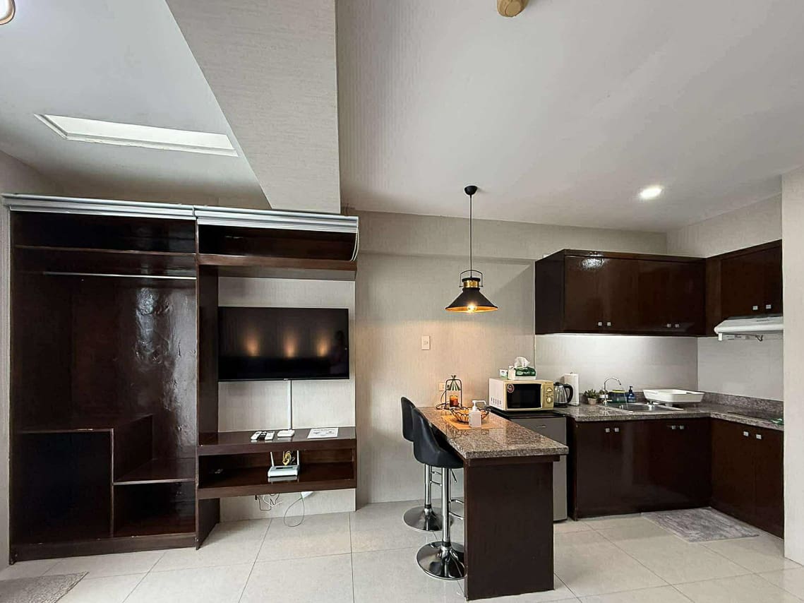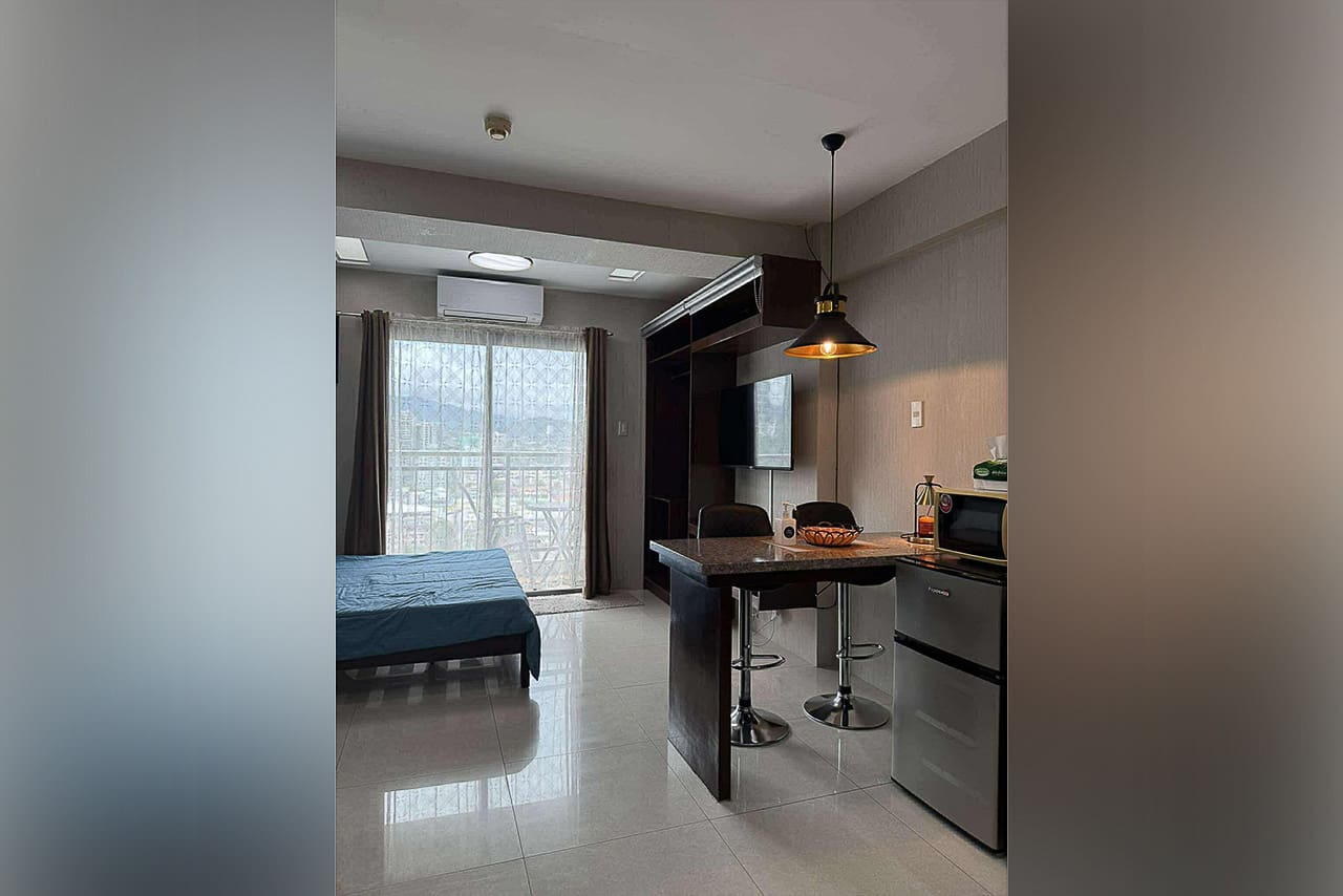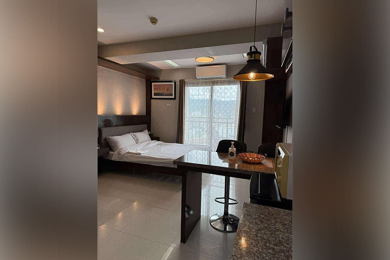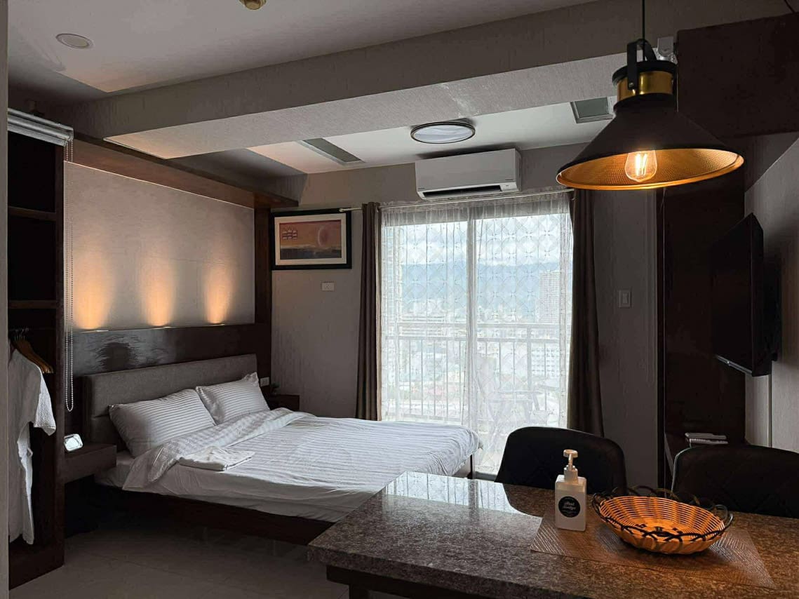 This matching style ties the room together. In fact, the space flows from the quiet sleeping area to the stylish dining bar. Plus, the bed has soft headboard lighting, while the bar is lit by a cool pendant light. Next, the L-shaped kitchen is compact but fully equipped for your cooking needs. Additionally, the sleek, modern bathroom has a stone accent wall and a water heater. Furthermore, every detail was chosen for comfort, such as the glossy floor tiles and the split-type air conditioner. The private balcony, however, is the true highlight. Without a doubt, it's a perfect spot for morning coffee or enjoying the city lights. This studio for sale in Ramos Cebu truly offers breathtaking cityscape views.