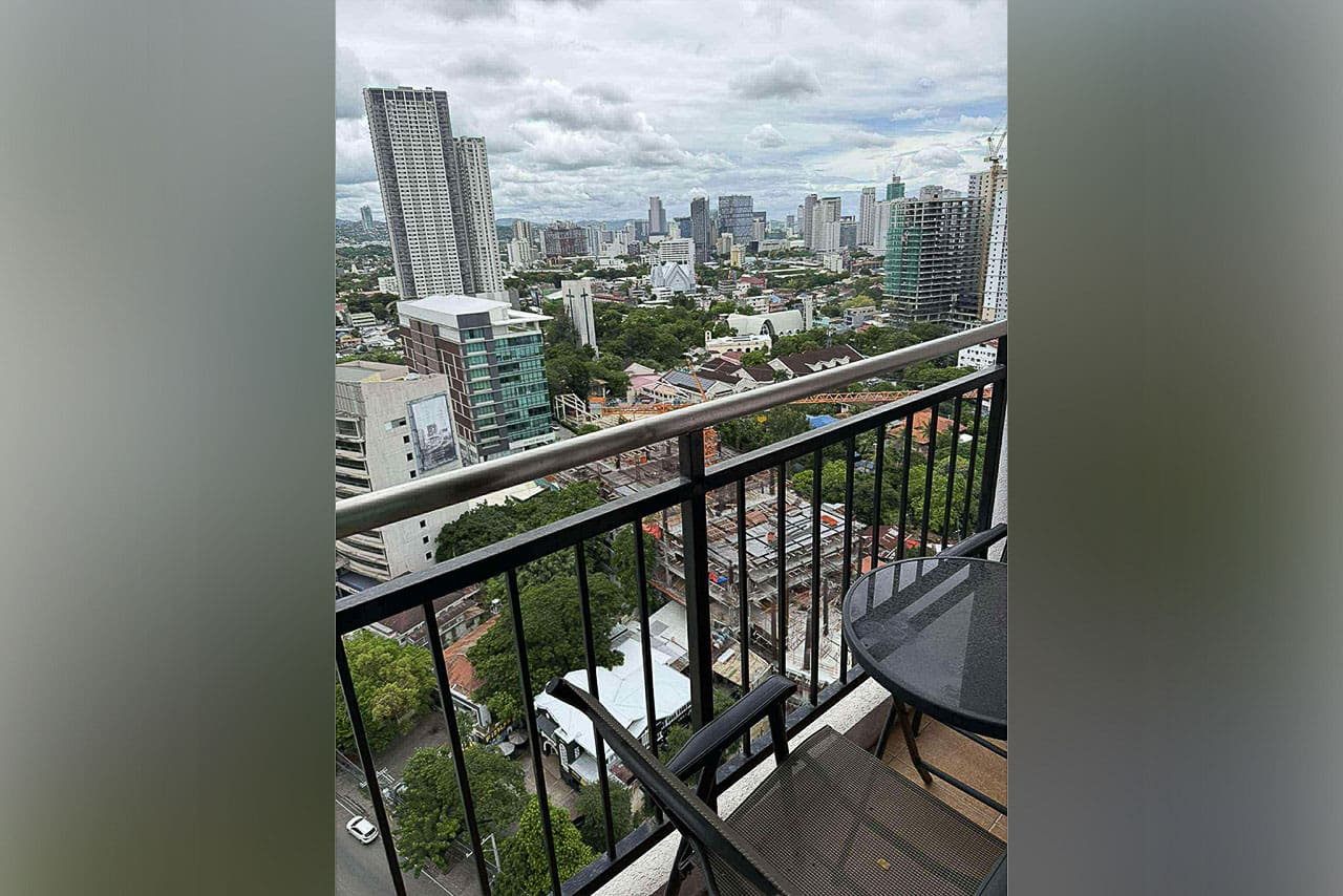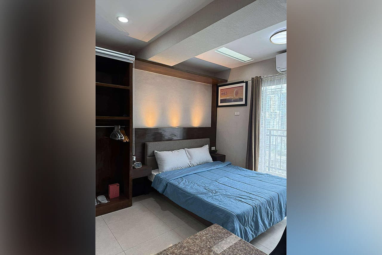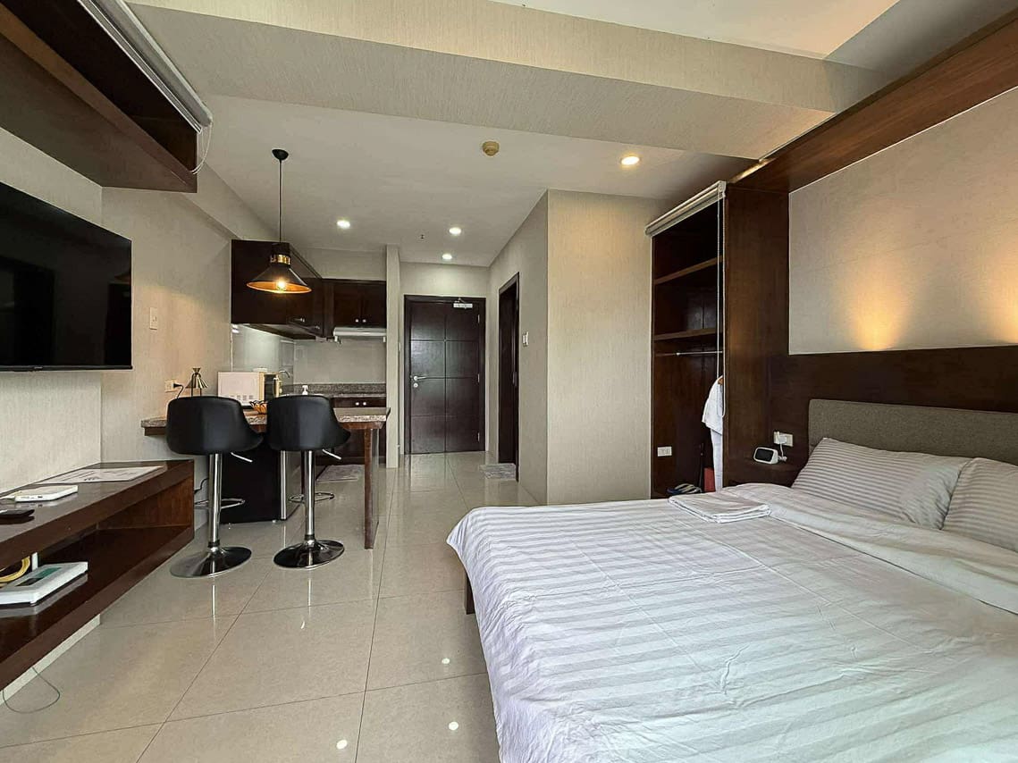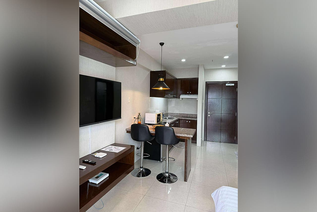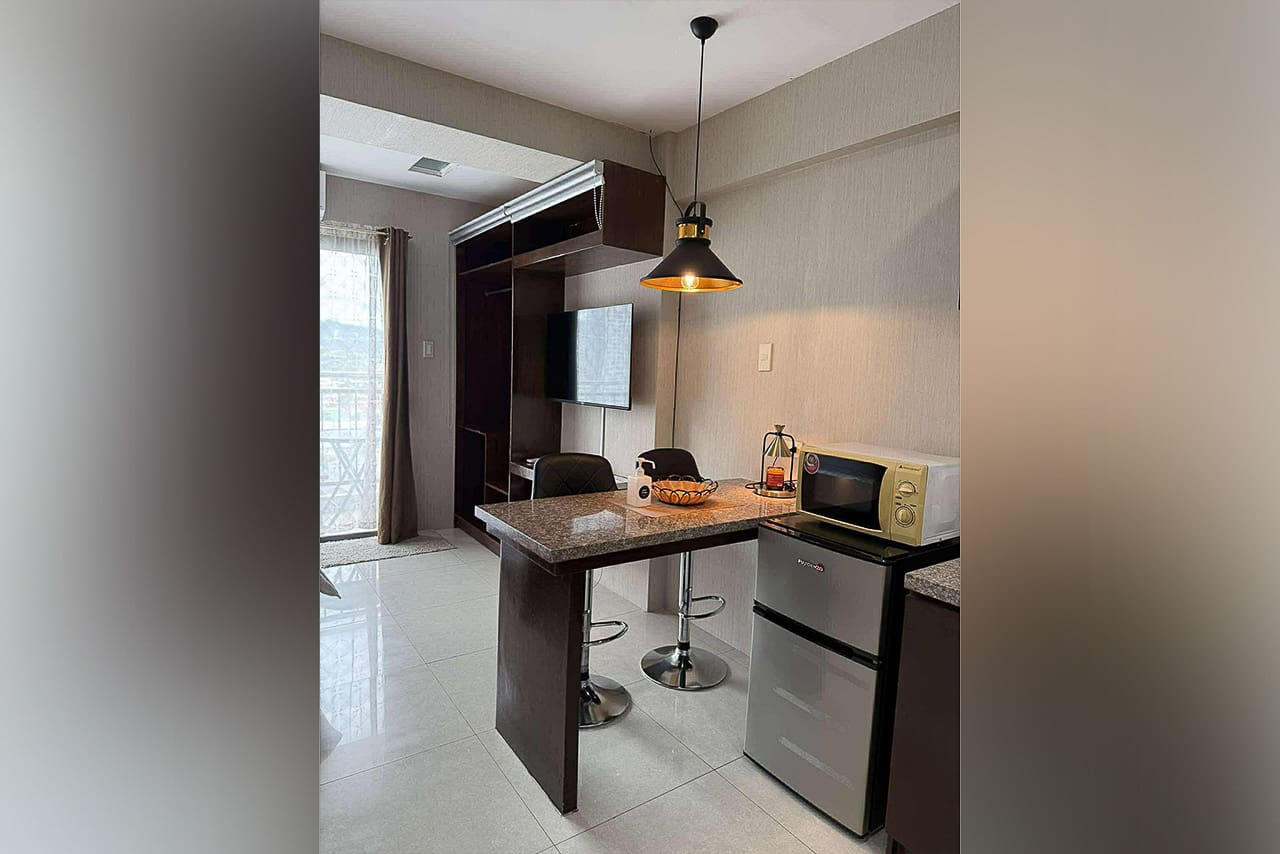 This matching style ties the room together. In fact, the space flows from the quiet sleeping area to the stylish dining bar. Plus, the bed has soft headboard lighting, while the bar is lit by a cool pendant light. Next, the L-shaped kitchen is compact but fully equipped for your cooking needs. Additionally, the sleek, modern bathroom has a stone accent wall and a water heater. Furthermore, every detail was chosen for comfort, such as the glossy floor tiles and the split-type air conditioner. The private balcony, however, is the true highlight. Without a doubt, it's a perfect spot for morning coffee or enjoying the city lights. This studio for sale in Ramos Cebu truly offers breathtaking cityscape views.