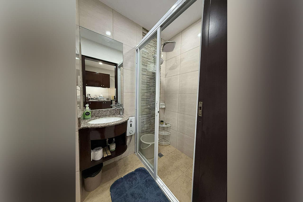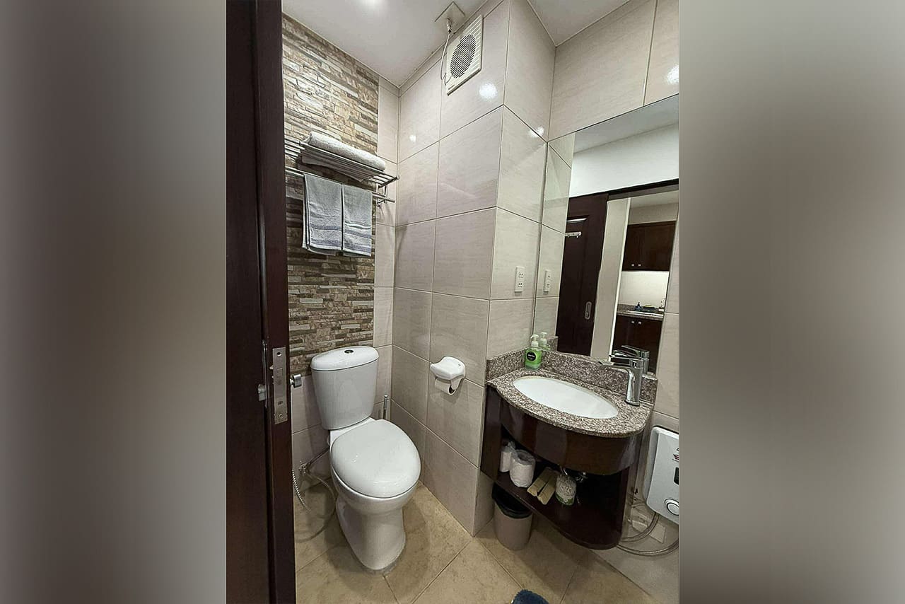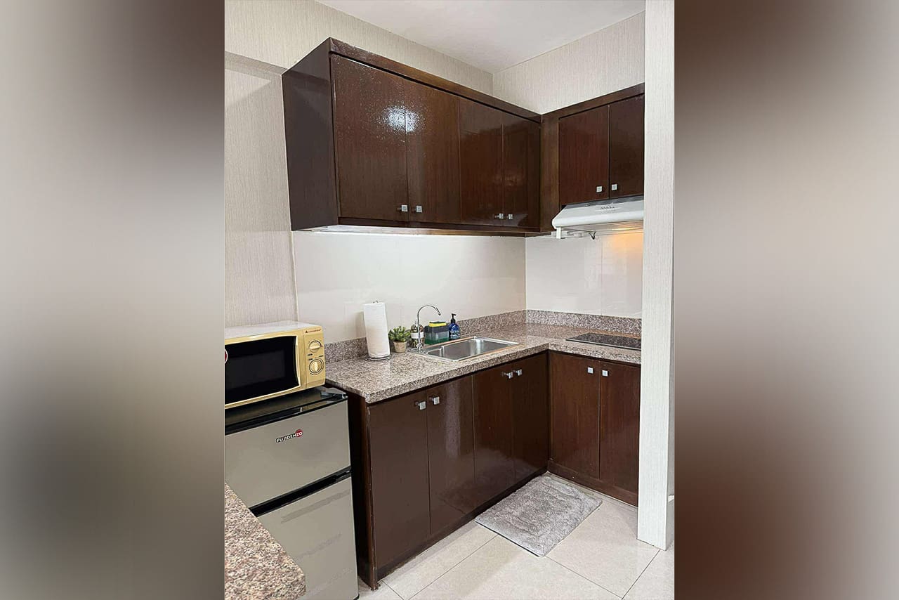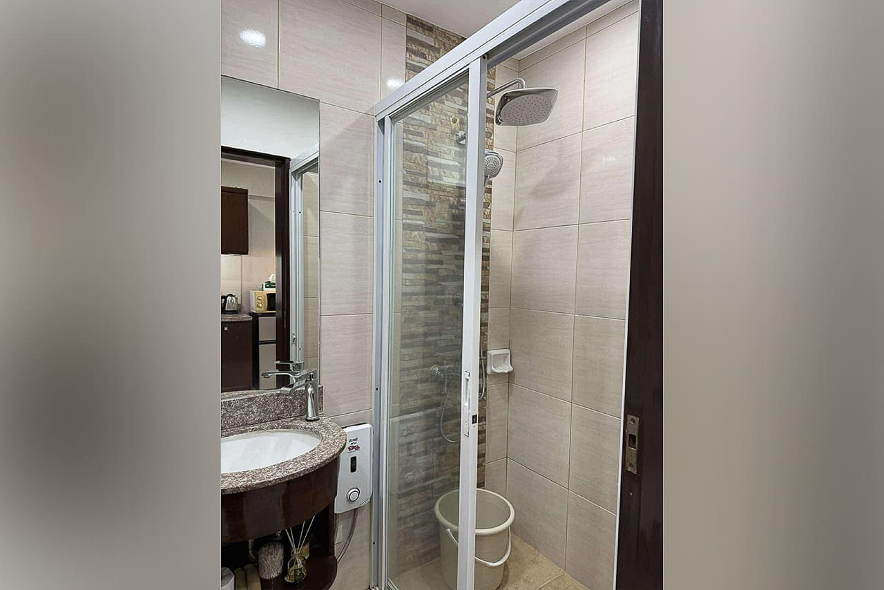 This matching style ties the room together. In fact, the space flows from the quiet sleeping area to the stylish dining bar. Plus, the bed has soft headboard lighting, while the bar is lit by a cool pendant light. Next, the L-shaped kitchen is compact but fully equipped for your cooking needs. Additionally, the sleek, modern bathroom has a stone accent wall and a water heater. Furthermore, every detail was chosen for comfort, such as the glossy floor tiles and the split-type air conditioner. The private balcony, however, is the true highlight. Without a doubt, it's a perfect spot for morning coffee or enjoying the city lights. This studio for sale in Ramos Cebu truly offers breathtaking cityscape views.
