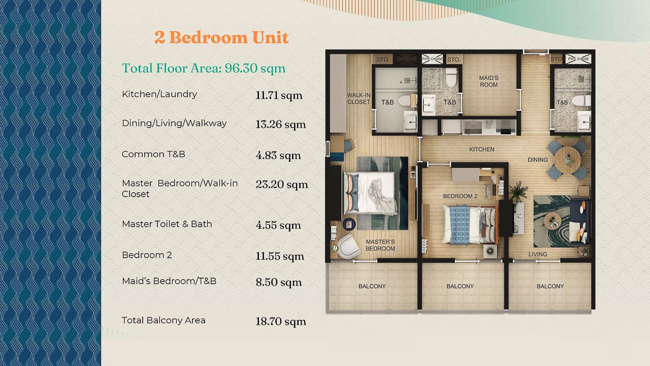 Specifically, this residence is crafted for those who demand more space and better views. For instance, the layout features two generous bedrooms and a dedicated maid’s room. Consequently, this ensures functionality for the whole family. Additionally, the highlight is the expansive 18.70 sqm wrap-around balcony. This space offers seamless indoor-outdoor living. Similarly, you can enjoy the fresh sea breeze every morning from your room. Inside, the master suite serves as a private sanctuary. For this reason, it includes its own walk-in closet and ensuite bath. If what you seek is a condo featuring a private balcony and the unique lifestyle offered at Costa Mira, this unit is a top choice.