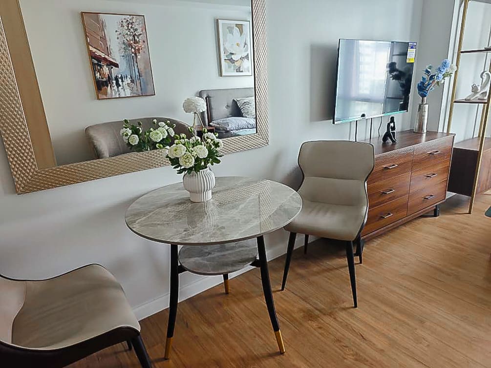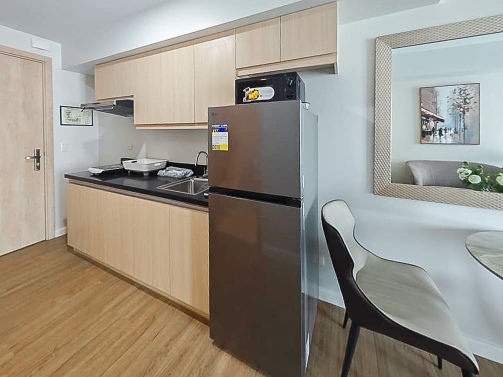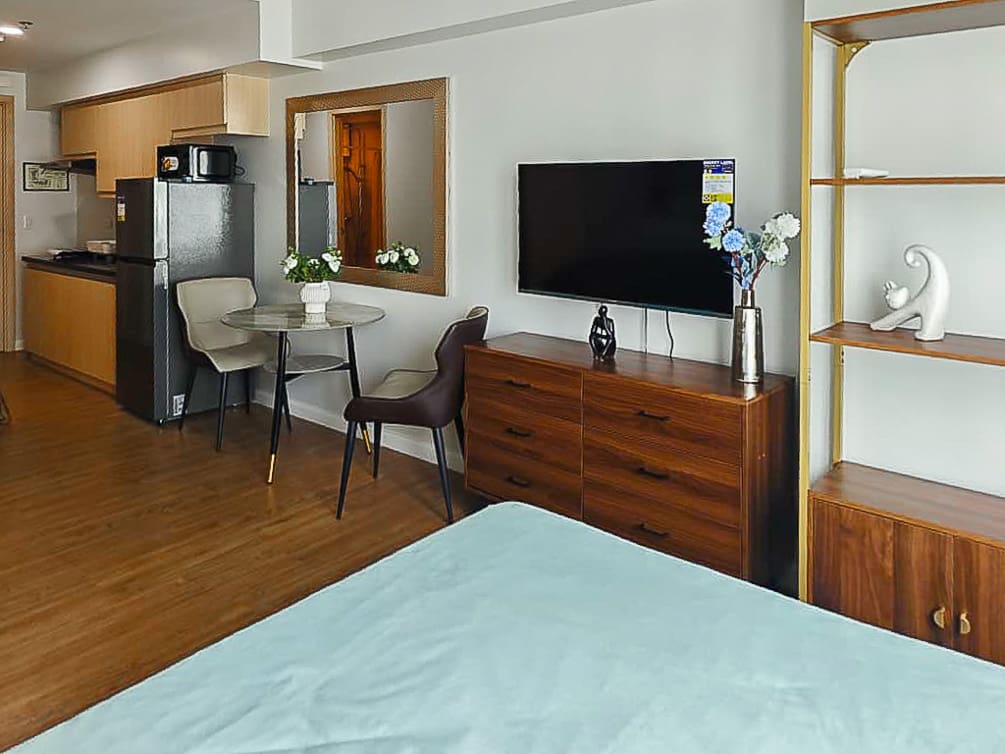 A sleek kitchenette equipped with essential appliances completes this Stylish Studio Condo in Solinea Tower 4, making it truly move-in ready. With tasteful furnishings, warm wood flooring, and efficient storage solutions, this unit delivers both style and convenience in one of Cebu City’s most prime residential addresses.