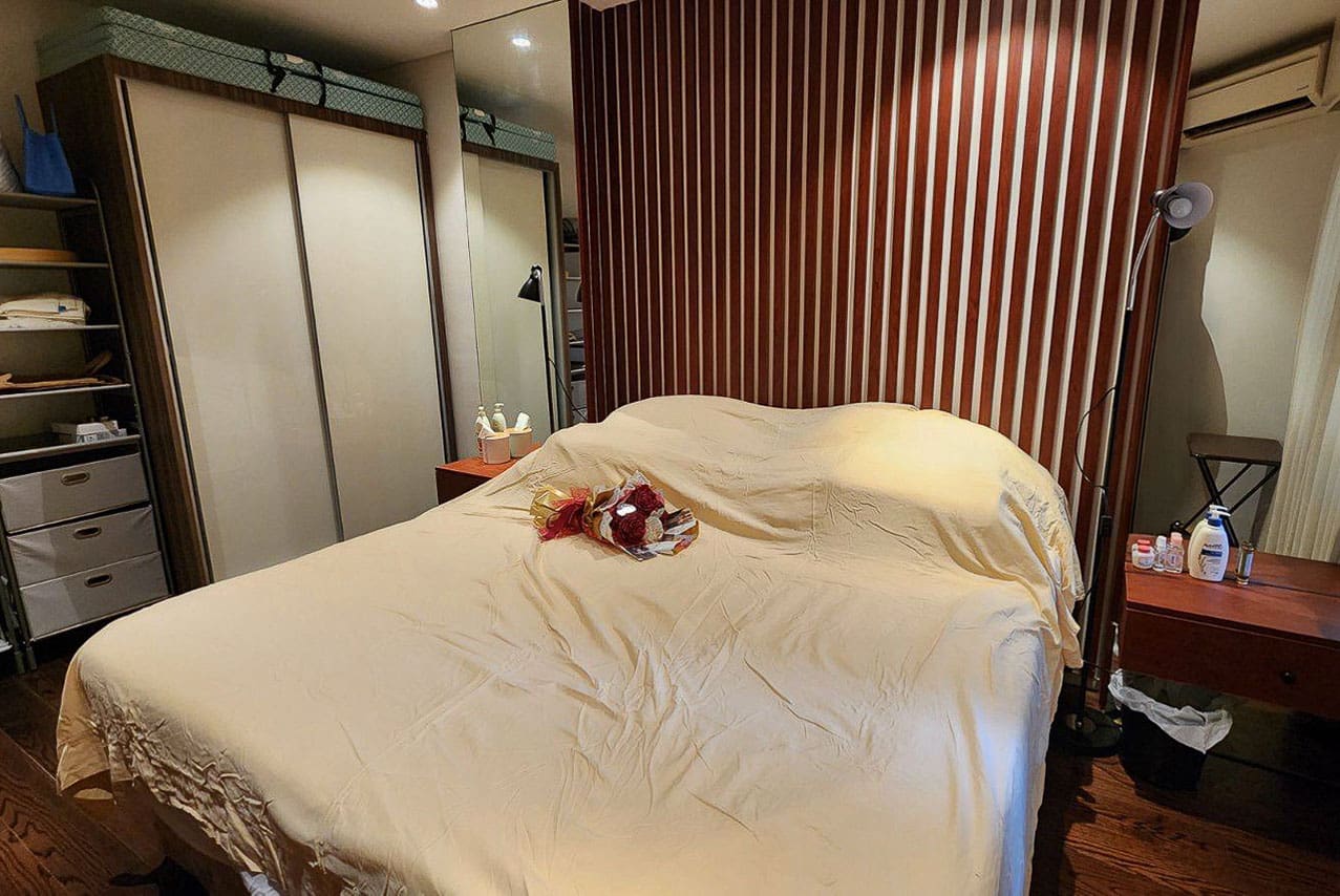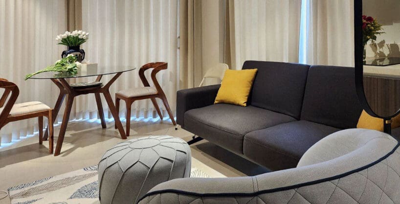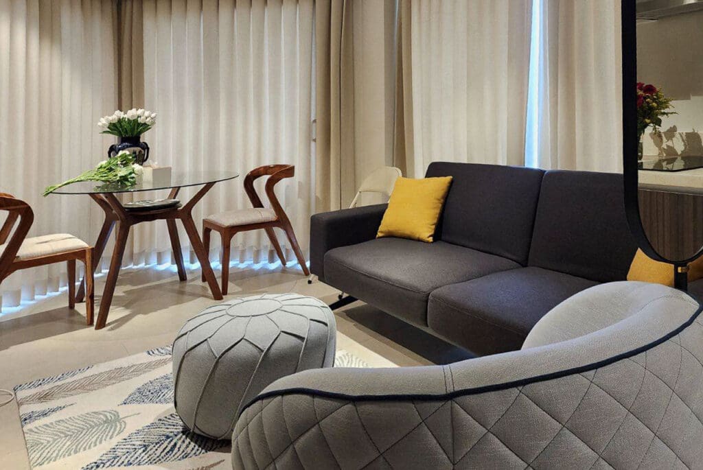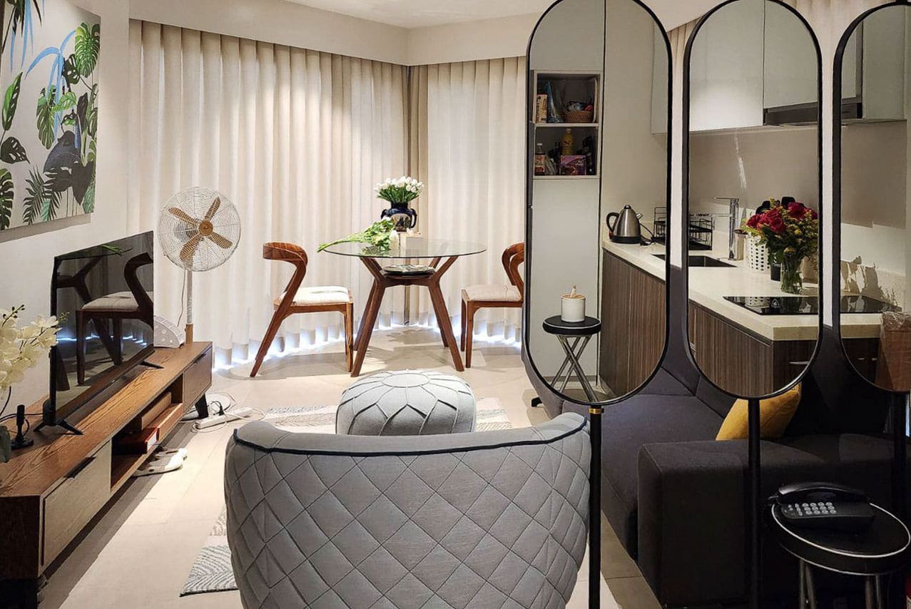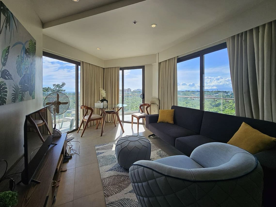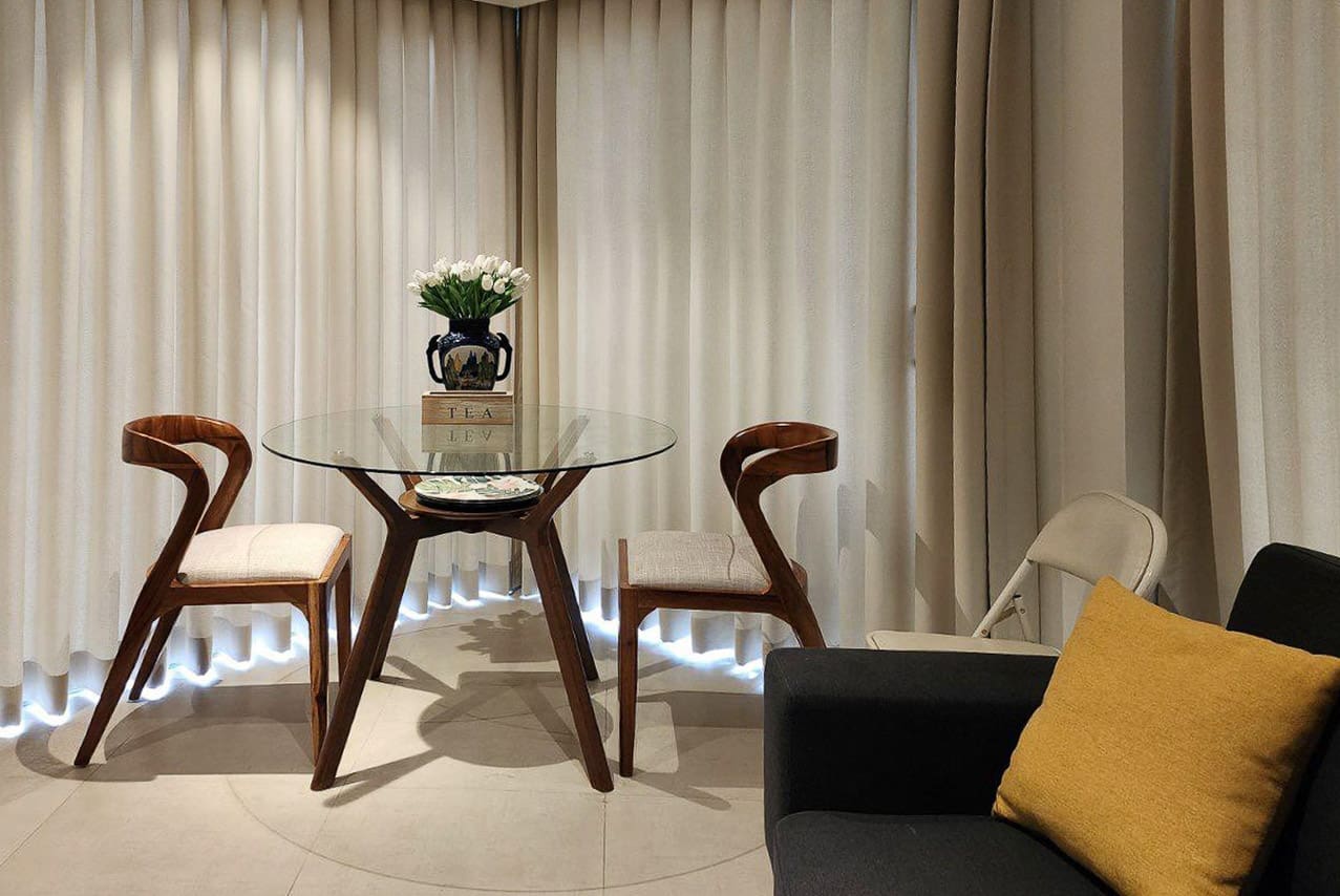 Step into an open-concept living area with light-filled interiors and calming neutrals that invite relaxation. The stylish furnishing includes a cozy sofa, sleek TV console, and a glass dining table that perfectly complements the airy vibe. The balcony opens to breathtaking seaside views, making every morning coffee or evening wind-down feel like a mini retreat.