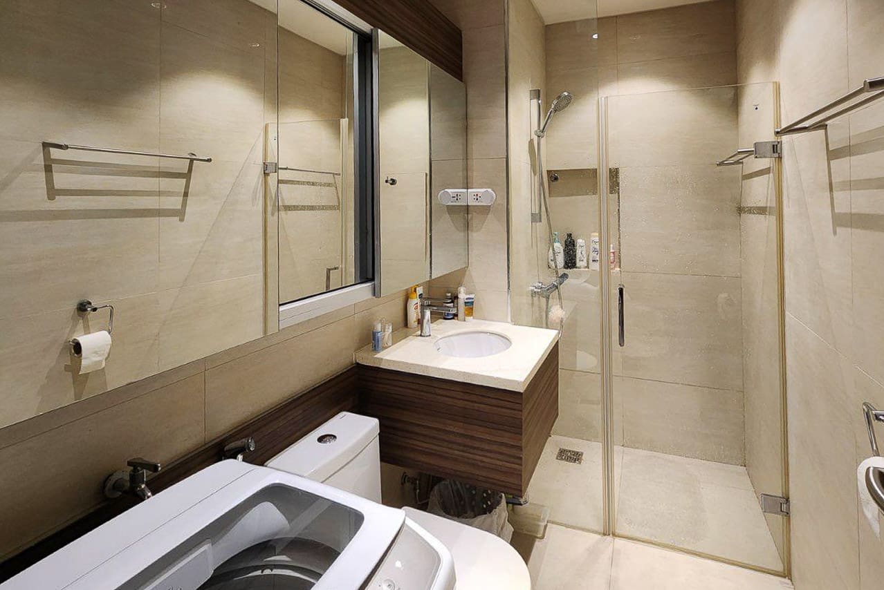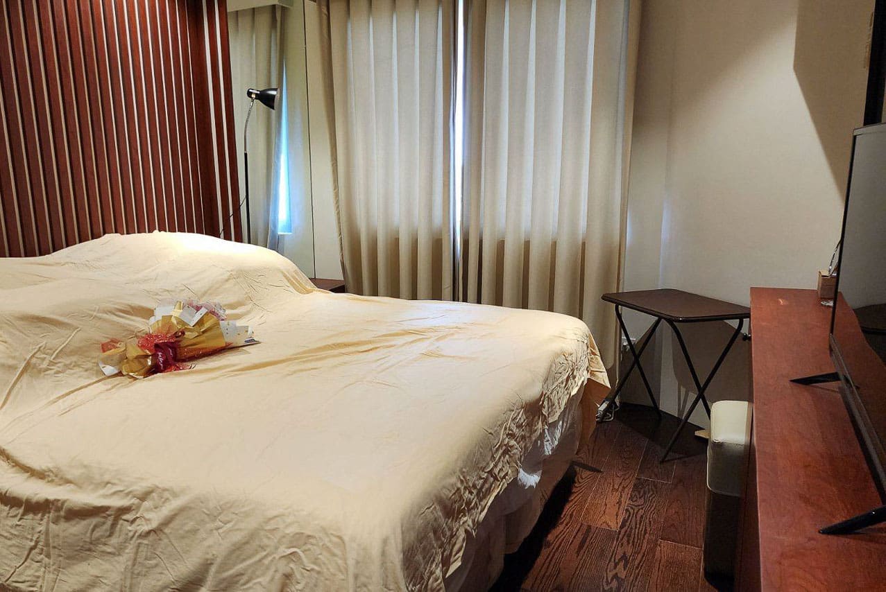 The kitchen is well-equipped with modern cabinetry and essential appliances, perfect for simple cooking or preparing meals with ease. The bedroom is a warm and restful space, fitted with soft linens, a wall-mounted TV, and custom cabinetry for extra storage. A private bathroom, complete with a clean walk-in shower and washer, adds to your everyday convenience.