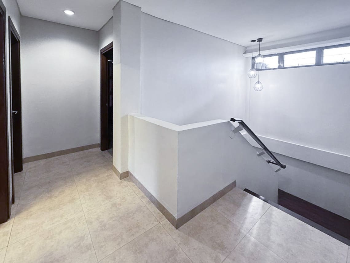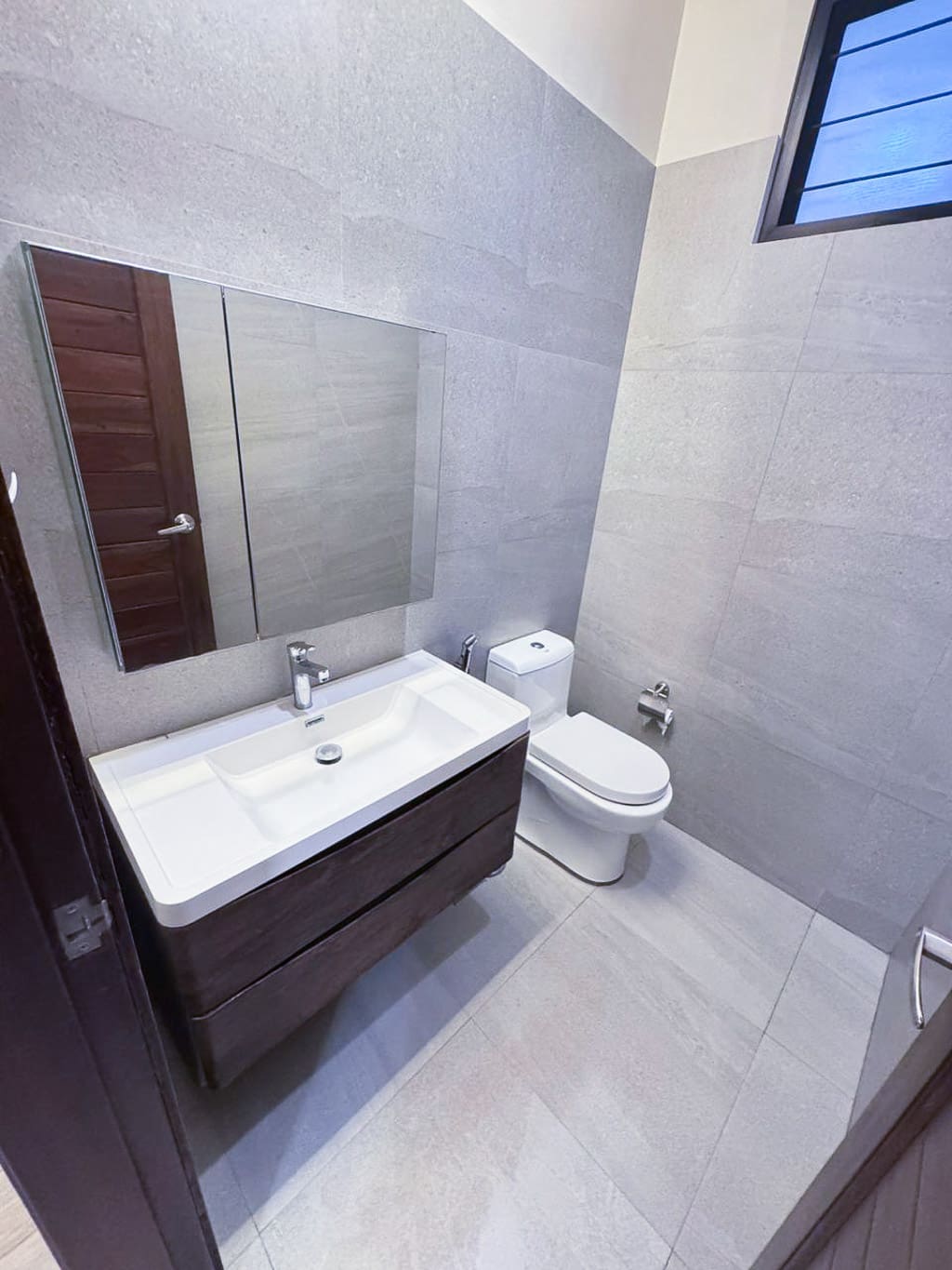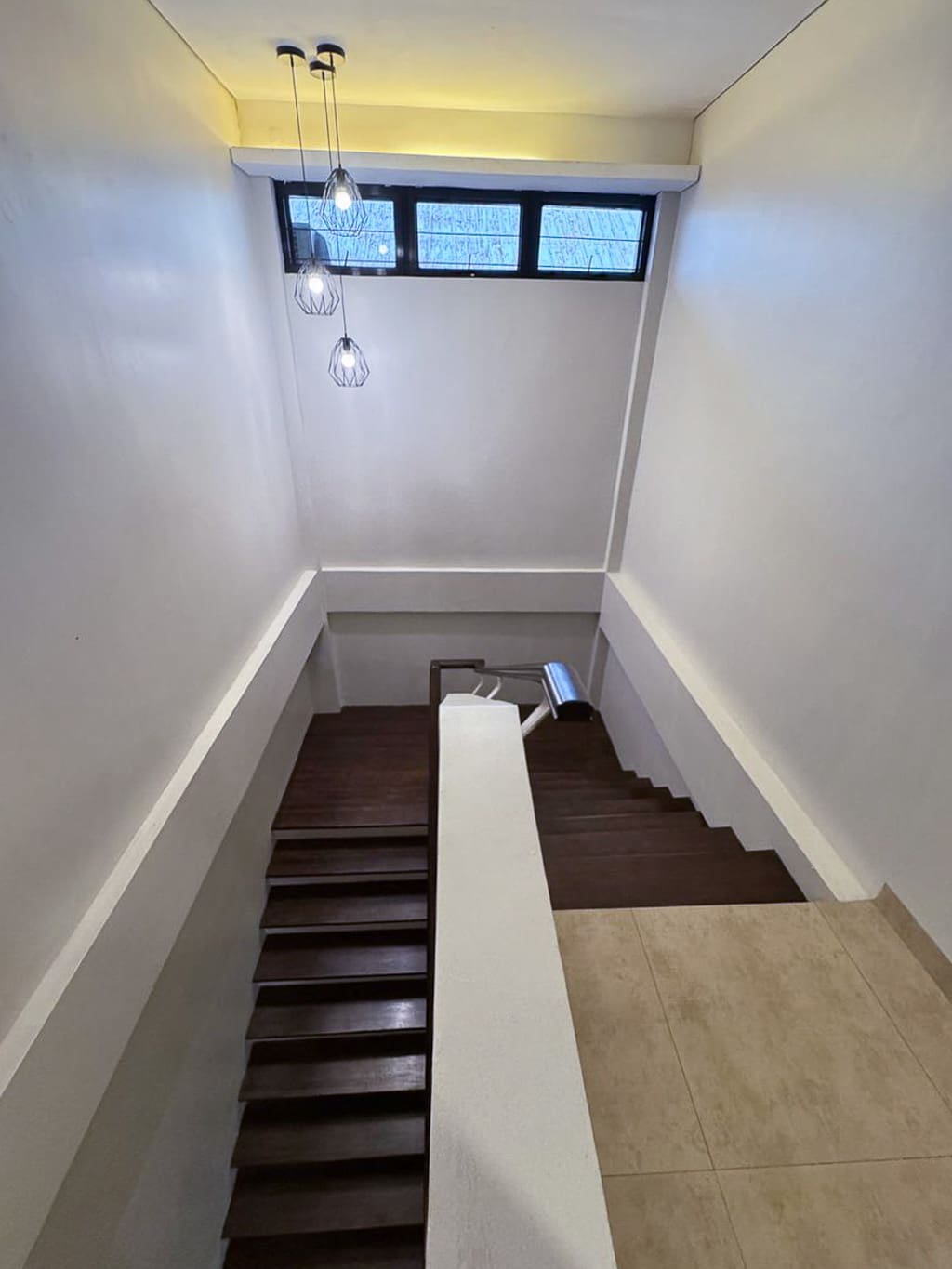 The bathrooms are just as inviting, featuring modern fixtures, wall-mounted vanities, and refined finishes — a quiet sanctuary for self-care. Meanwhile, the wooden staircase lit by pendant lights leads to upper levels with grace and style, offering a touch of visual elegance in the core of the home.
