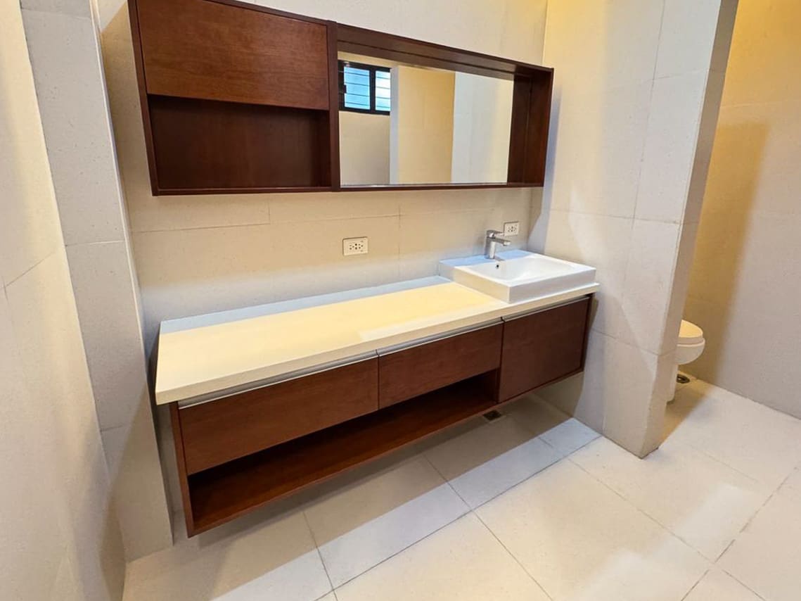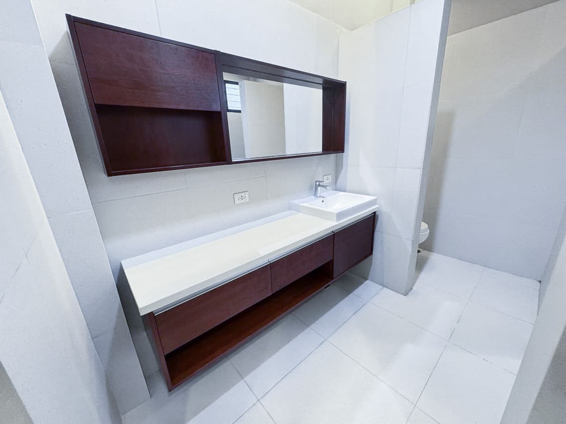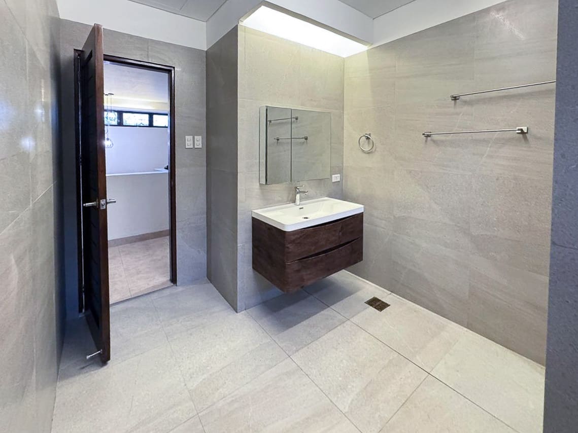 The bathrooms are just as inviting, featuring modern fixtures, wall-mounted vanities, and refined finishes — a quiet sanctuary for self-care. Meanwhile, the wooden staircase lit by pendant lights leads to upper levels with grace and style, offering a touch of visual elegance in the core of the home.