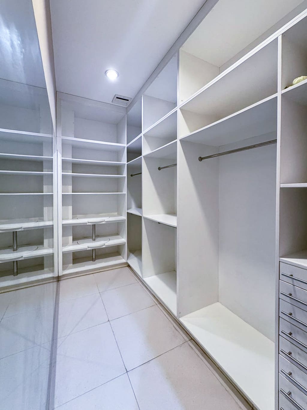 • Two bathrooms: one with long vanity and mirror, the other with shower and minimalist fixtures