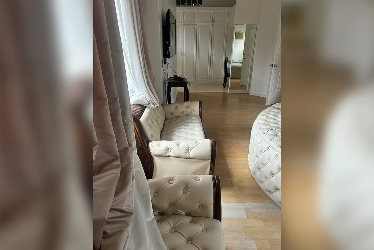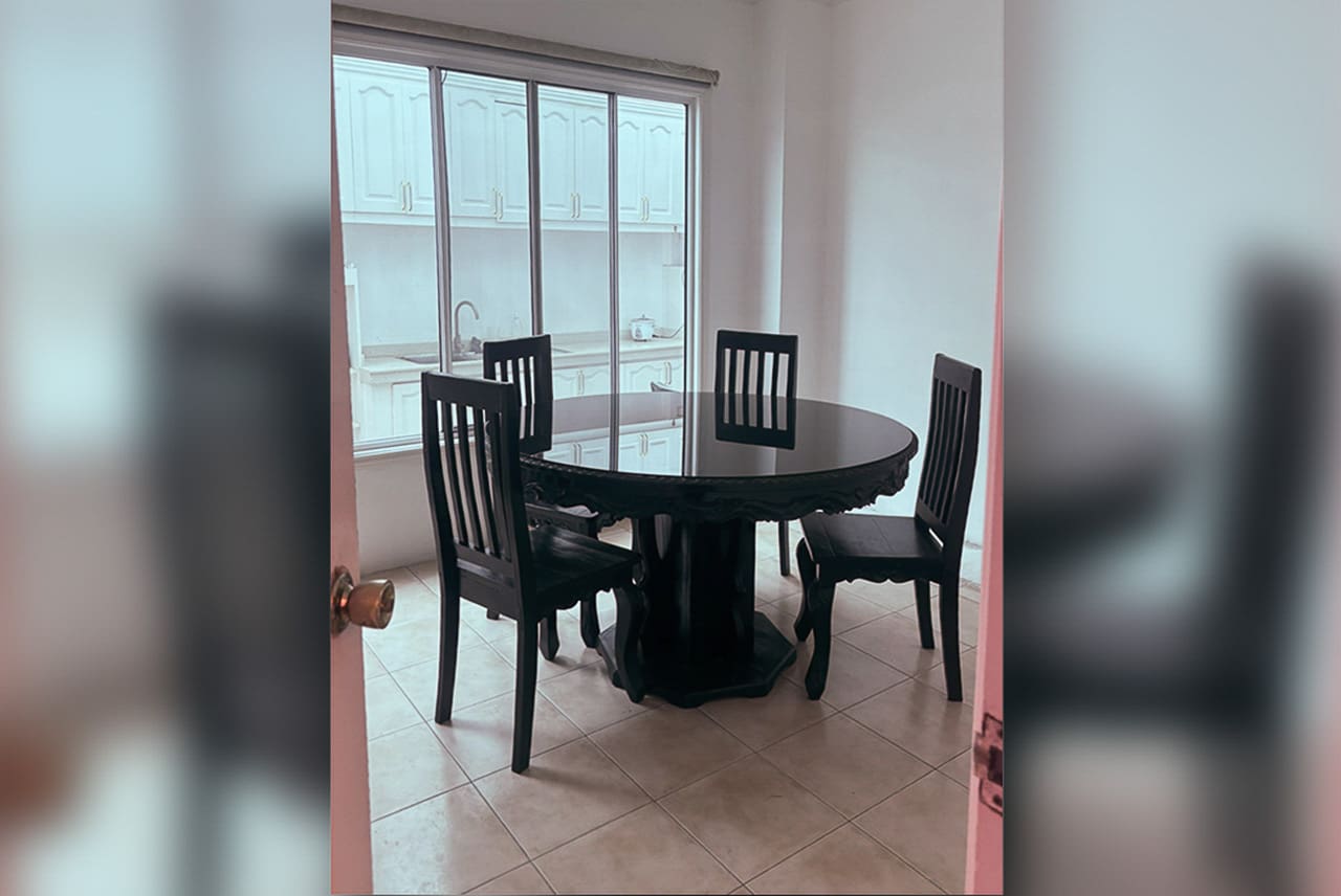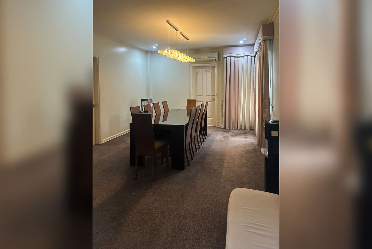 The spacious living room invites you to relax with its plush leather seating, ambient lighting, and entertainment-ready setup. Just a few steps away is the formal dining area, ideal for gatherings or quiet meals. The fully equipped kitchen, located beside a cozy breakfast nook, offers a practical yet stylish space for culinary creativity.