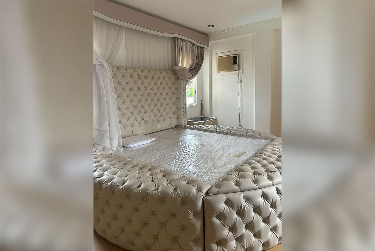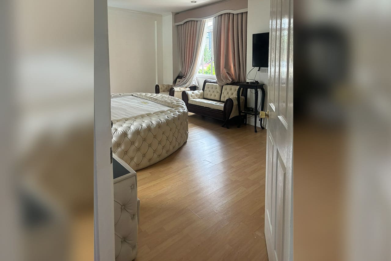 Upstairs, the bedrooms are thoughtfully designed for both relaxation and utility. The master suite features a luxurious round bed, rich wood flooring, and a private sitting area. Secondary rooms are bright, welcoming, and perfect for guests or family members. The bathrooms are clean, modern, and finished with neutral tiles and natural light.